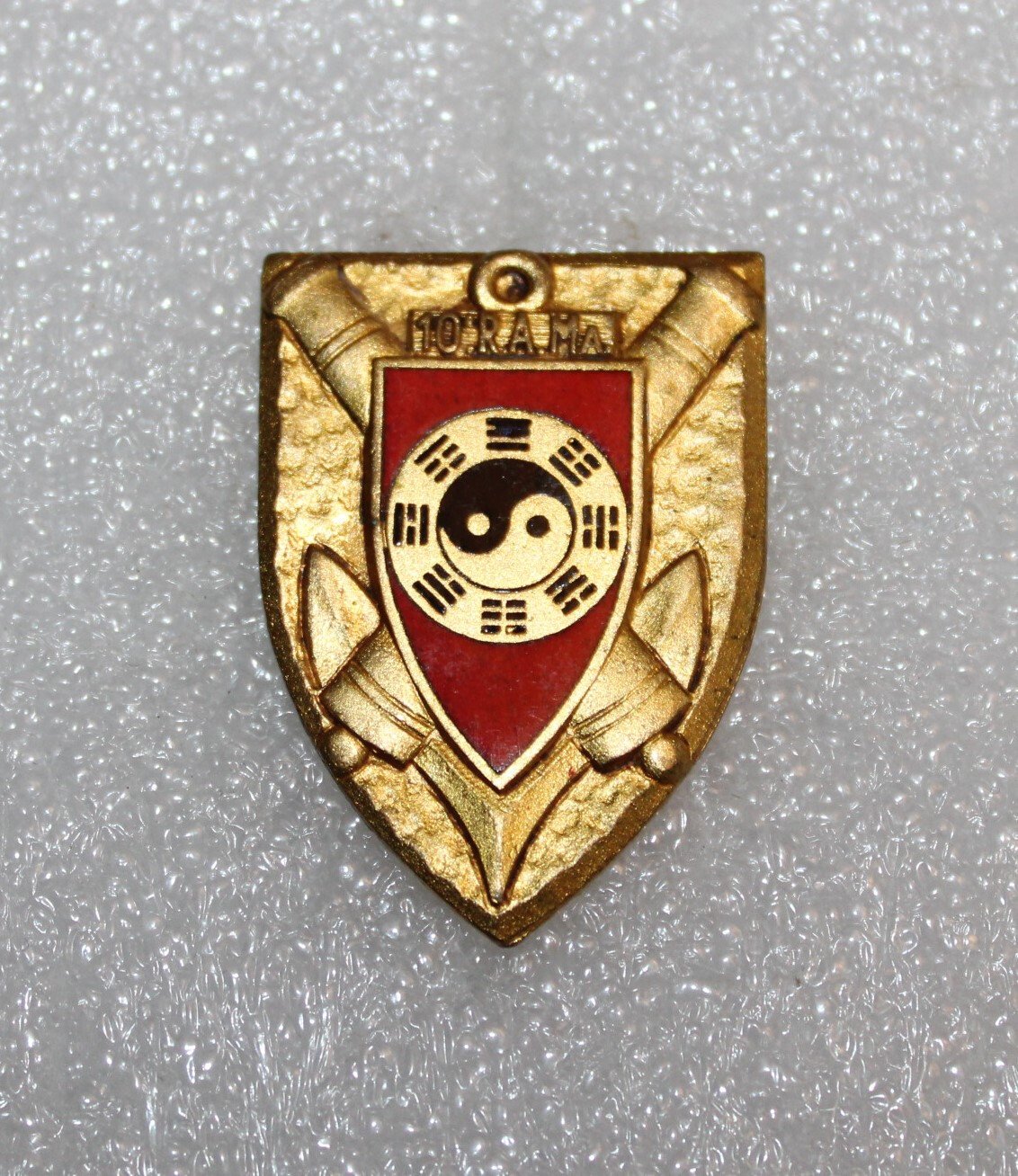 Insigne du 10e régiment d'artillerie de marine, fabrication Drago Paris Dos guilloché. H385. Créé le 1er avril 1919 comme 10e RALHC (régiment d'artillerie lourde hippomobile coloniale). Ses quatre groupes tiennent garnison à Toulon, Marseille, Saint-Raphaël et Nîmes .