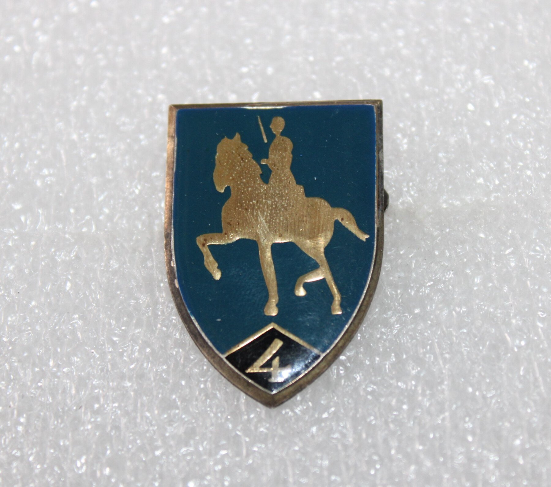 Insigne du 1er escadron du 4e régiment de cuirassiers. Il est de fabrication allemande de la maison Mayer. Son dos est granuleux et argenté. Son attache est réalisée par une épingle à bascule. La couleur est bleu roi.