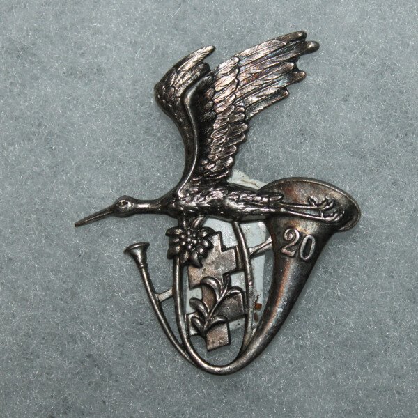 L'insigne représente un cor de chasse vu de trois quarts et portant le No20. Une cigogne plane au-dessus du cor rappelant que le 20e est entré en Alsace un des premiers en 1914 et qu'il y retourna en 1918. Le cor entoure une croix de Lorraine ; le bataillon tenait garnison à Baccarat avant la guerre, puis à Forbach avant d'être envoyé à Antibes. Il compta longtemps beaucoup de Lorrains et de Vosgiens dans ses rangs. L'Edelweiss passée dans la croix de Lorraine quand le corps a été transformé en corps alpin.