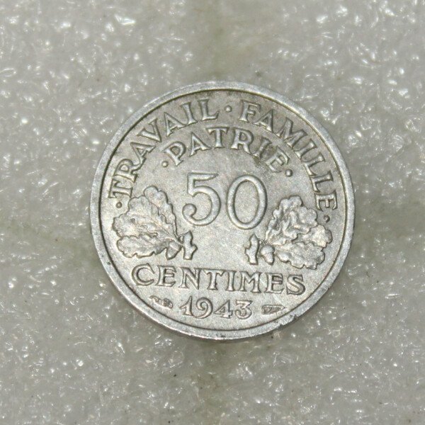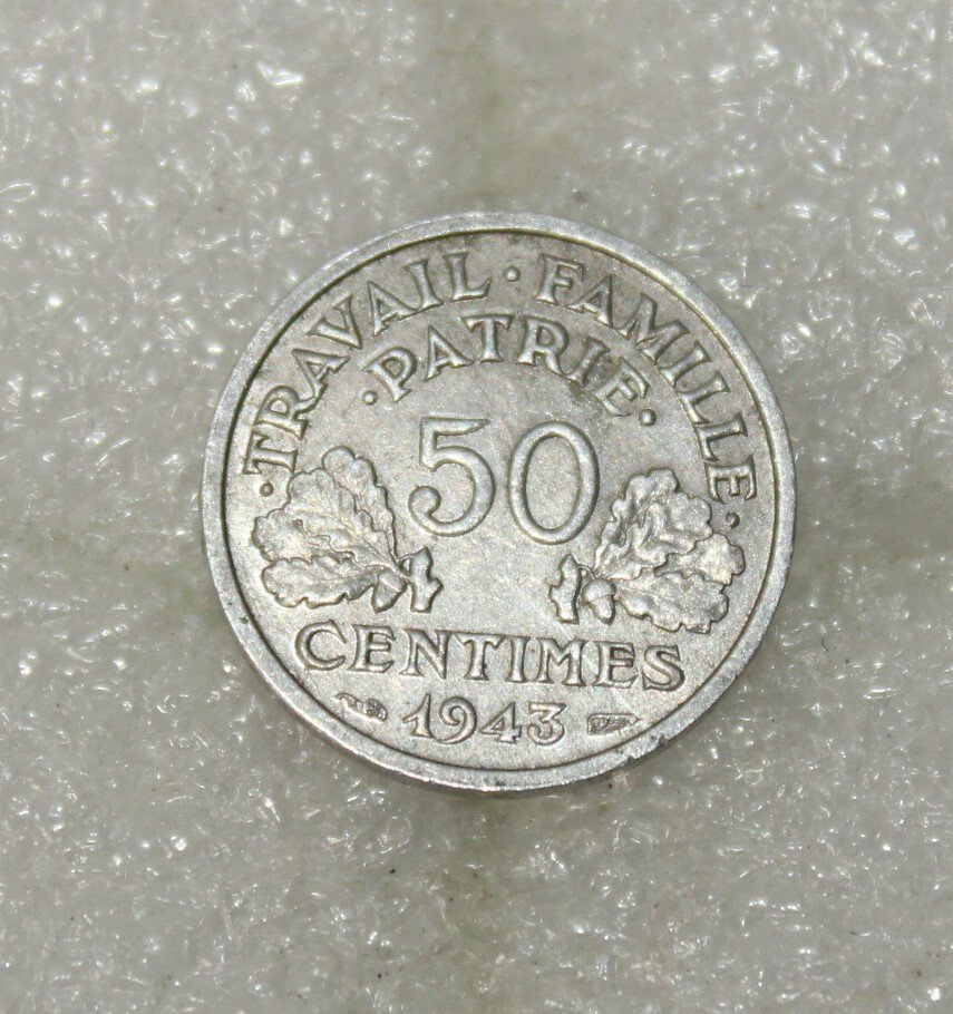 Pièces de 50 centimes de l'états Français sous vichy fabrication de 1943 en alu léger. Bel état.