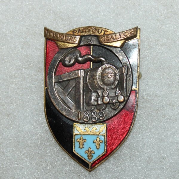 Insigne du 5° Régiment du Génie, fabrication émaillée de la maison Arthus Bertrand. écu rouge et noir avec rondache à une locomotive franchissant un pont métallique armes de Versailles en pointe.