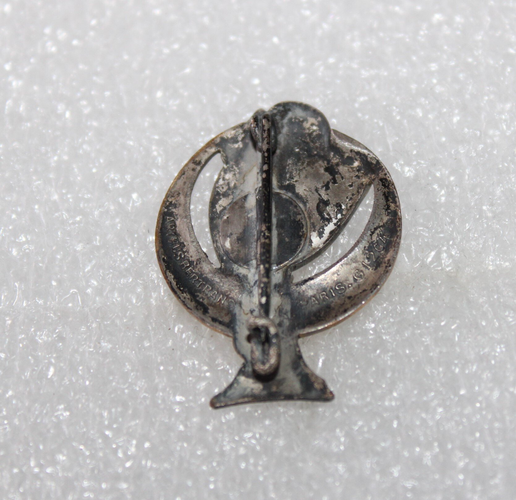 Insigne du 5e régiment de spahis Algériens de fabrication Arthus Bertrand Paris, chiffre 5 sur une étrivière soutenant un écu bleu aux 3 fleurs de lys, inscrit dans un croissant .