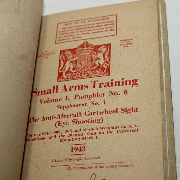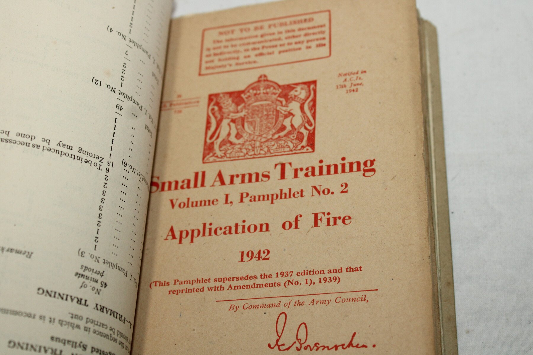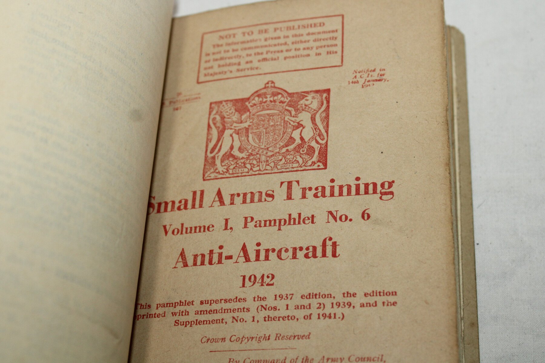 Reliure de 6 manuels d’instruction small arms training, contenant le Pamphlet N°1, N°2, N°6, N°6 supplément, N°18 et supplément N°18 de 1940, 1942 et 1943.
