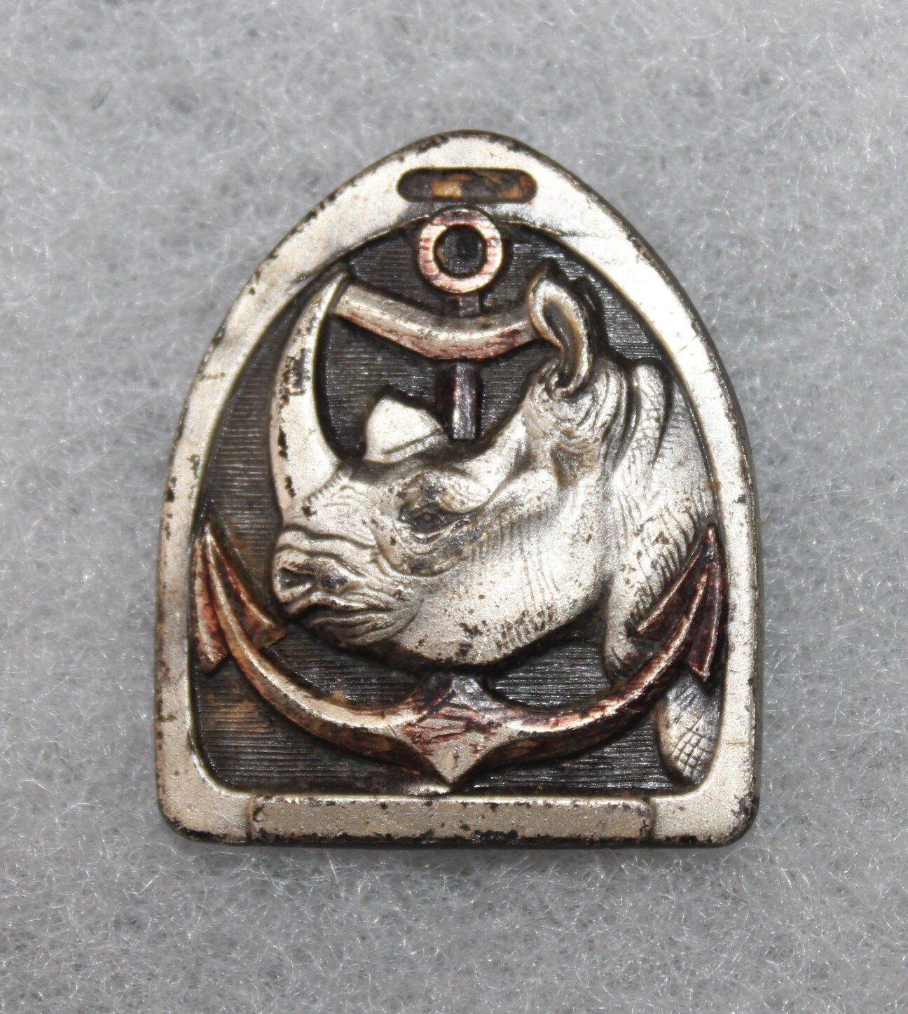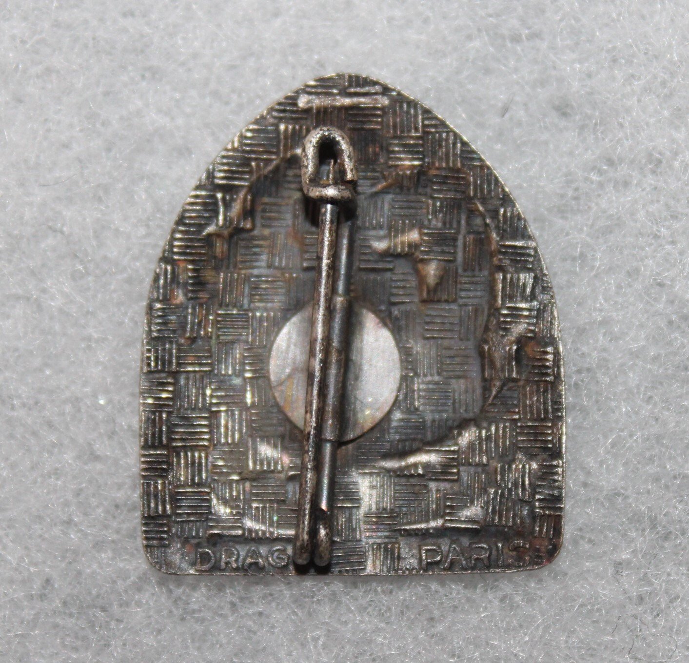 Insigne du 8éme Régiment de Chasseur d'Afrique, fabrication Drago Paris. Etrier à une ancre brochée d’une tête de rhinocéros, 500 exemplaires retiré pour la remise de la fourragère du 8° RCA au 8° Chasseur au Quartier de BRACK à Olivet par le Général WOIZARD Arsène, Inspecteur de l’A.B.C. .Modèle plein et épingle inversée d'origine.