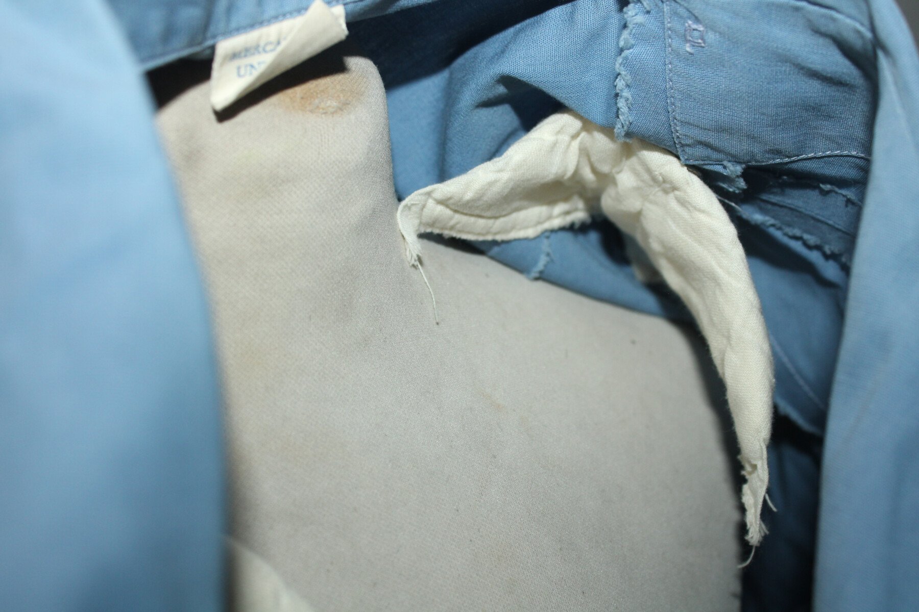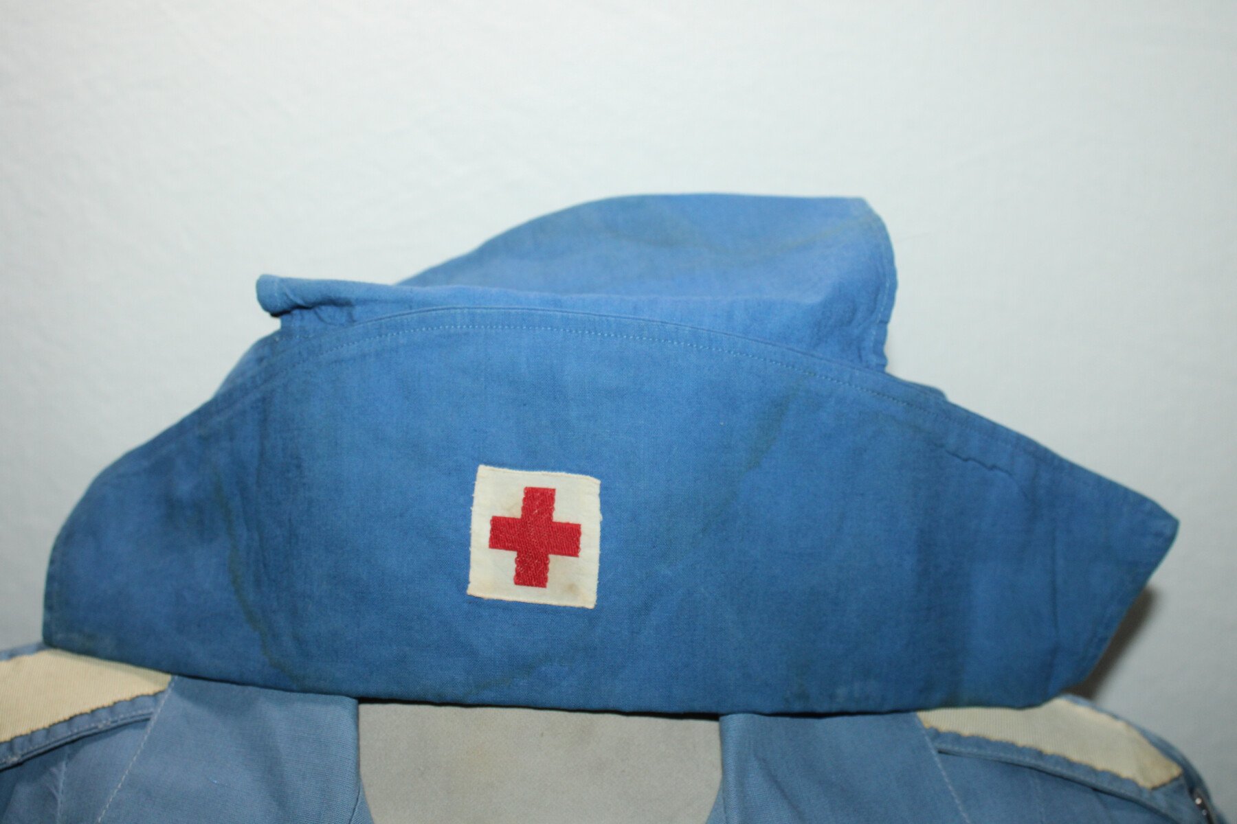 Bel ensemble d'une infirmière de l'american red cross, composé d'une tenue de service avec ses insignes et sa coiffe étiquette de taille us pour femme size 14 ( petite taille), sans défaut et en très bel état, coussinets présents aux épaules, tout les boutons sont présents.