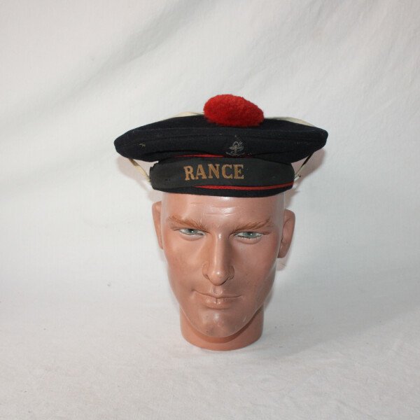 Beau bachi d'un marin du Navire Rance. Taille 56. Cerclage encore présent, ancre en canetille. Matricule présent. Défaut visible sur les photos.