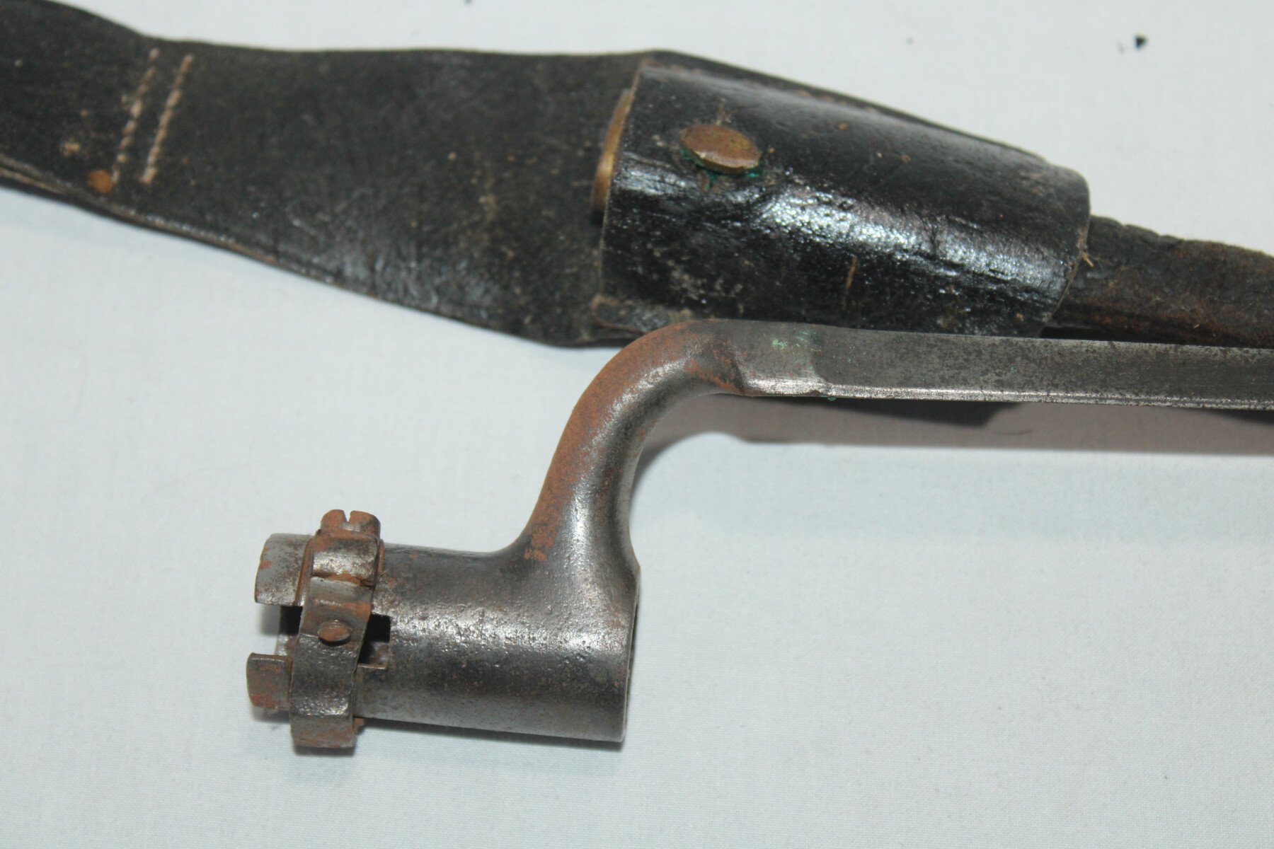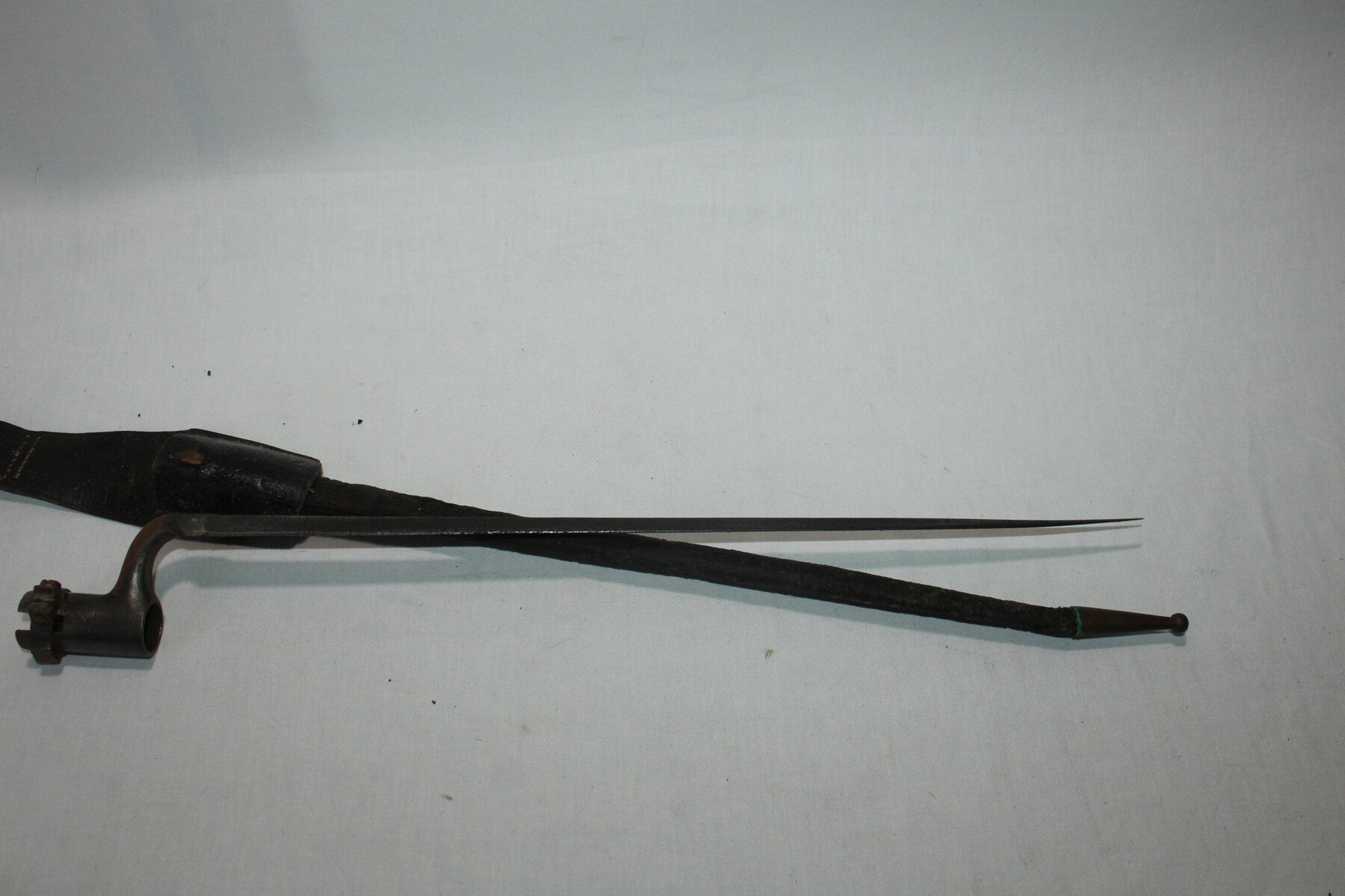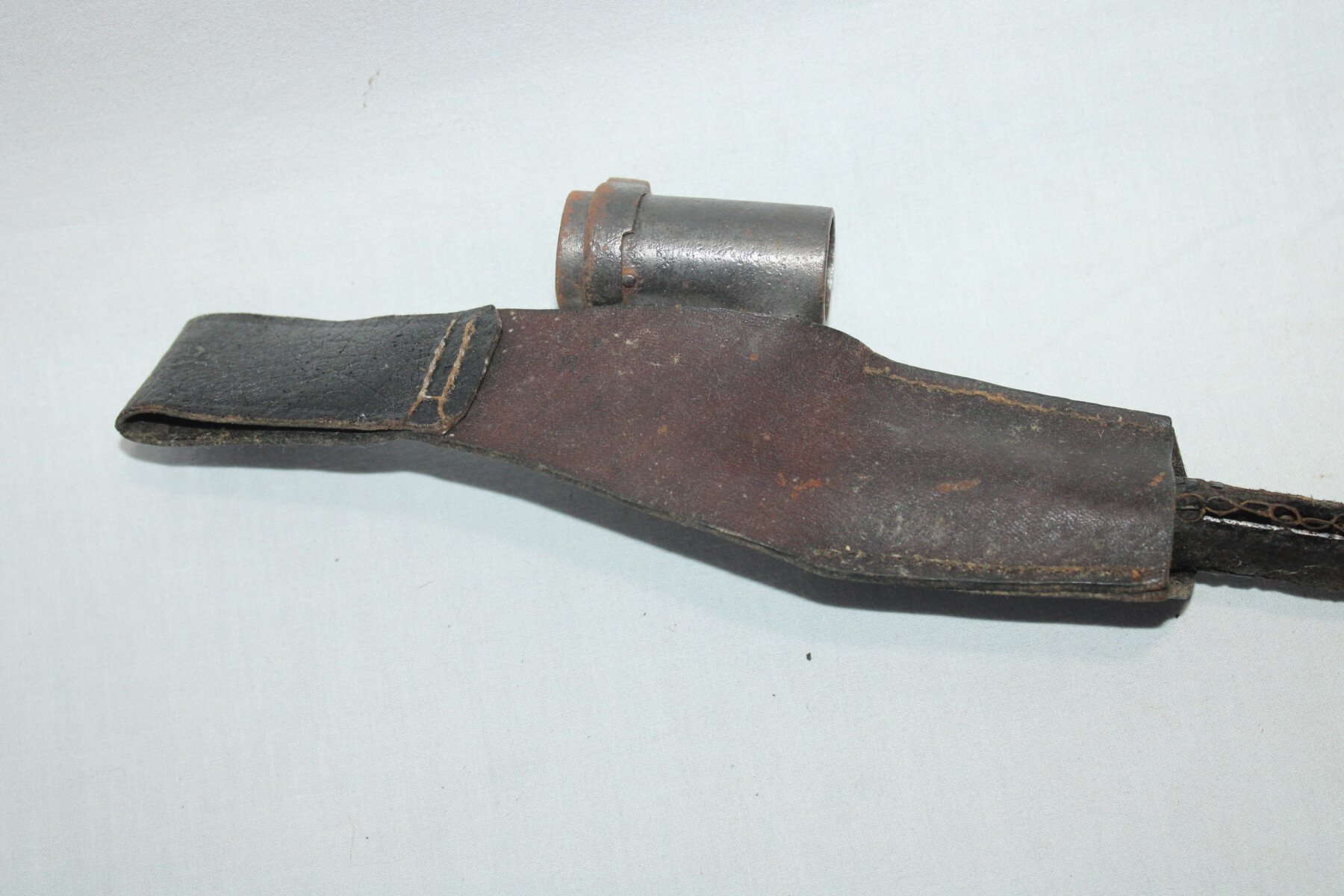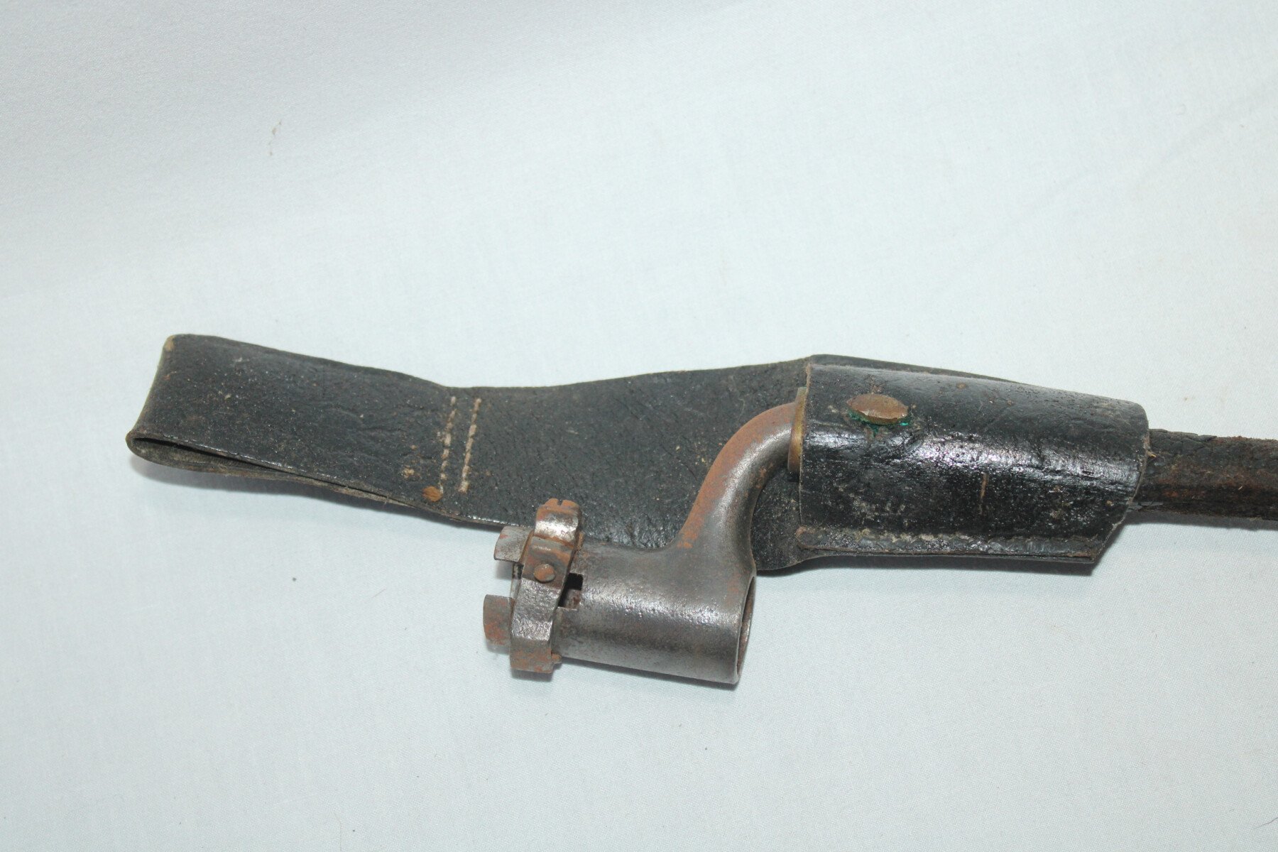 Baïonnette 1822 avec sont gousset. Cuir écaillé et en partie décousu. Baïonnette marqué H et R. Rouille sur la baïonnette.
