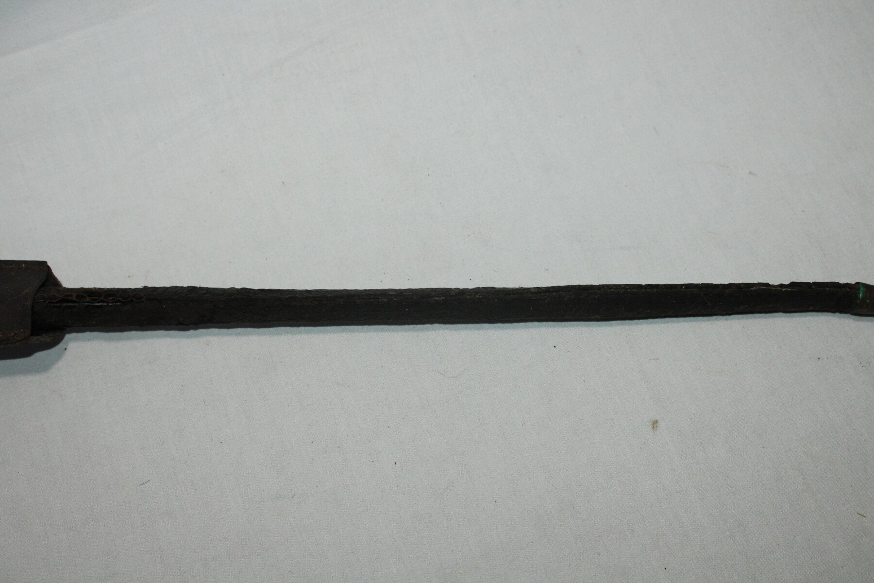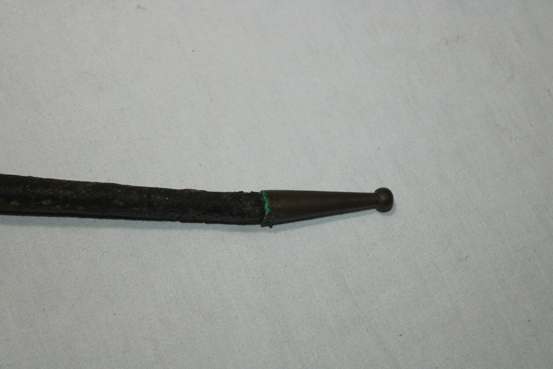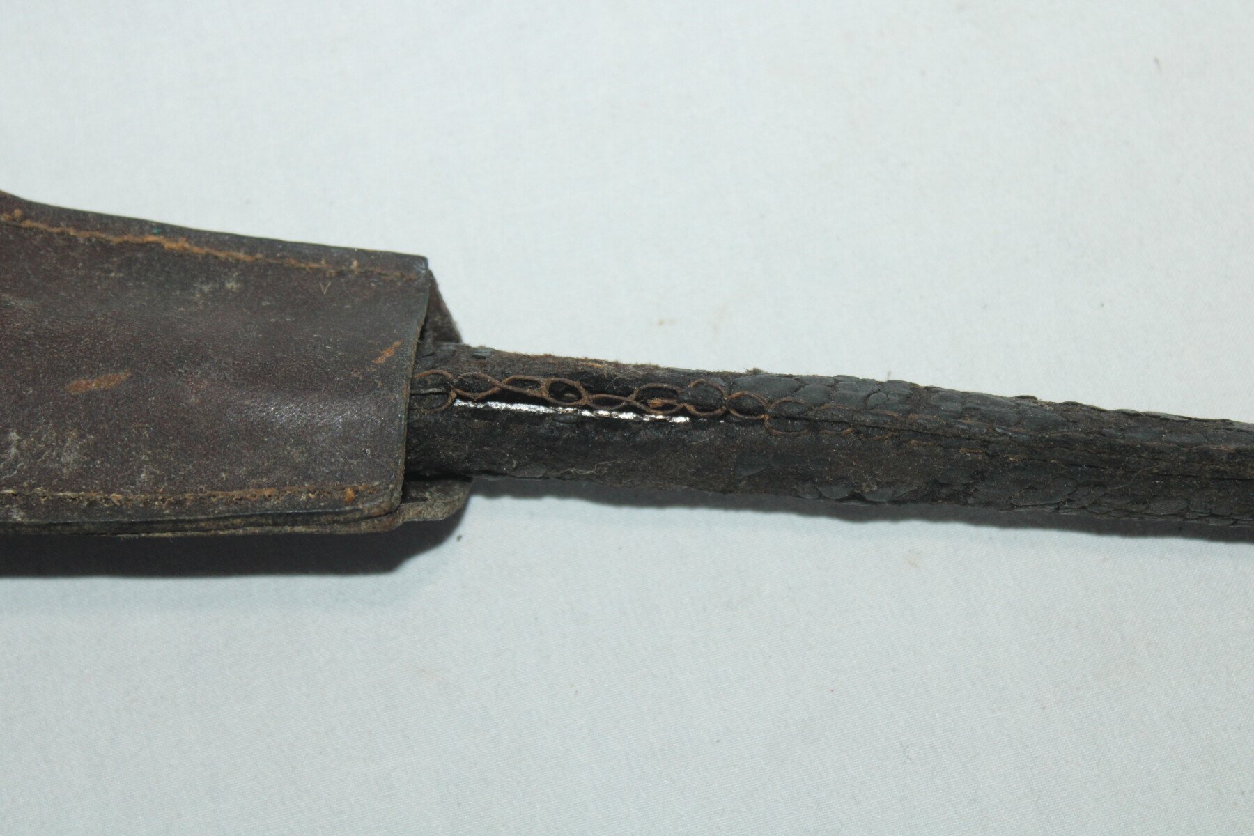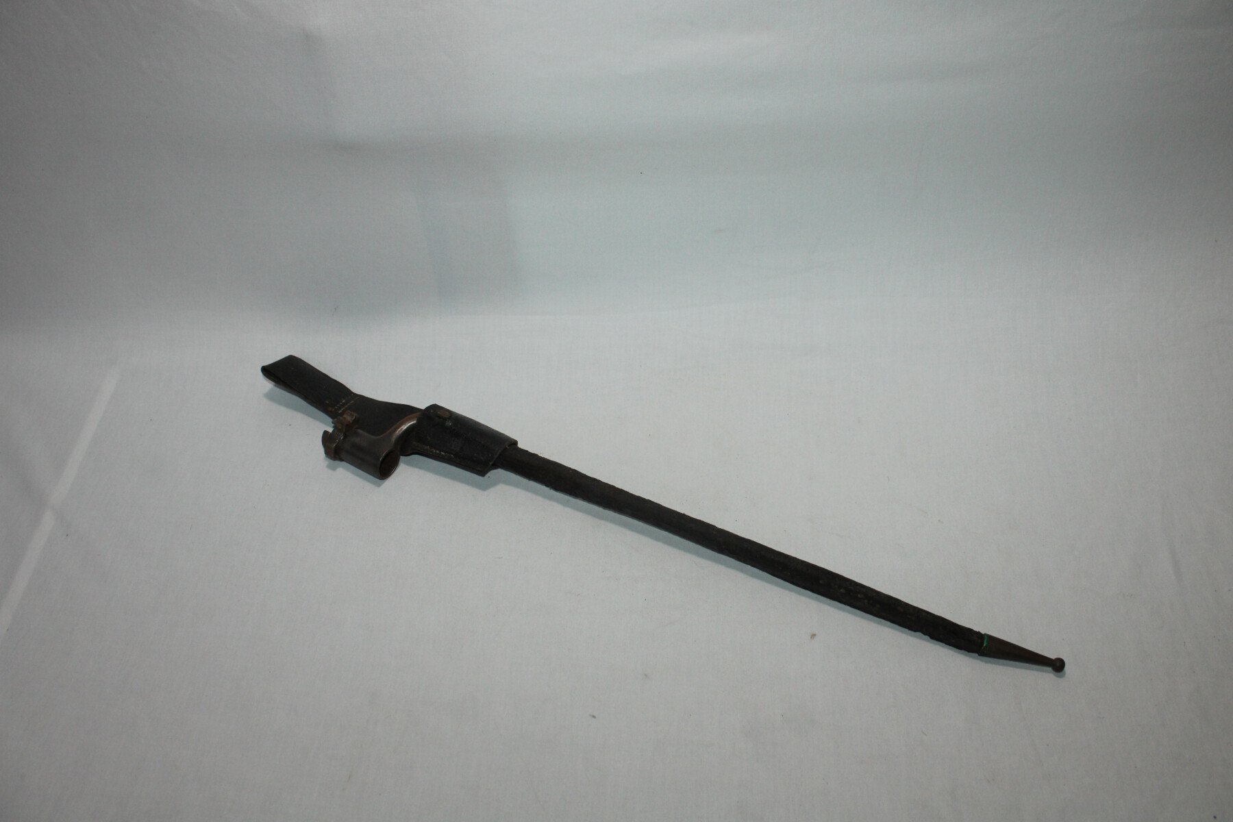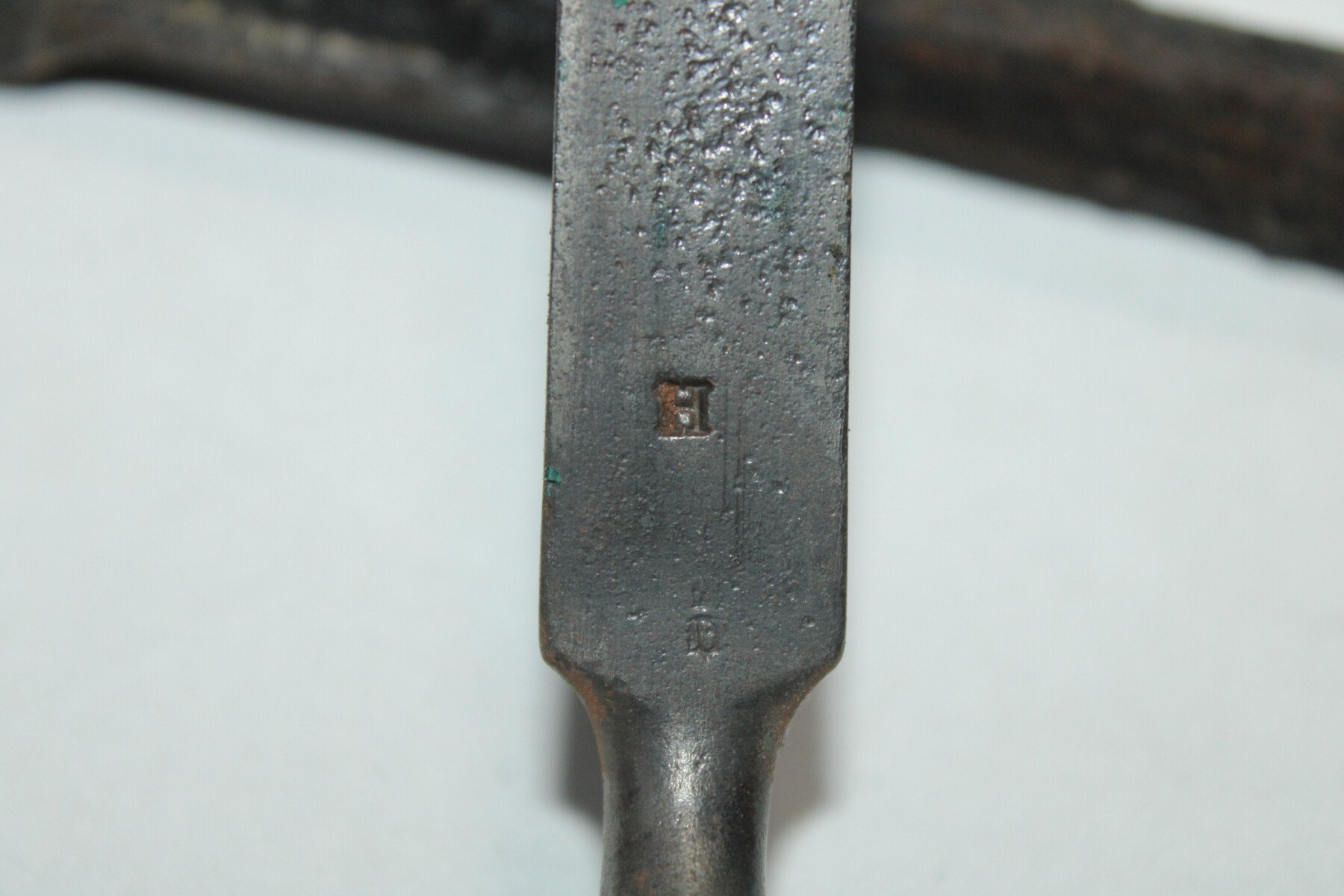 Baïonnette 1822 avec sont gousset. Cuir écaillé et en partie décousu. Baïonnette marqué H et R. Rouille sur la baïonnette.