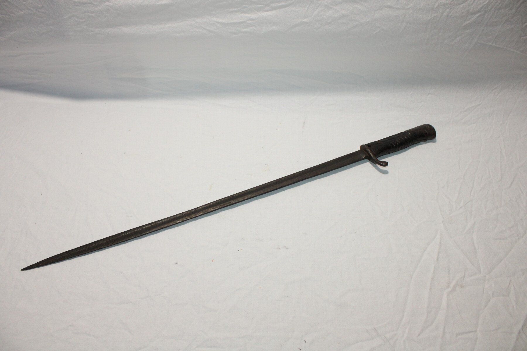 Baïonnette longue pour Gewehr 98, bouton poussoir bloqué, une plaquette en partie cassé. Etat terrain.