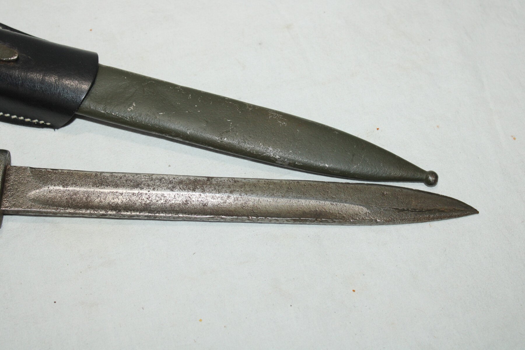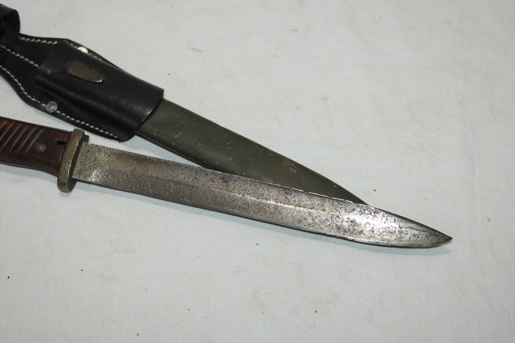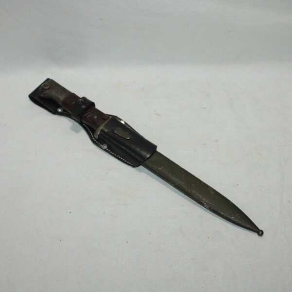 Baïonnette mauser 98k. Partie métallique abimé. Bouton poussoir non fonctionnel. Fourreau peint en feldgrau, gousset en reproduction.
