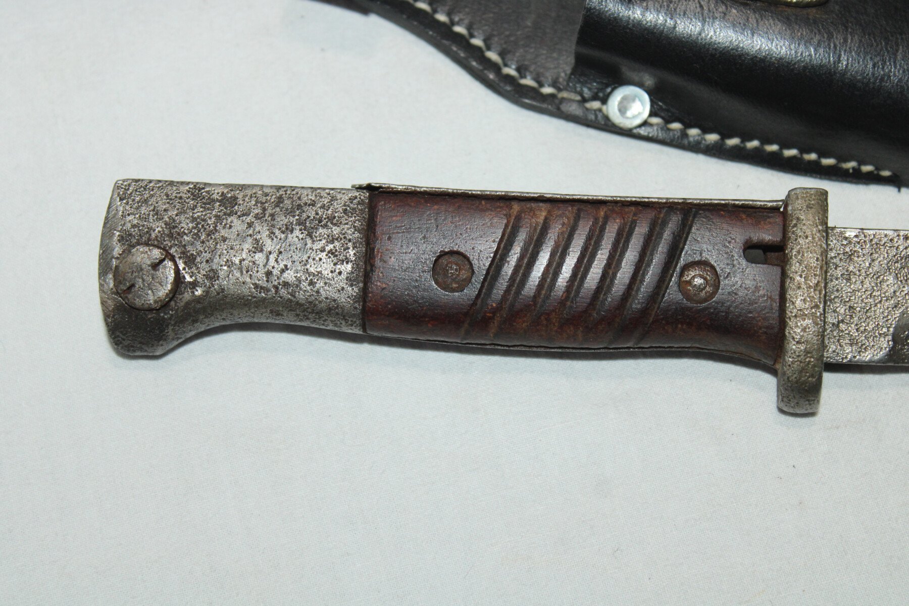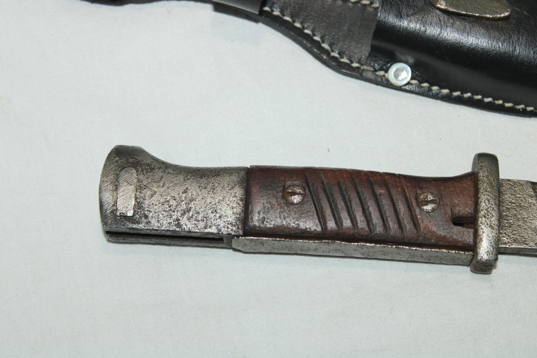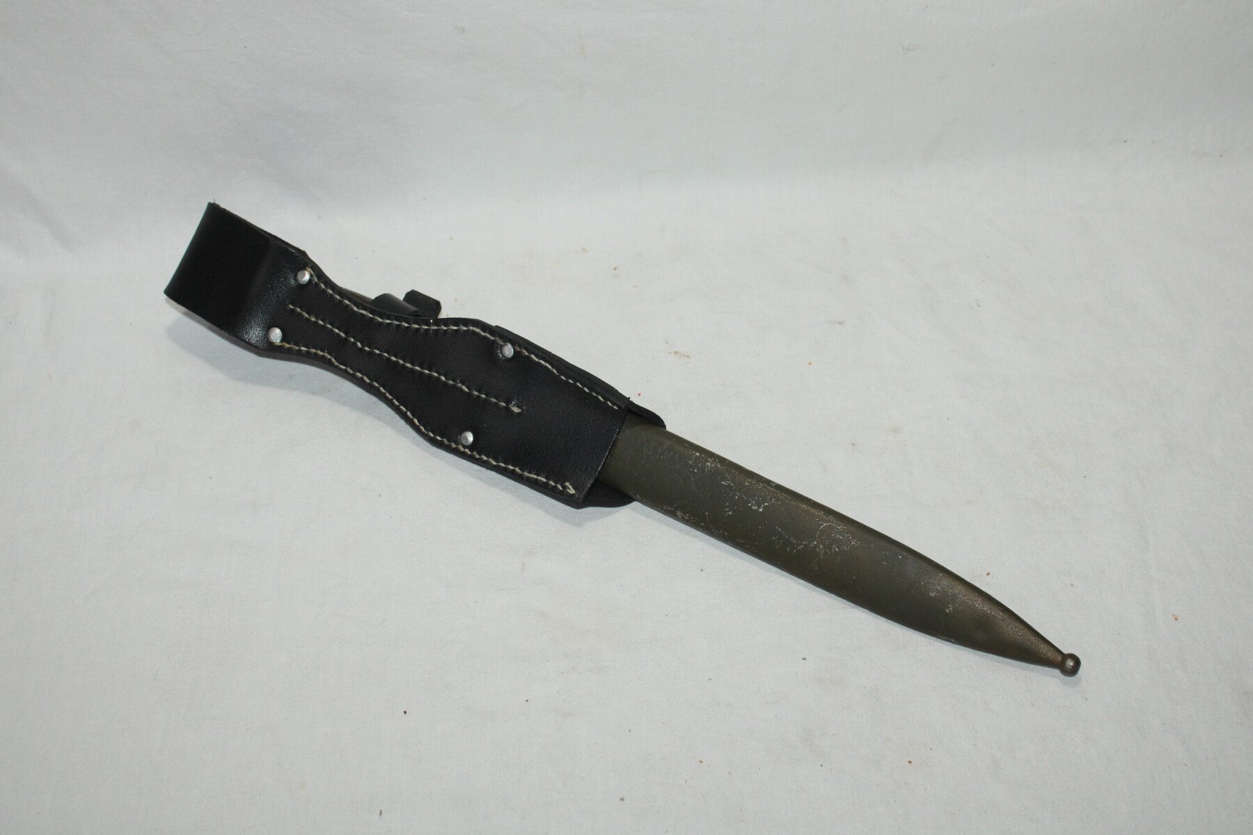 Baïonnette mauser 98k. Partie métallique abimé. Bouton poussoir non fonctionnel. Fourreau peint en feldgrau, gousset en reproduction.