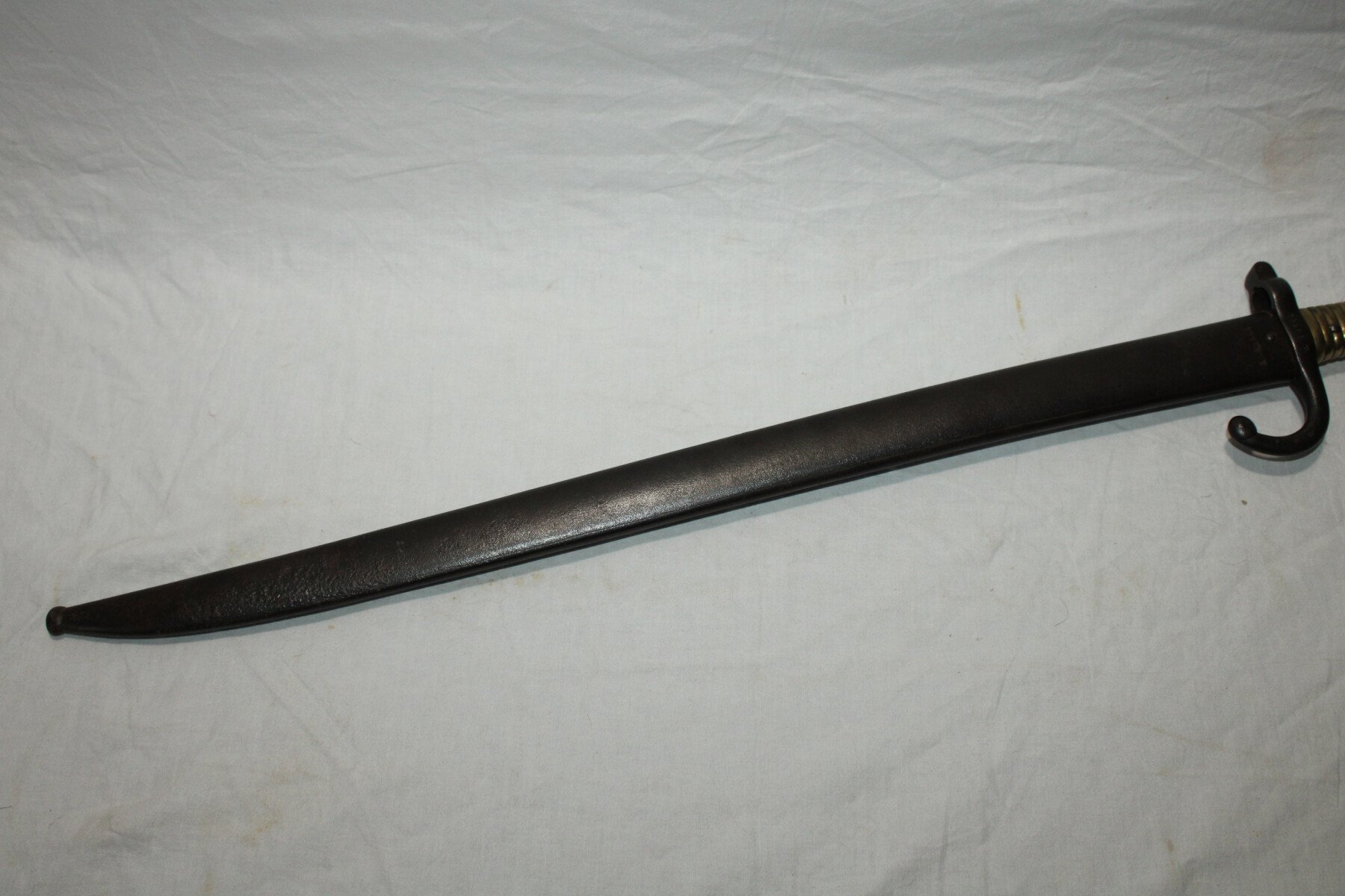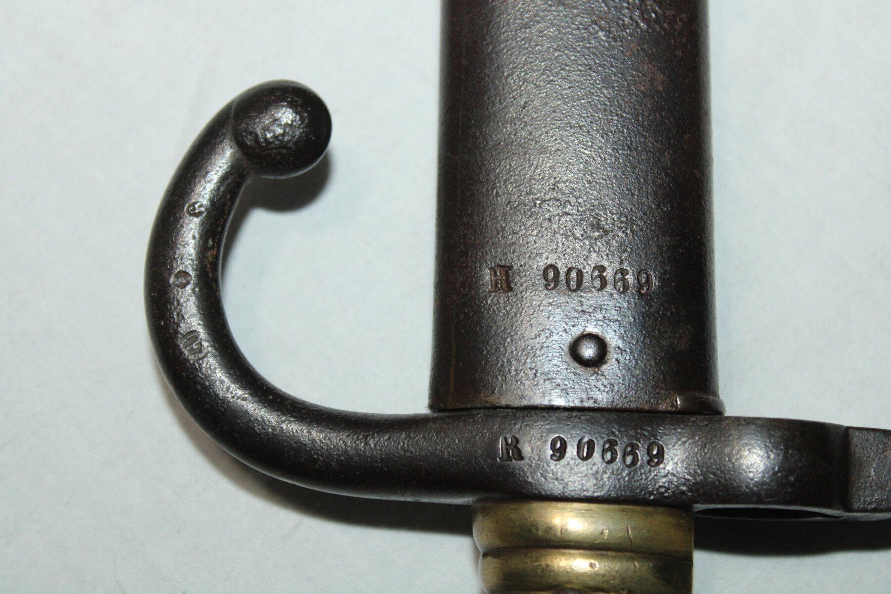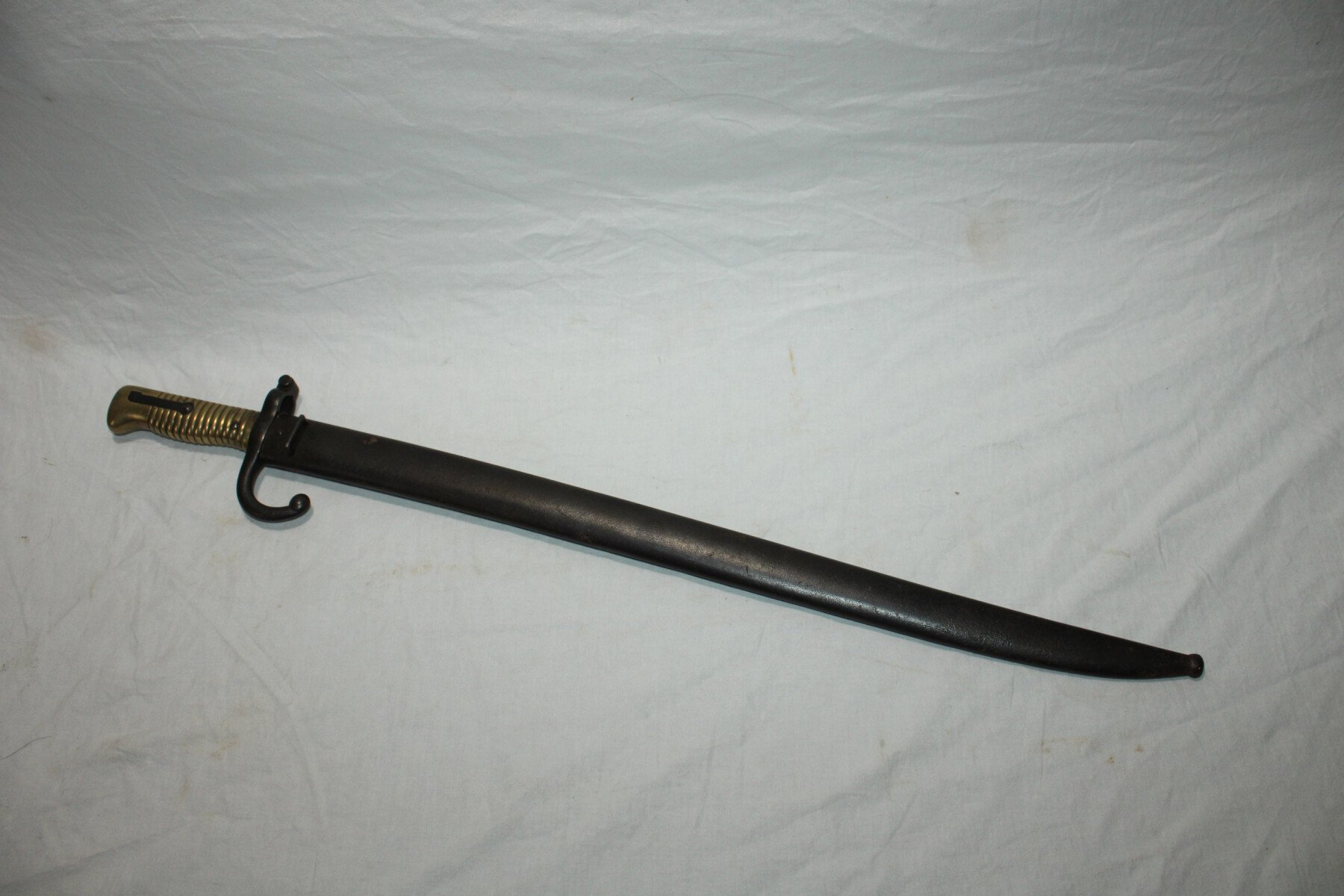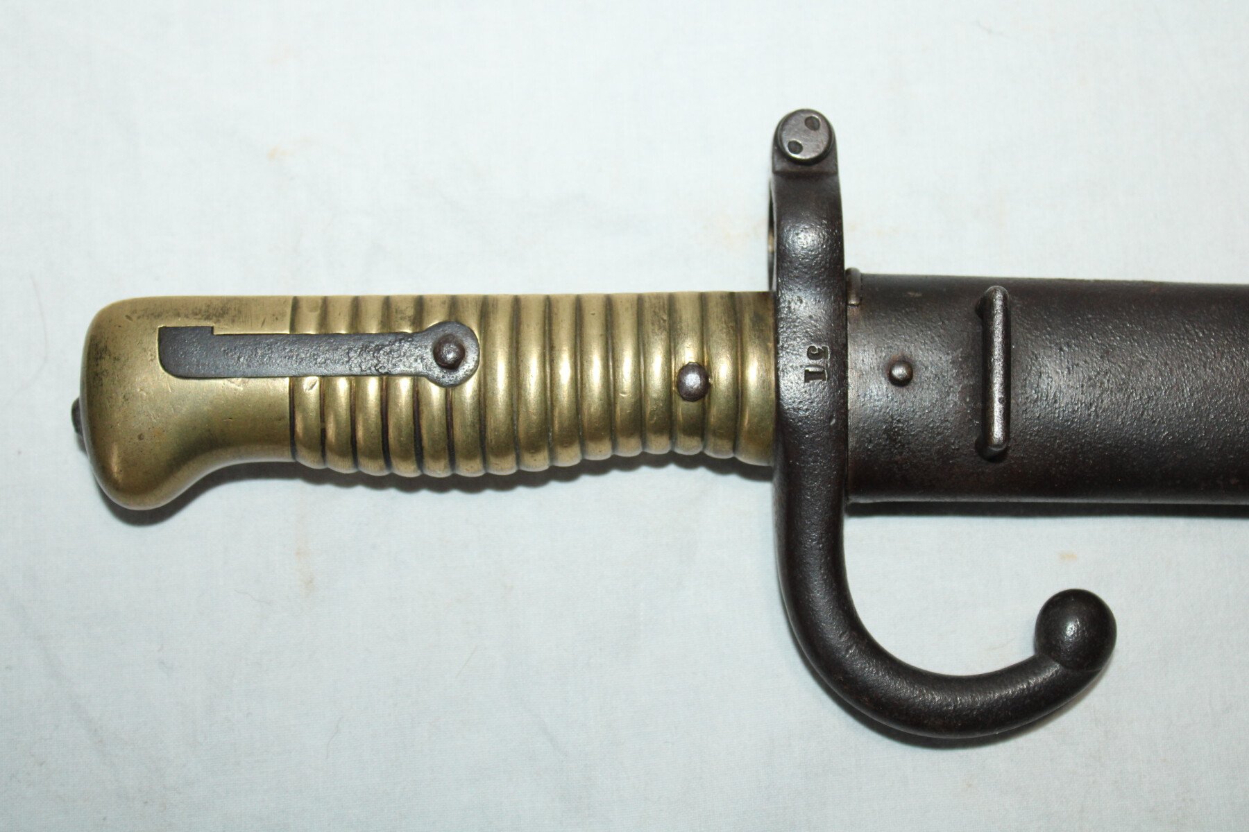 Baïonnette pour Chassepot modèle 1866. Bon état, baïonnette et fourreau au numéro. Lame marqué Châtellerault 1874. Bouton poussoir fonctionnel.