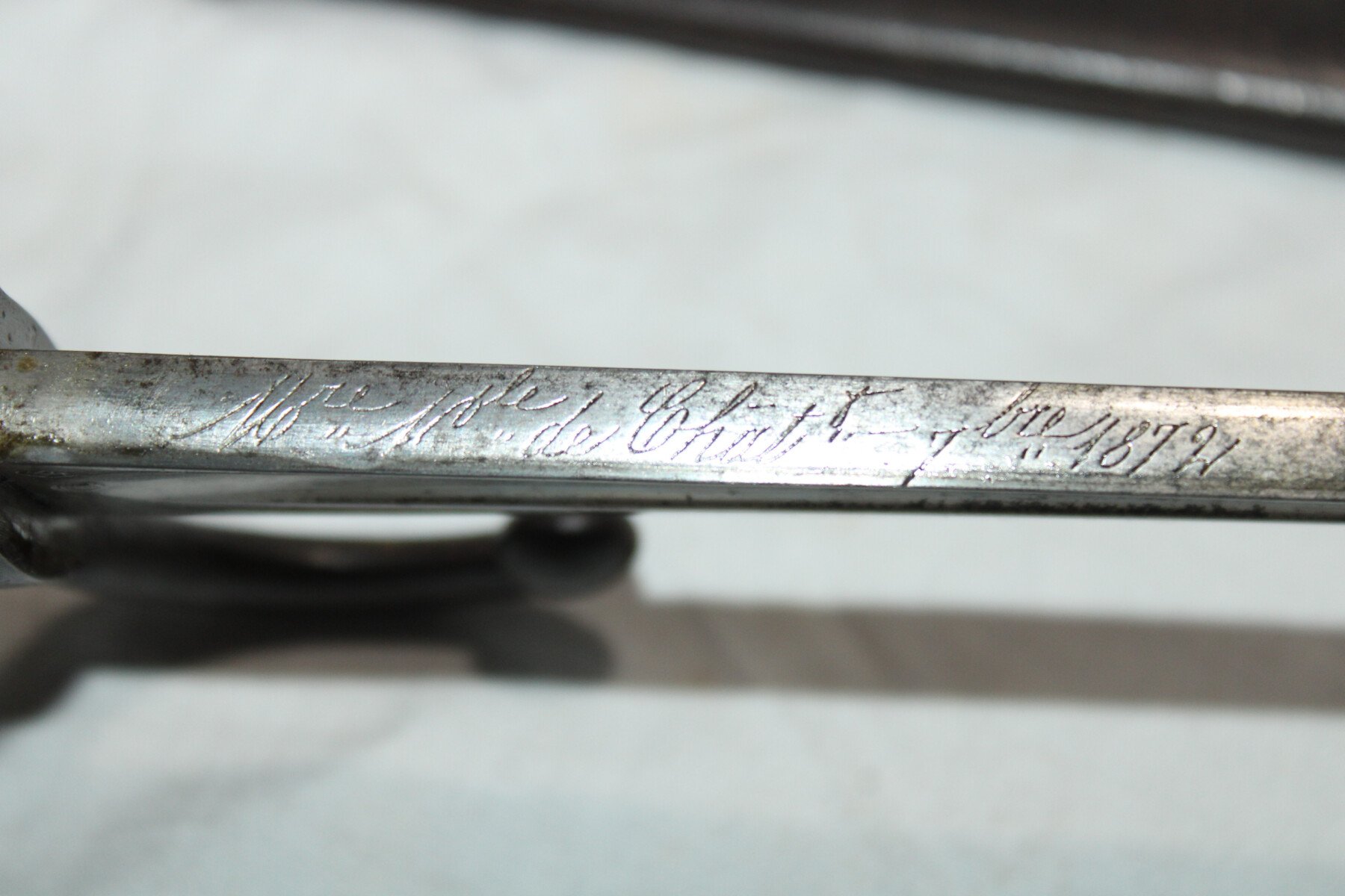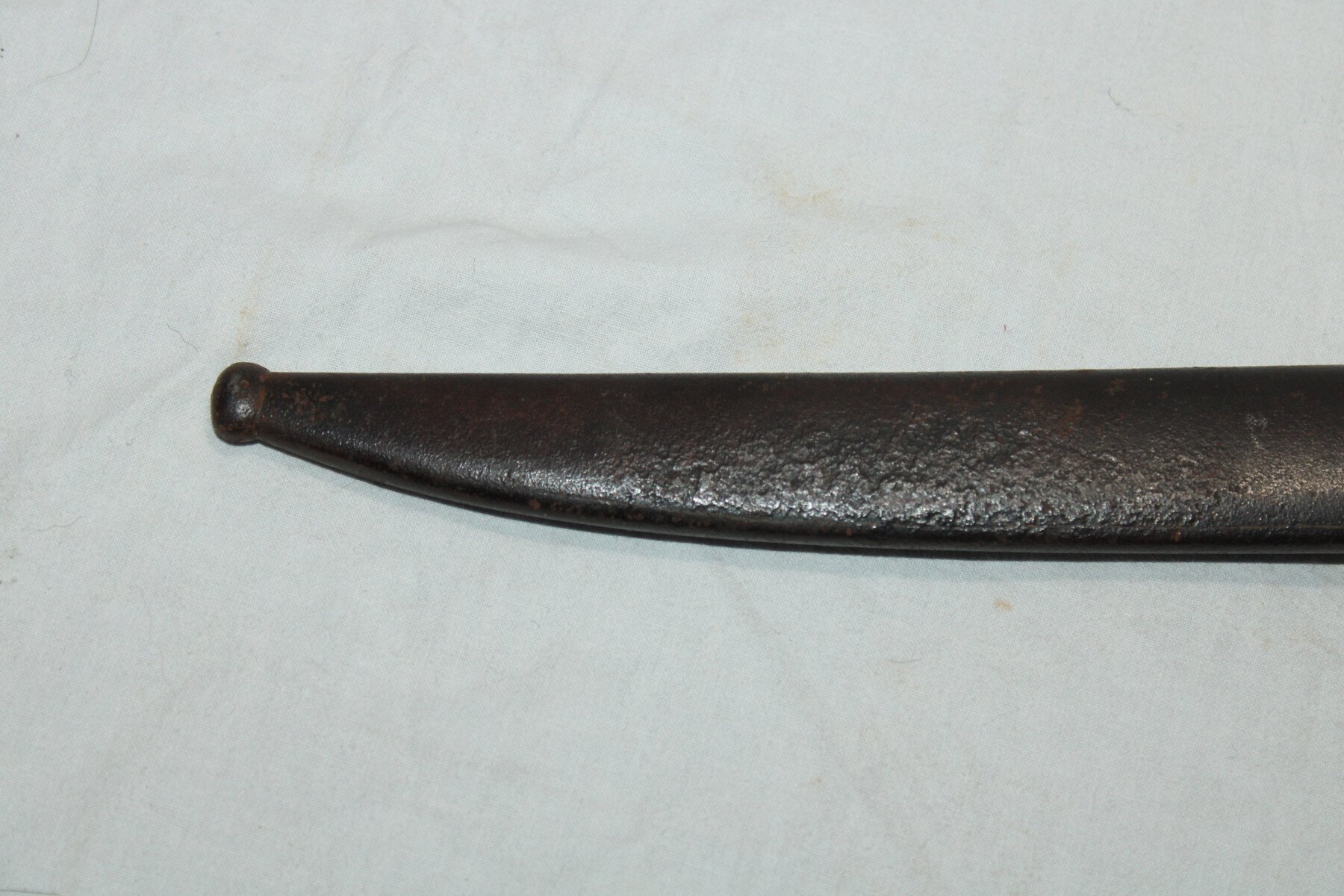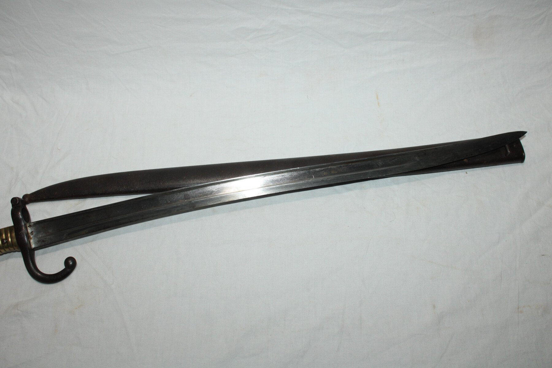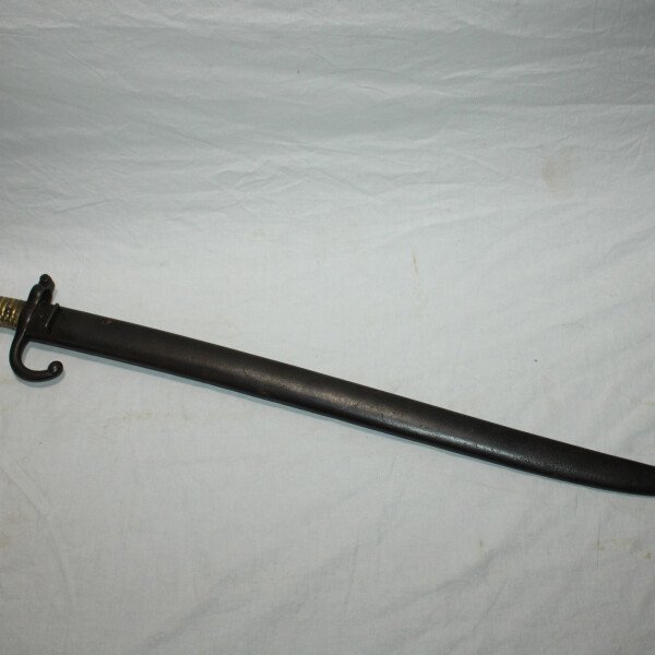 Baïonnette pour Chassepot modèle 1866. Bon état, baïonnette et fourreau au numéro. Lame marqué Châtellerault 1874. Bouton poussoir fonctionnel.