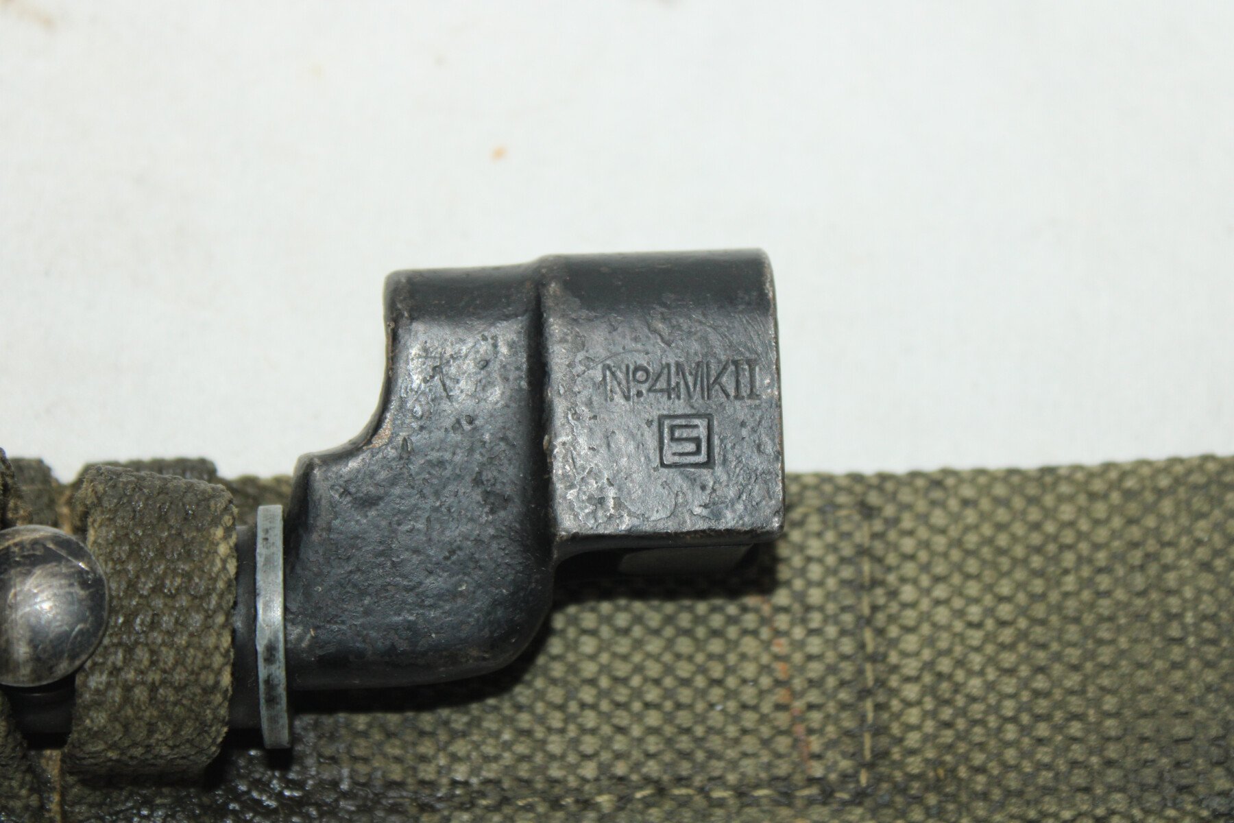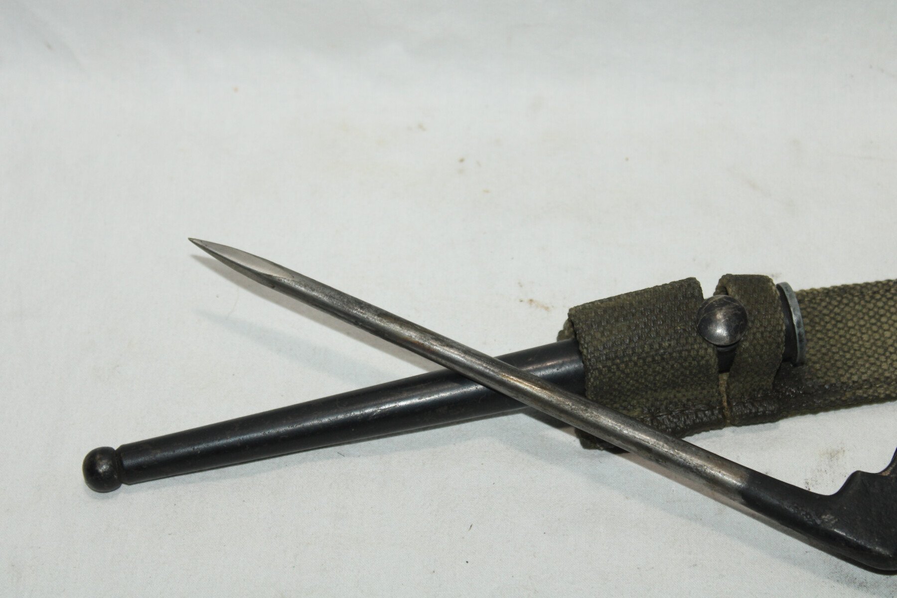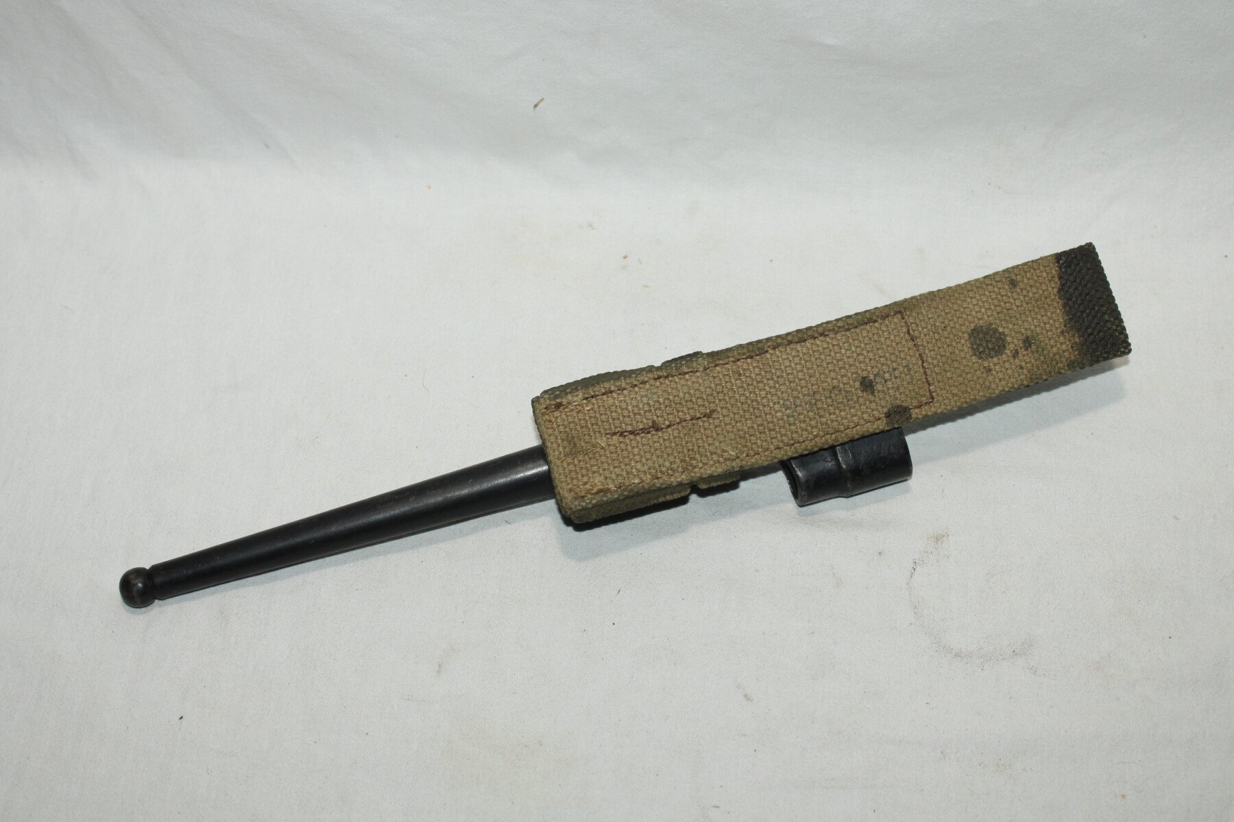 Baïonnette clou pour fusil Lee Enfield et Sten MKV, fourreau en métal. Fabrication américaine Savage. Dans sont gousset en web, pas de date visible. Blanco kg3 non d'origine. Rouille sur le fourreau. Vente interdite au mineurs.