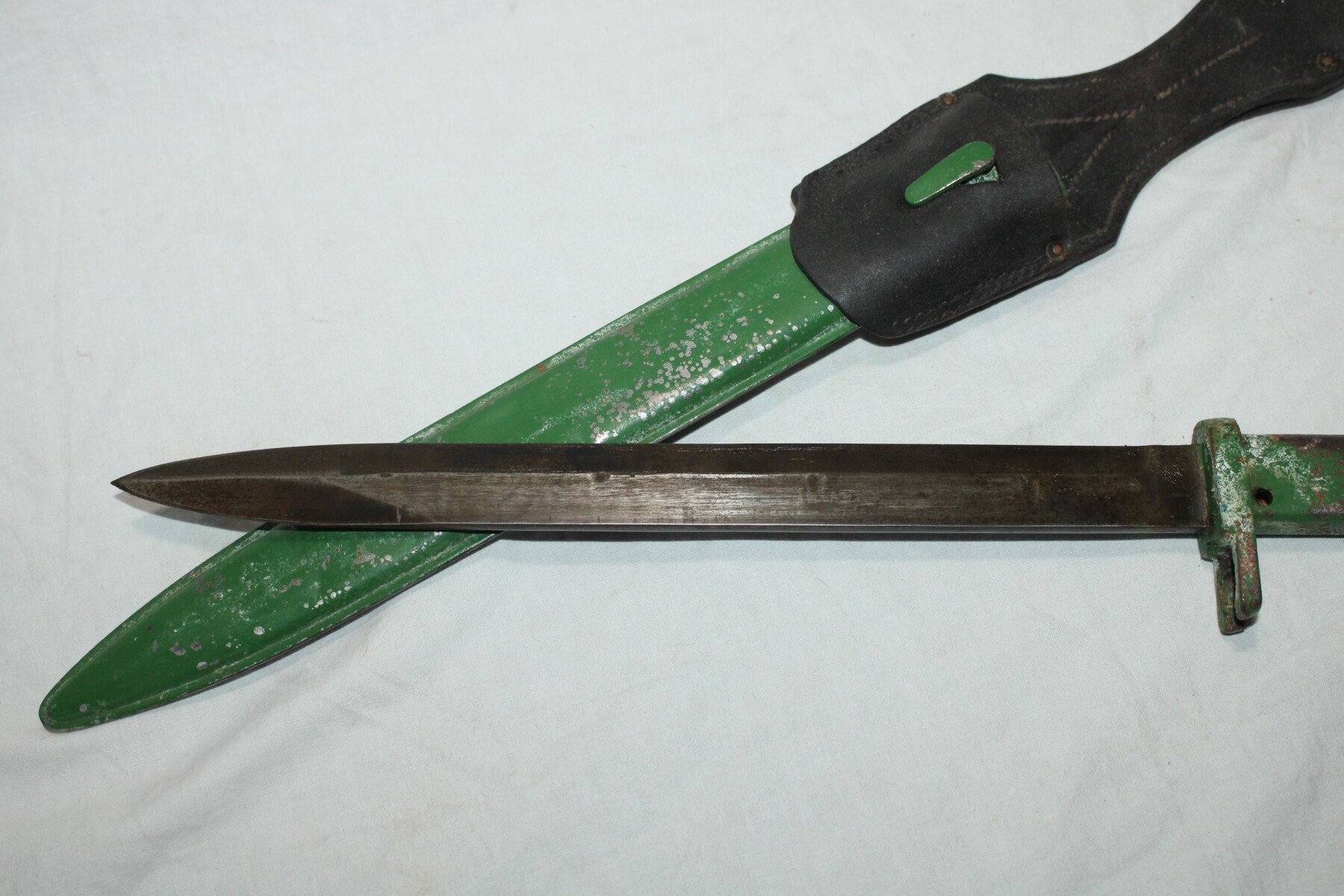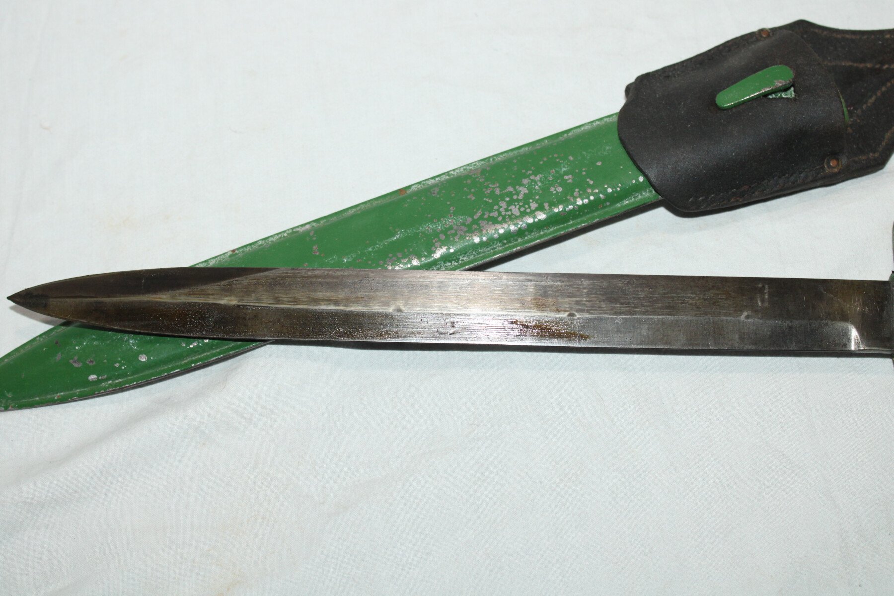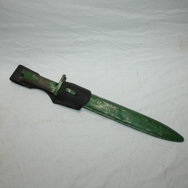 Baïonnette ersatz avec poignée moulée en acier (EB27) pour Gewehr 98. Non régimentée. Bouton poussoir absent. Peinture verte non d'origine en partie retiré. Très belle lame. Fourreau...