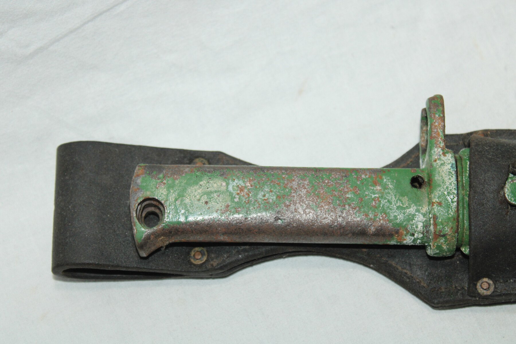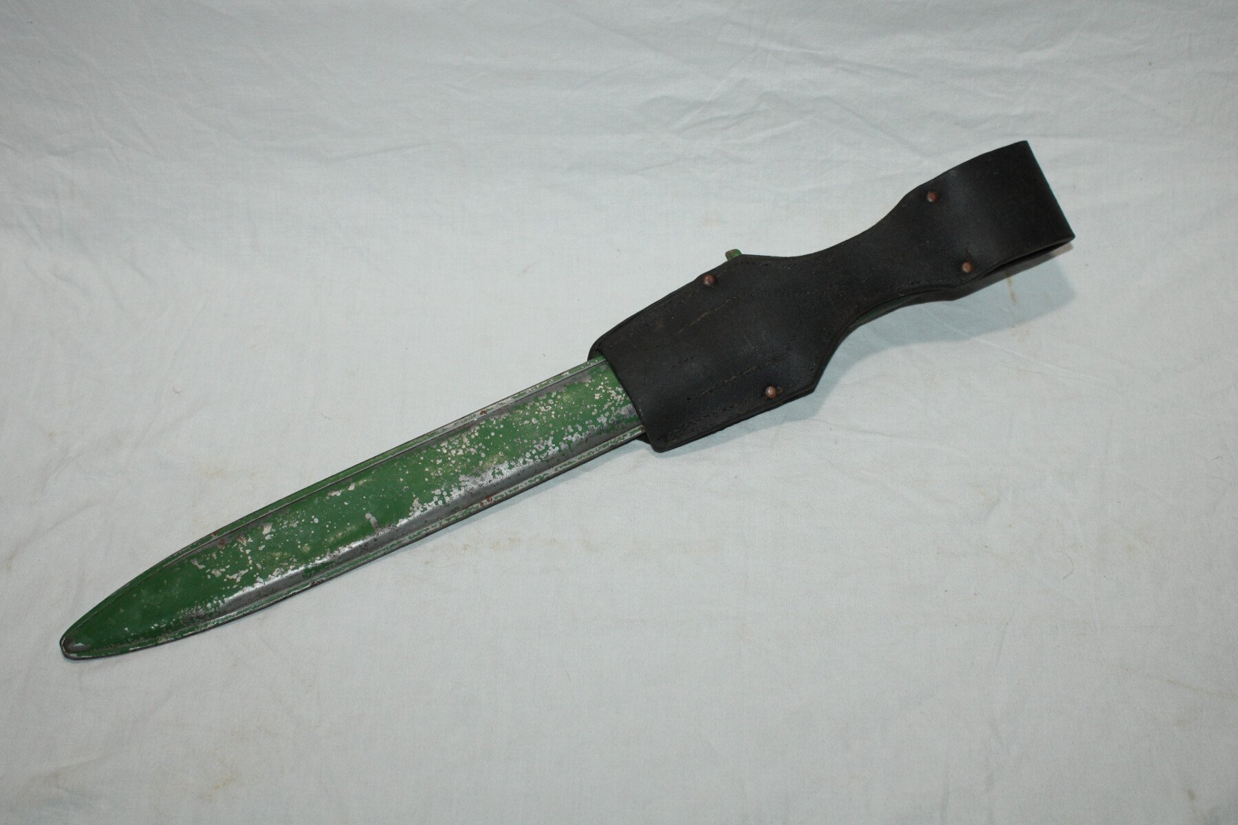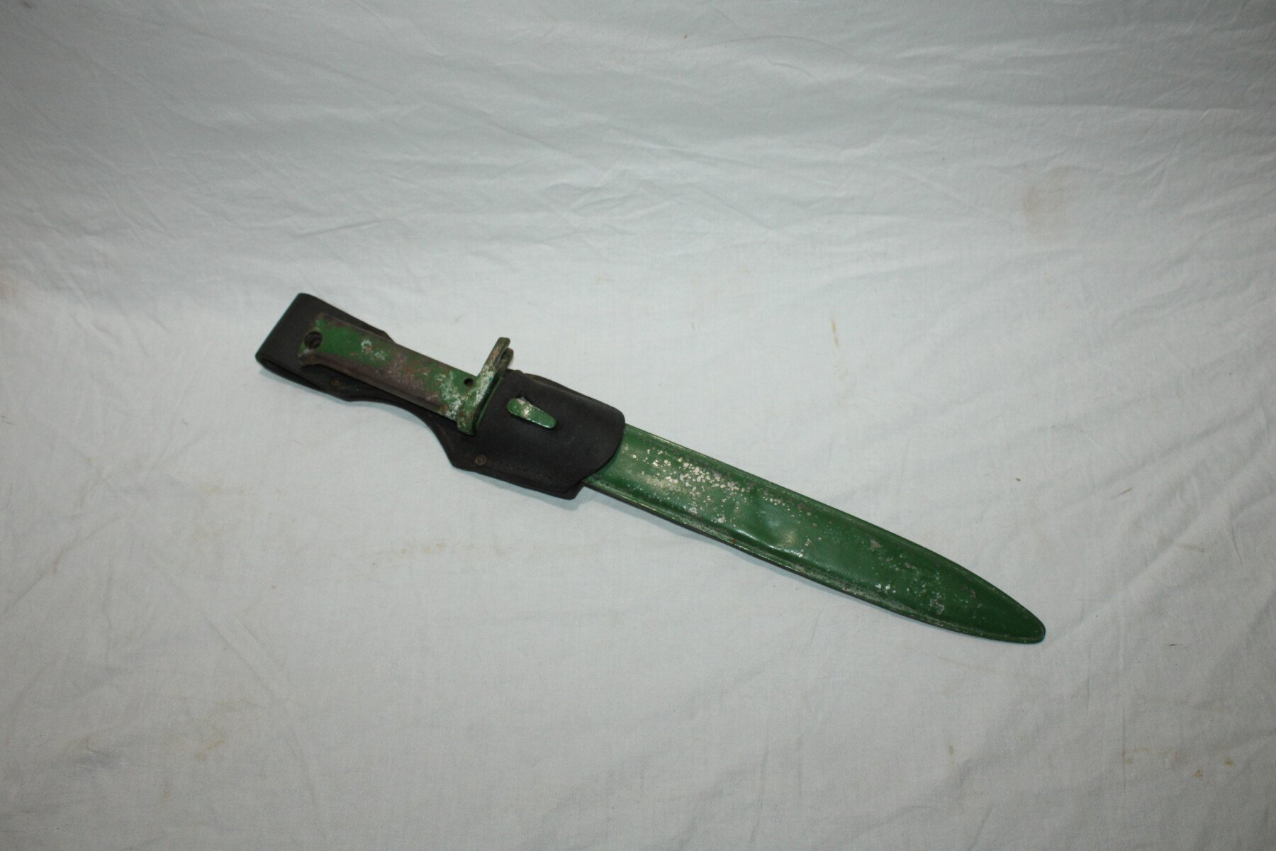 Baïonnette ersatz avec poignée moulée en acier (EB27) pour Gewehr 98. Non régimentée. Bouton poussoir absent. Peinture verte non d'origine en partie retiré. Très belle lame. Fourreau...