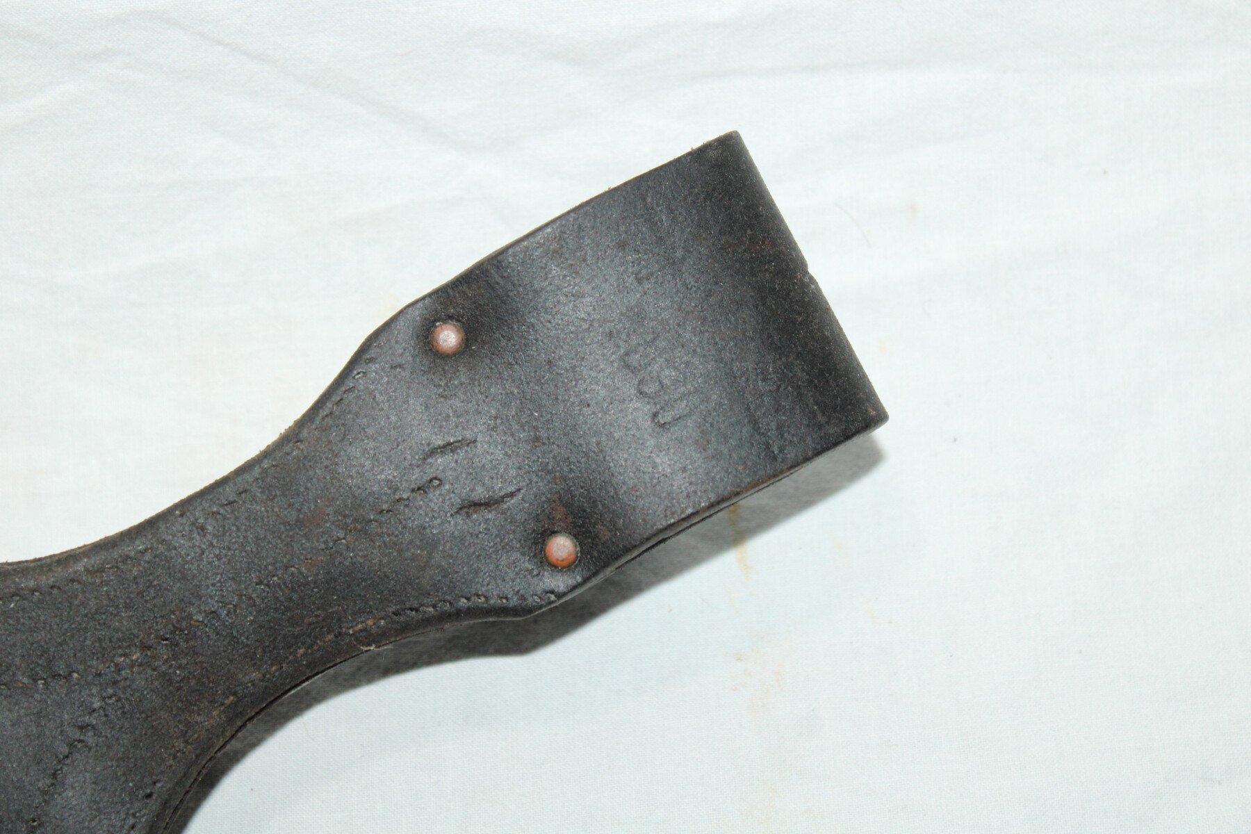 Baïonnette ersatz avec poignée moulée en acier (EB27) pour Gewehr 98. Non régimentée. Bouton poussoir absent. Peinture verte non d'origine en partie retiré. Très belle lame. Fourreau légèrement bosselé. gousset cuir en bel état, plusieurs marquages au dos. Vente interdite aux mineurs.
