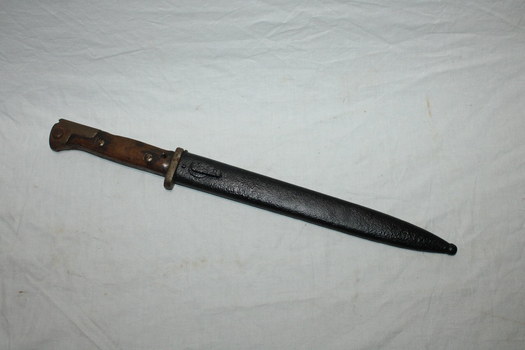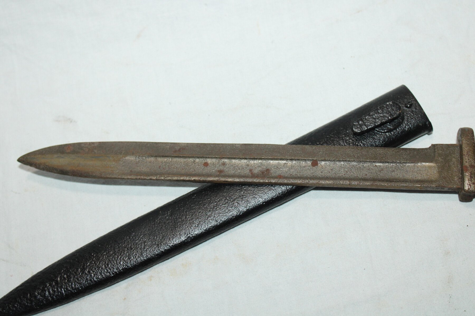 Baïonnette de fabrication Allemande pour le fusil Mauser 98A,Marquage partiellement visible du fabricant Weyersberg Kirschbaum Solingen .Fourreau repeint. Poignée en bel état. Marquage...