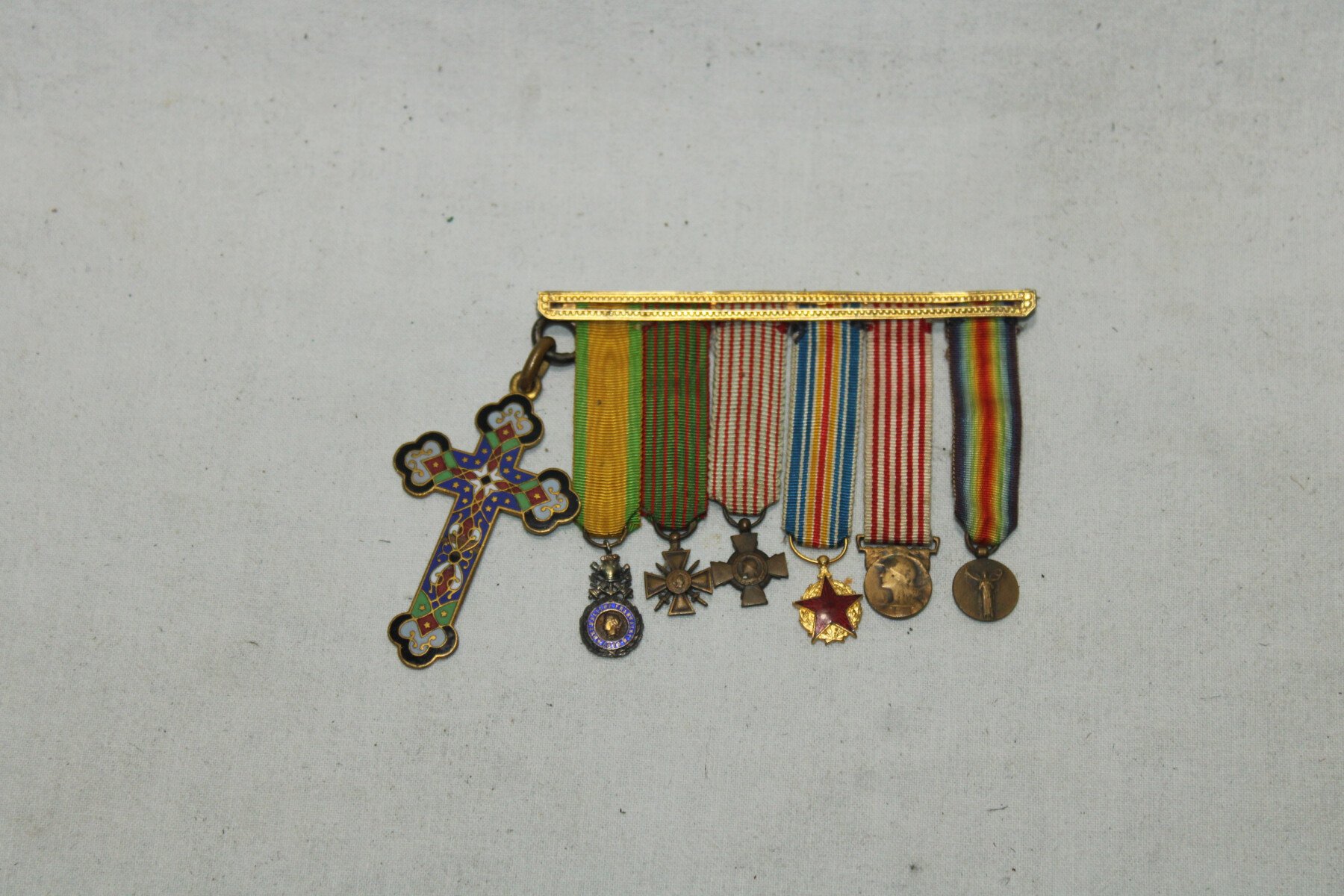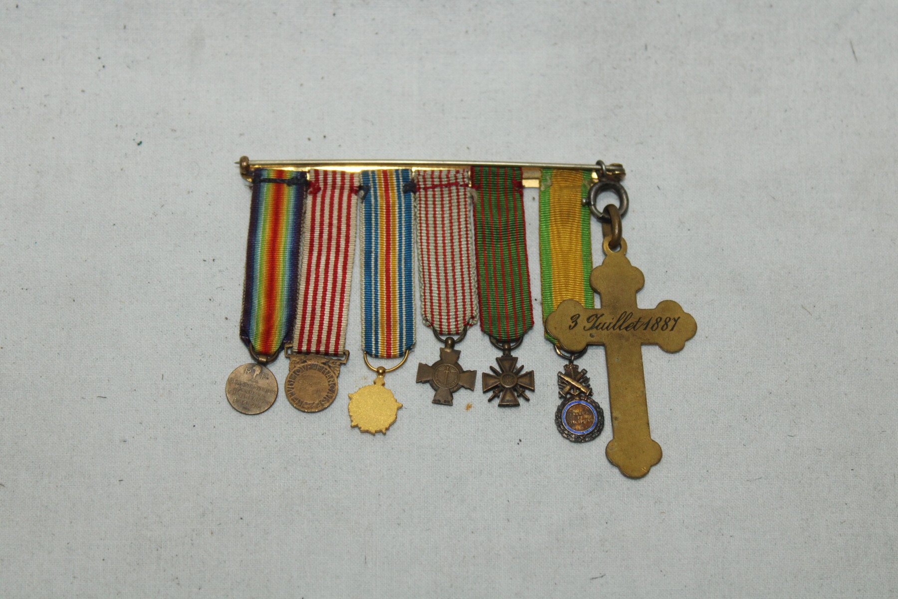 Ensemble de 6 médailles miniature de la guerre 14/18. Une croix et fixé à l'ensemble, une date au dos.