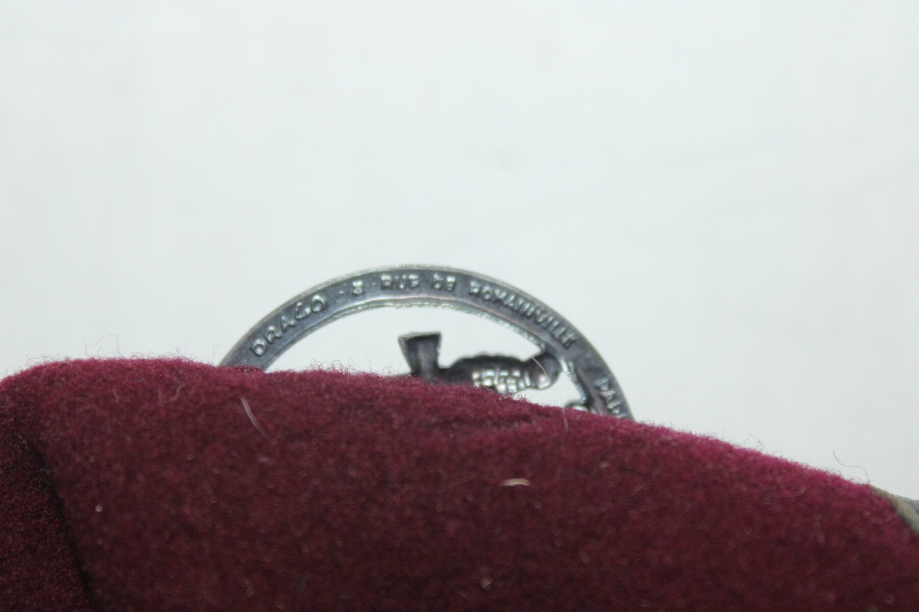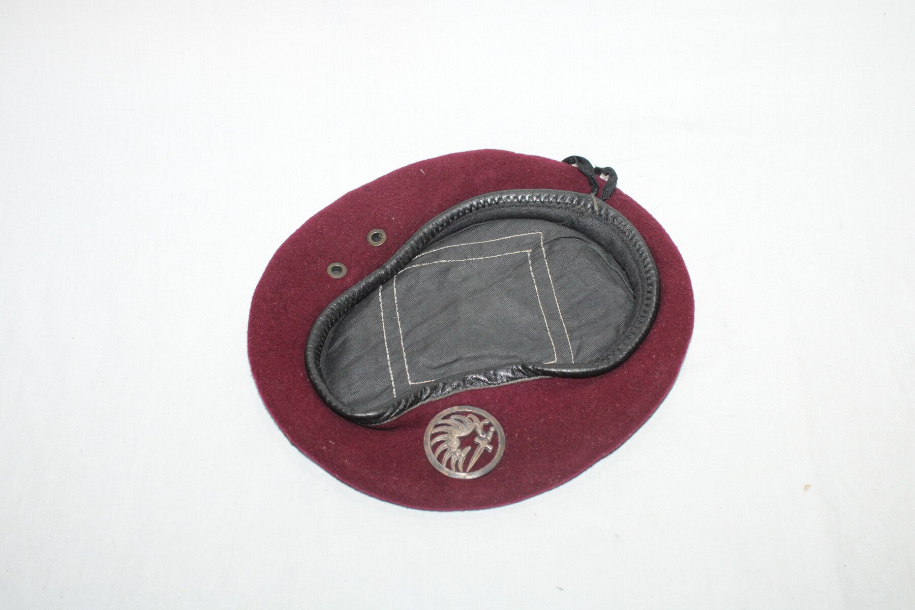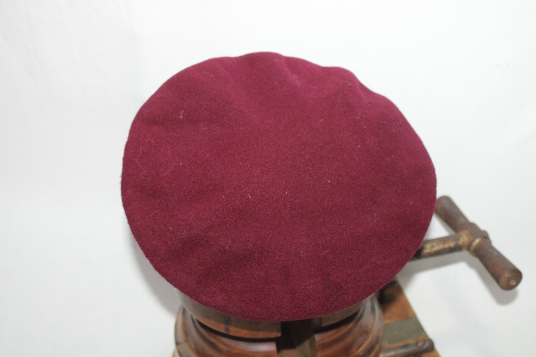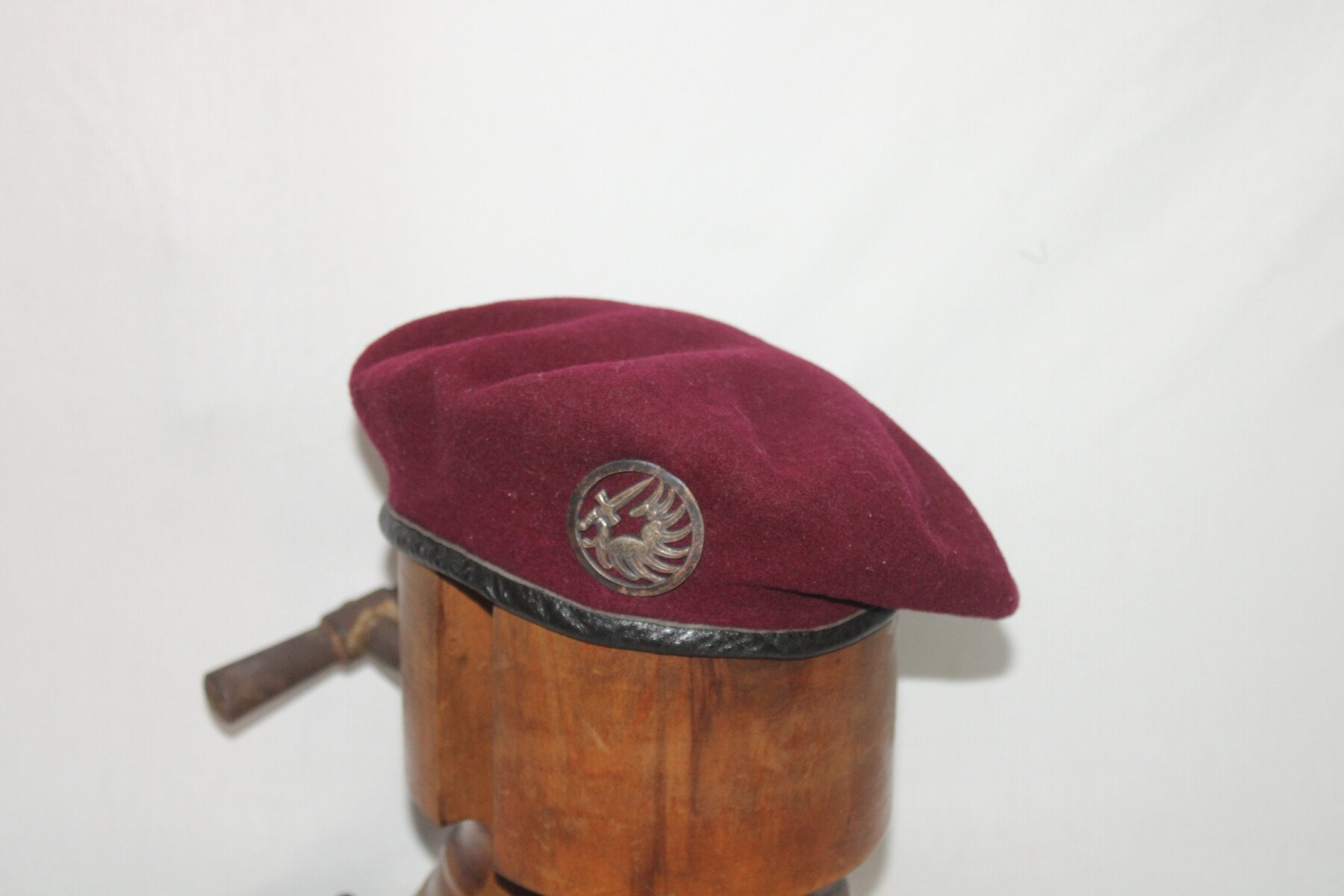 Béret modèle 53 couleur amarante/Lie de vin avec insigne parachutiste. Quelques léchures de mite sur le dessus. Talle 56. Insigne fabrication Drago 3-rue de Romainville.