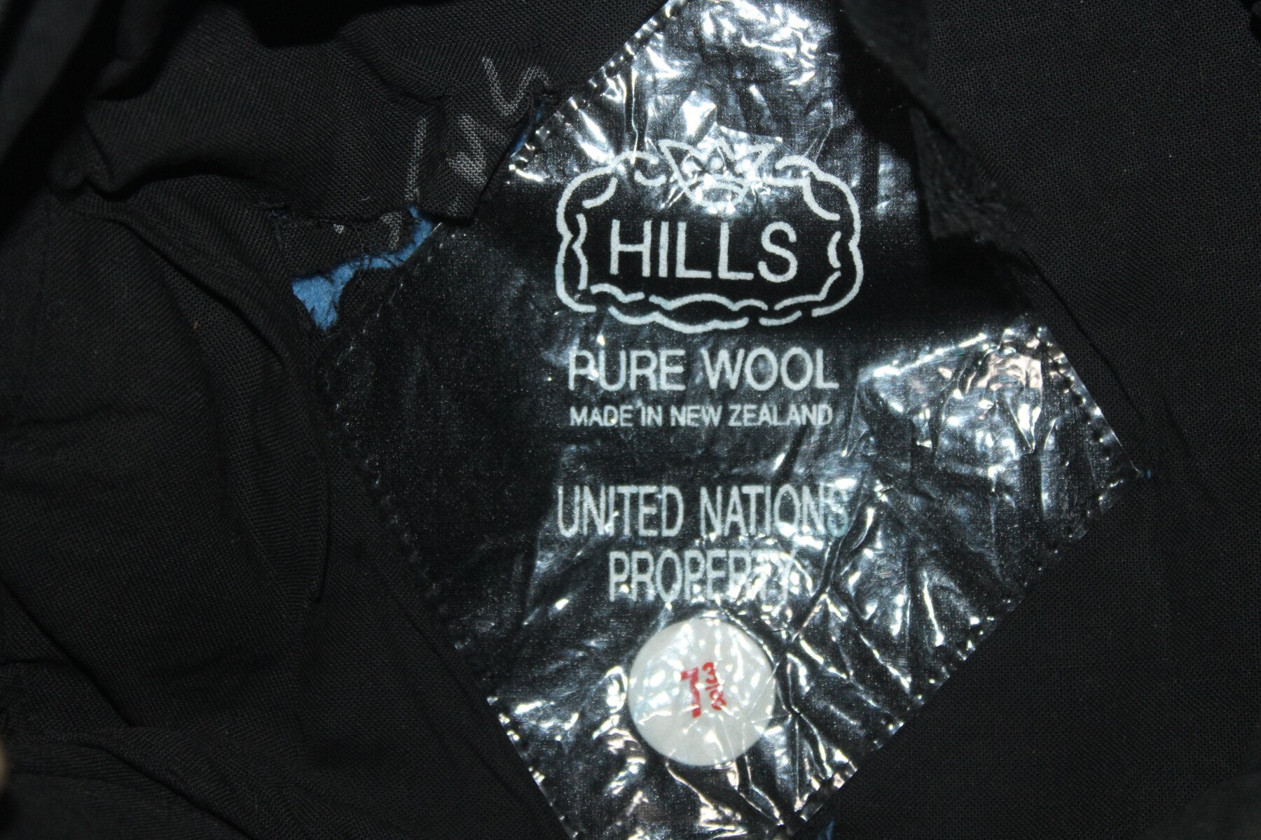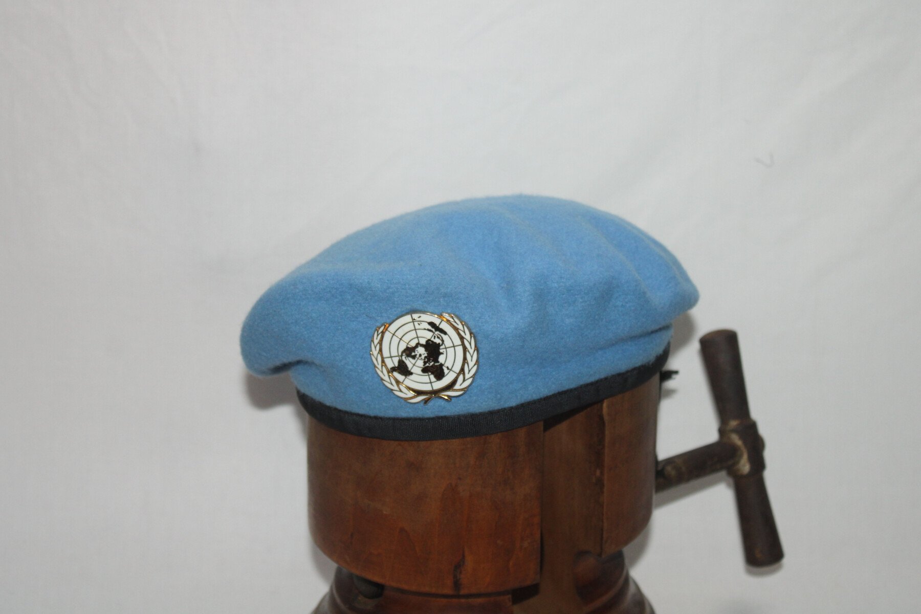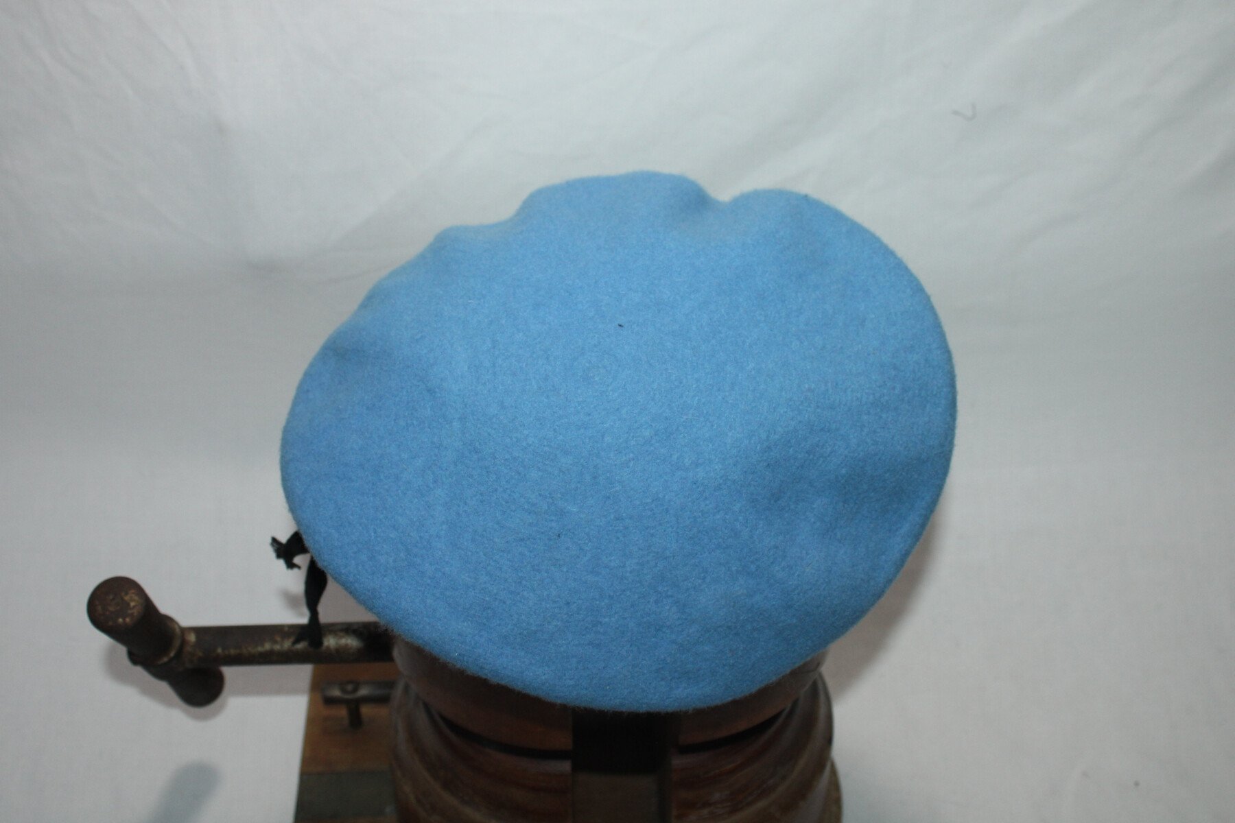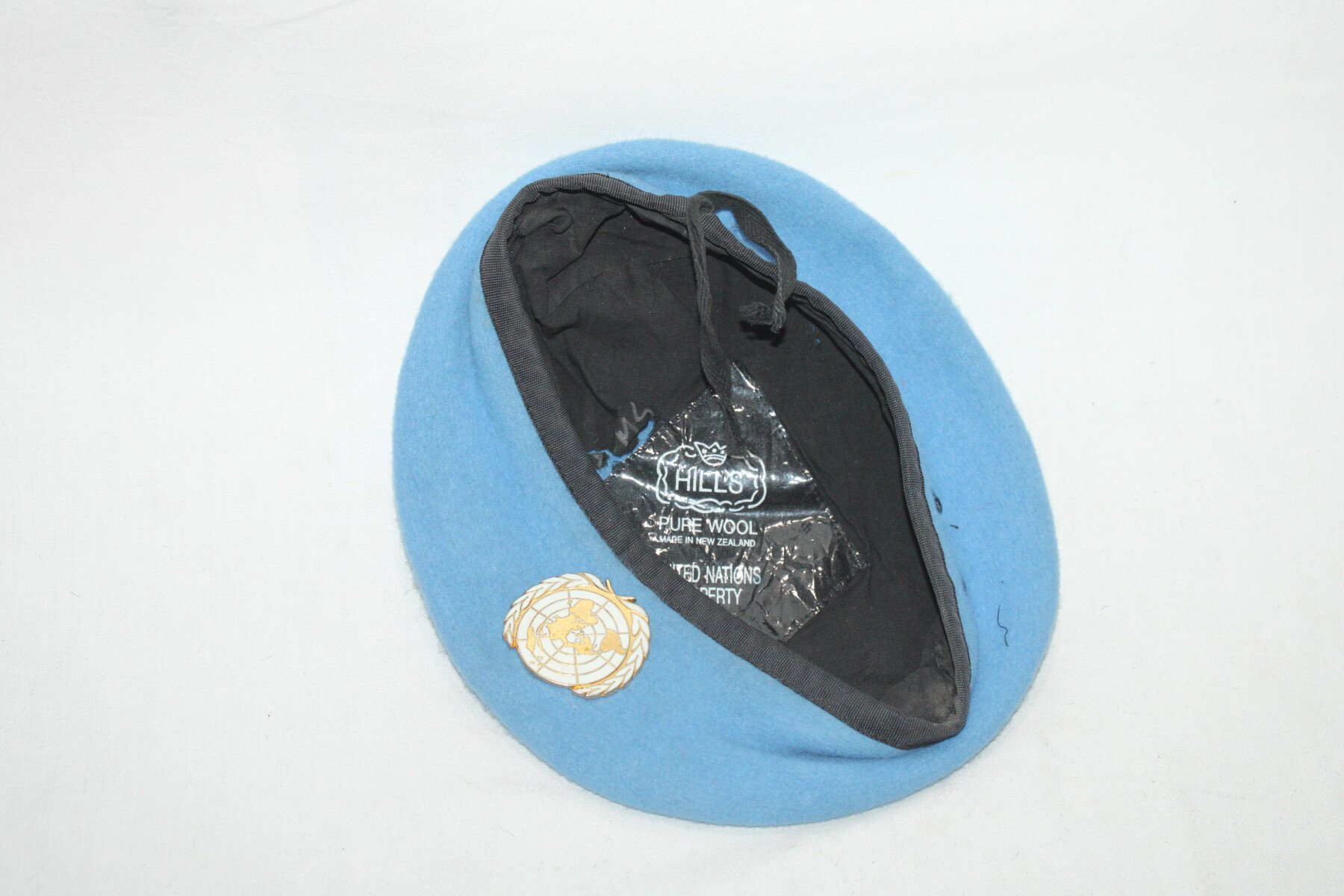 Beret bleu de l'ONU. Beret de fabrication Néo-zélandaise. Taille 7 3/8. Doulure interne abimé. Insigne fabrication J.Balme France.