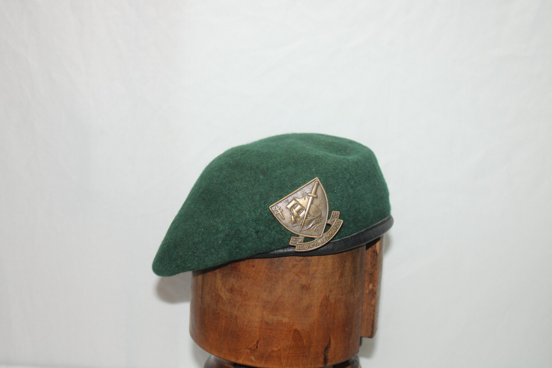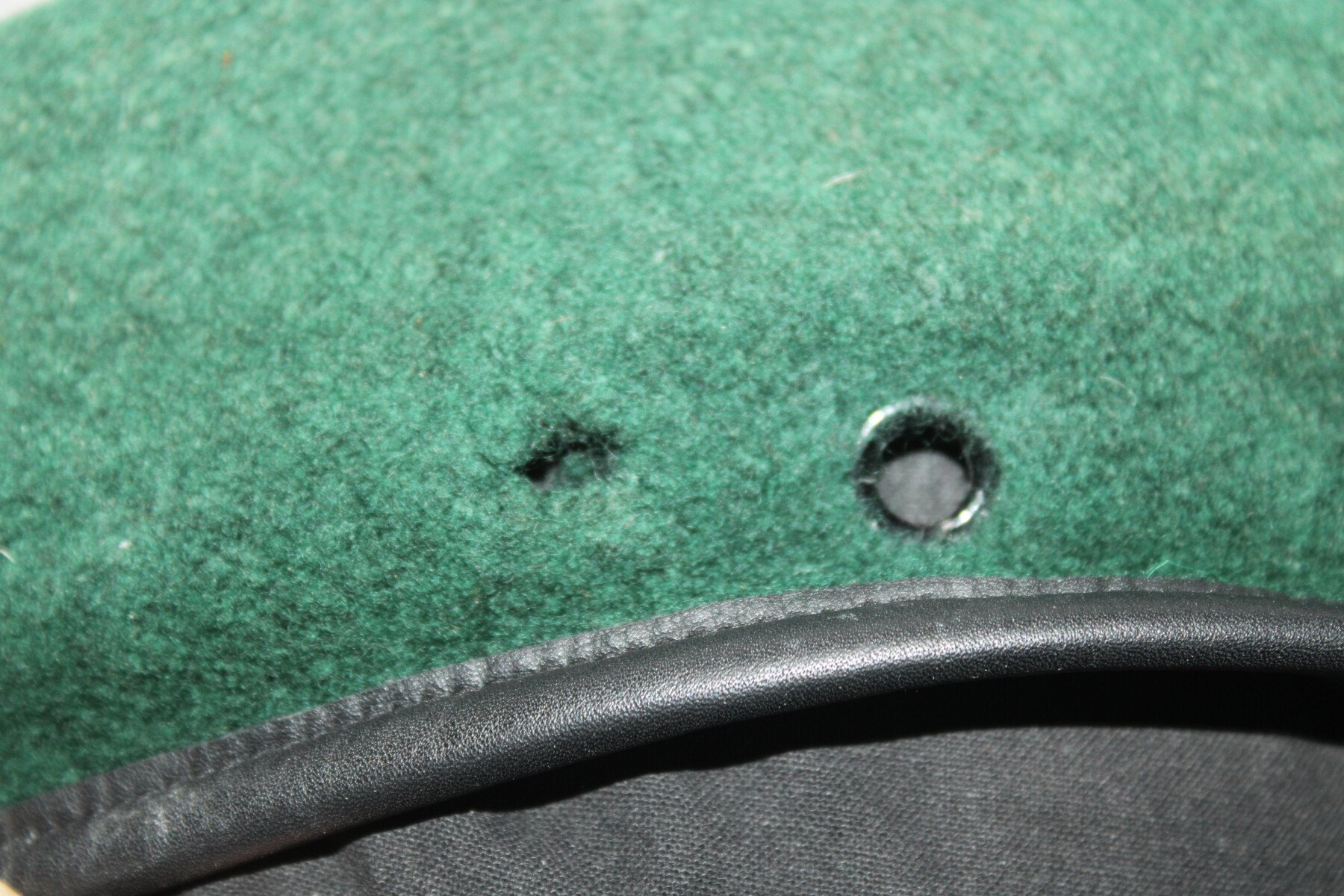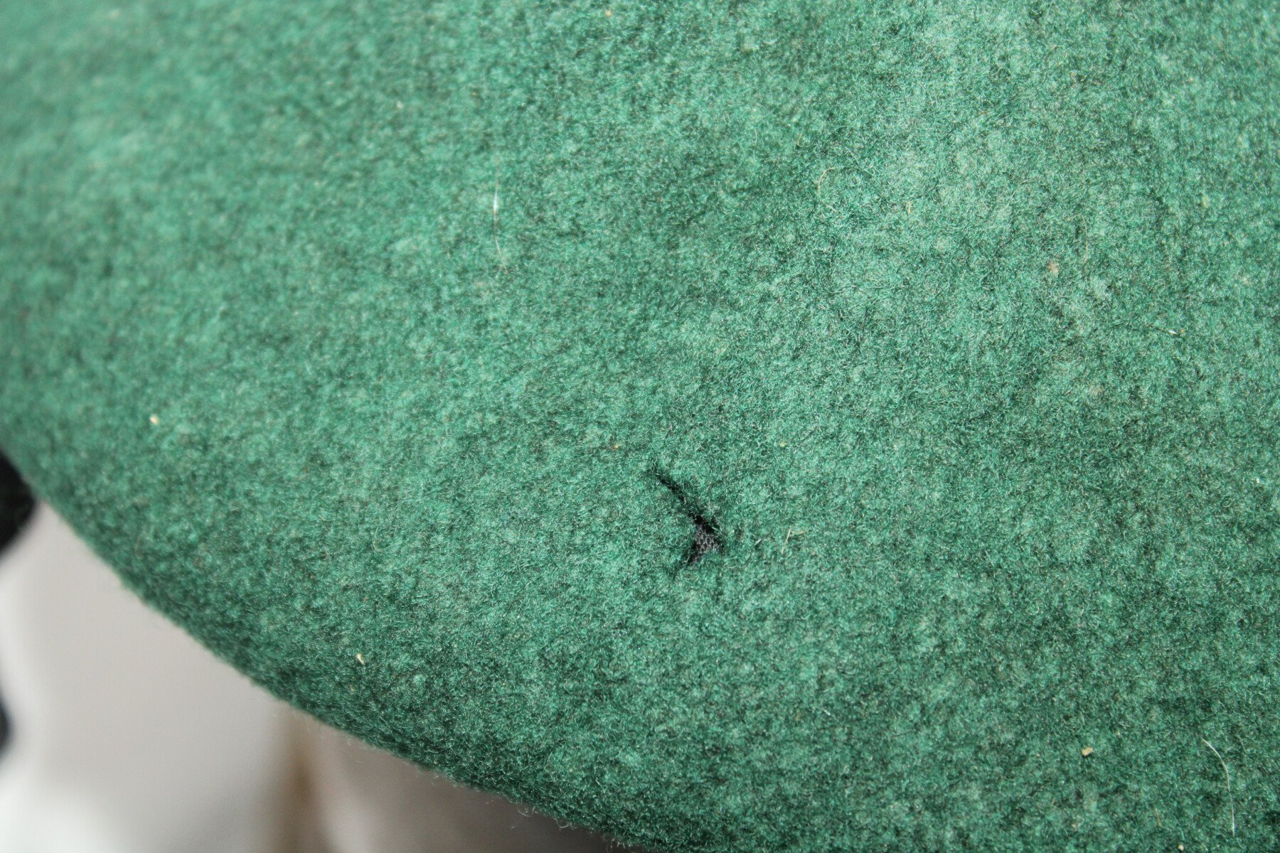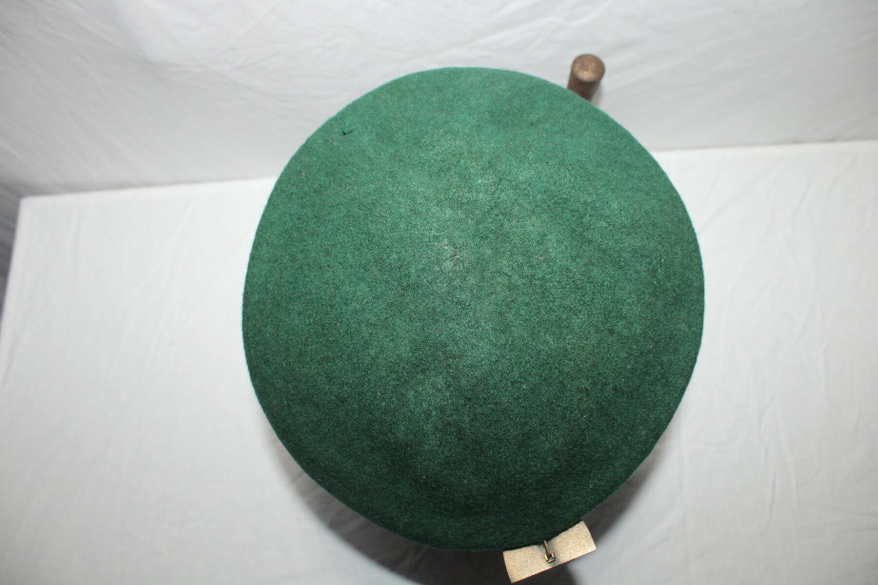 Béret vert de fabrication anglais avec insigne du 1er BFM commando en reproduction, taille 58 environ. Idéal pour la reconstitution. Un trou sur le dessus.