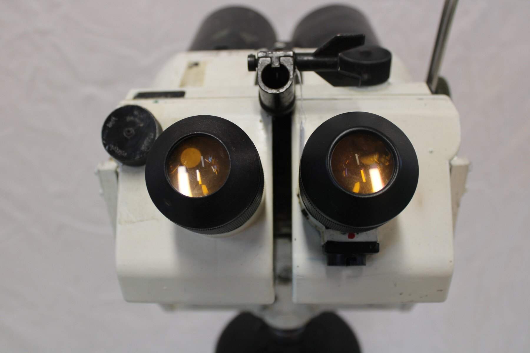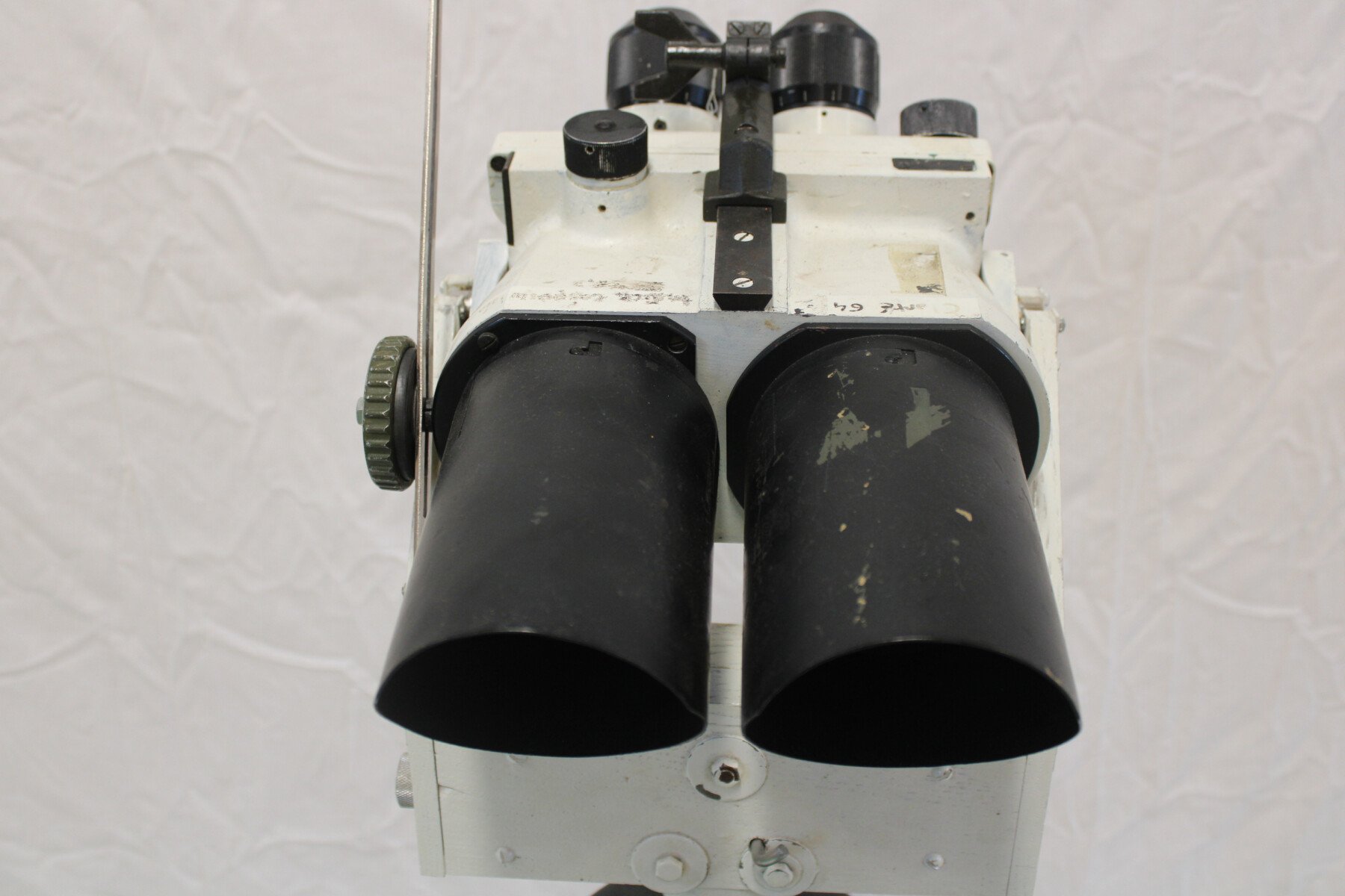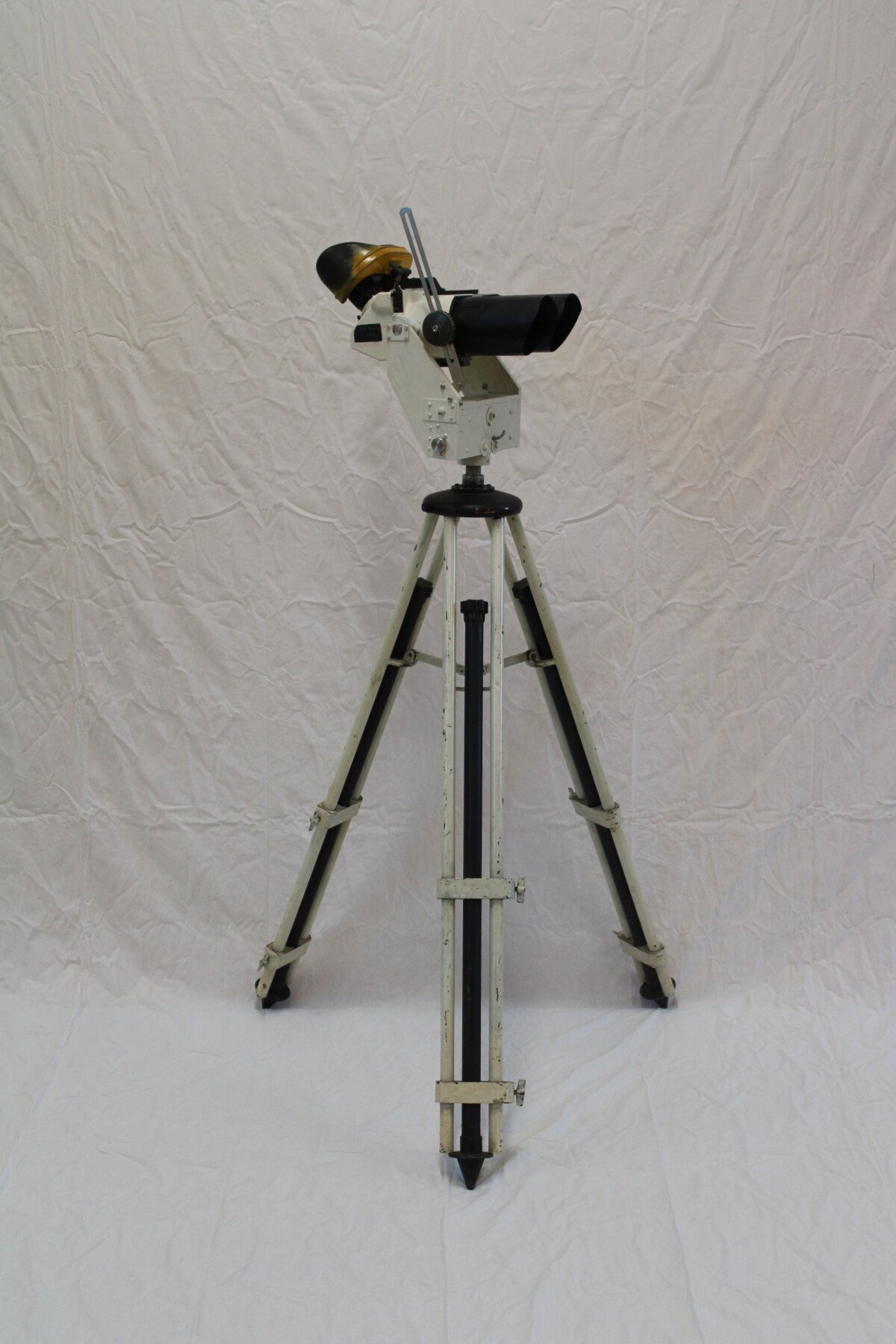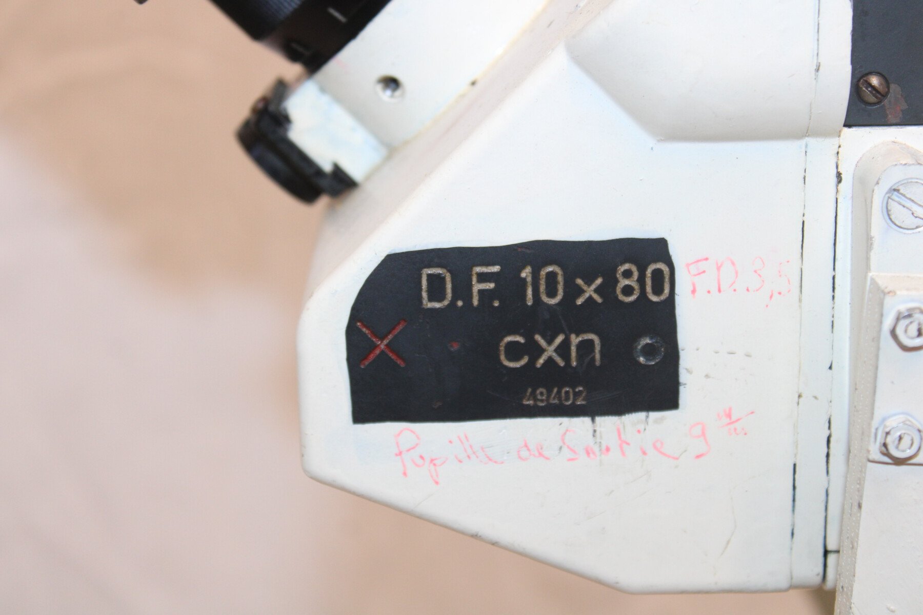 Binoculaire allemande Flak d’observation aérienne « Doppelfernrohr », puissance 10x80, fabrication « cxn » correspondant à Emil Busch. Fourni avec son trépied d'origine. Support en bois pour relier l'ensemble pas d'origine. Ensemble repasser en blanc ( possible réutilisation marine nationale Française)