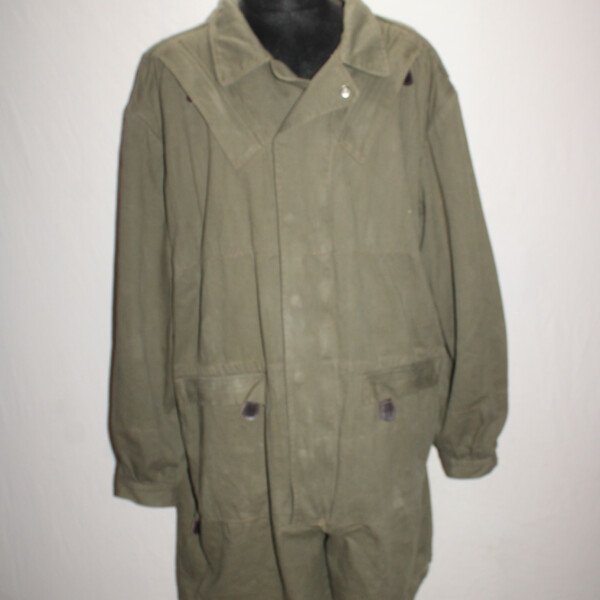 Blouse de saut fallschirmjager 1er type en toile verte. Bon état général. Légèrement porté. Fabrication ancienne. Largeur d'épaule: 62,5cm. Longueur de manche: 63.5cm.