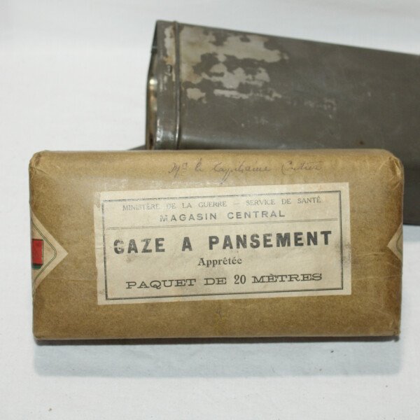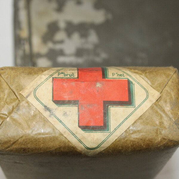 Belle boite à vivre en fer avec a l'intérieur un gros pansement du ministère de la guerre.
