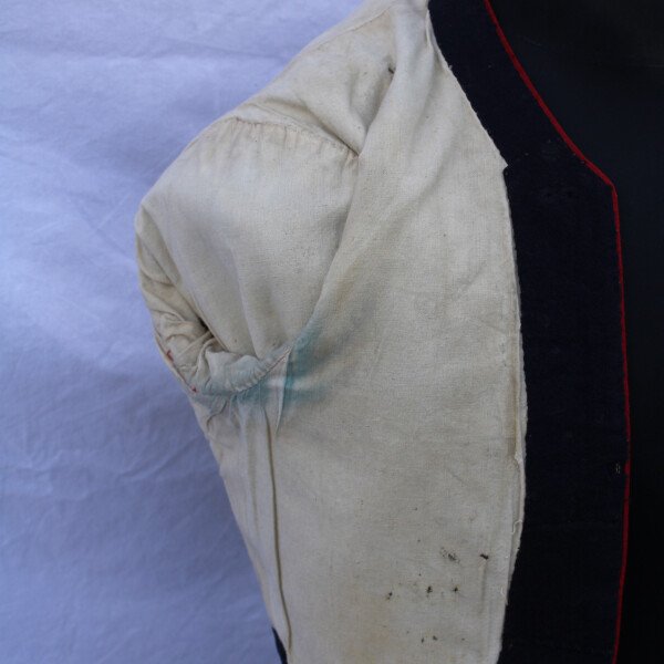 Ensemble comprenant un Boléro de zouave période 3e république. Boléro en drap bleu foncé, galons écarlates et Tombô jonquille du 3e régiment de zouave. Plusieurs accrocs, état d'usage....