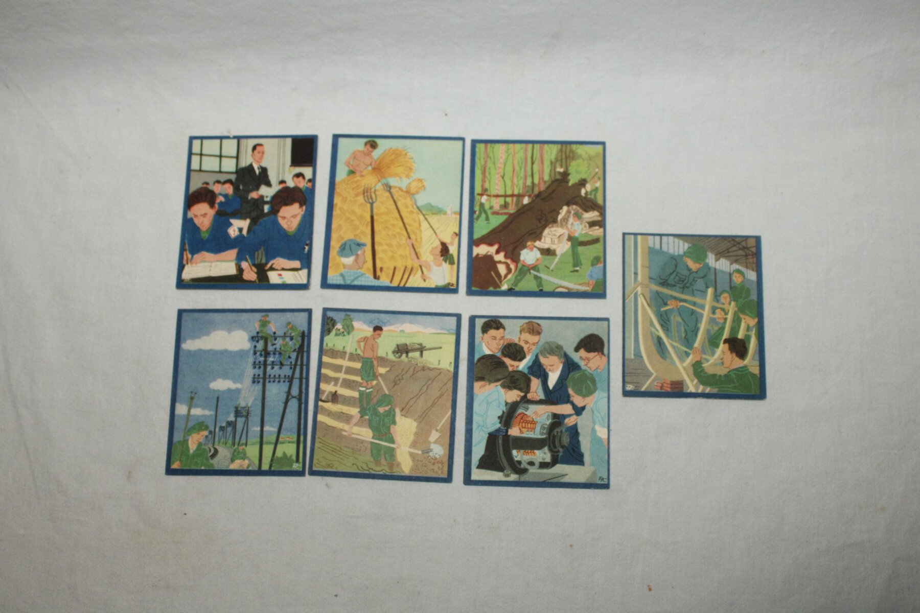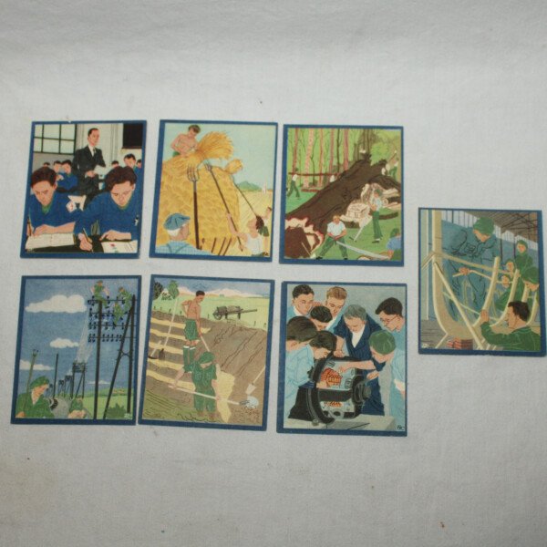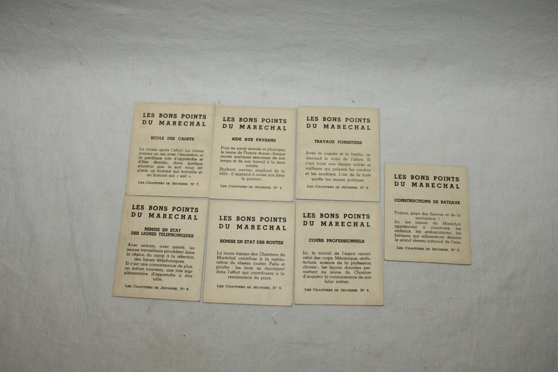 Série de 7 bons points du Maréchal sur le thème des chantiers de jeunesse. Bon état général.