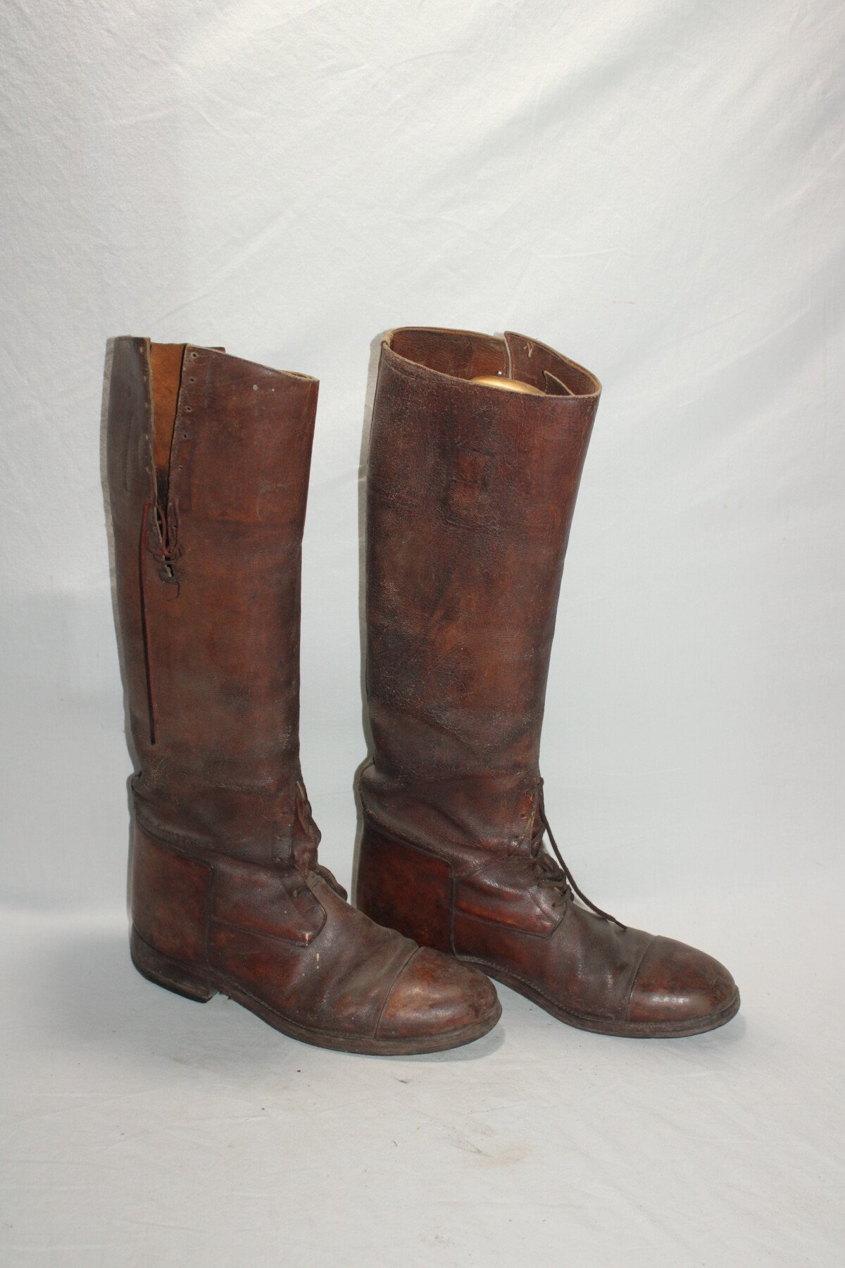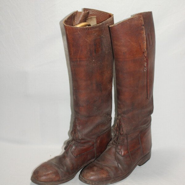 Paire de botte à lacets pour officier. Semelles ferrées, marque Fussell's. pointure 41/42 environ. Cuir souple, revêtement craquelé. Manque un lacet de botte. Largeur de mollet 38 cm.