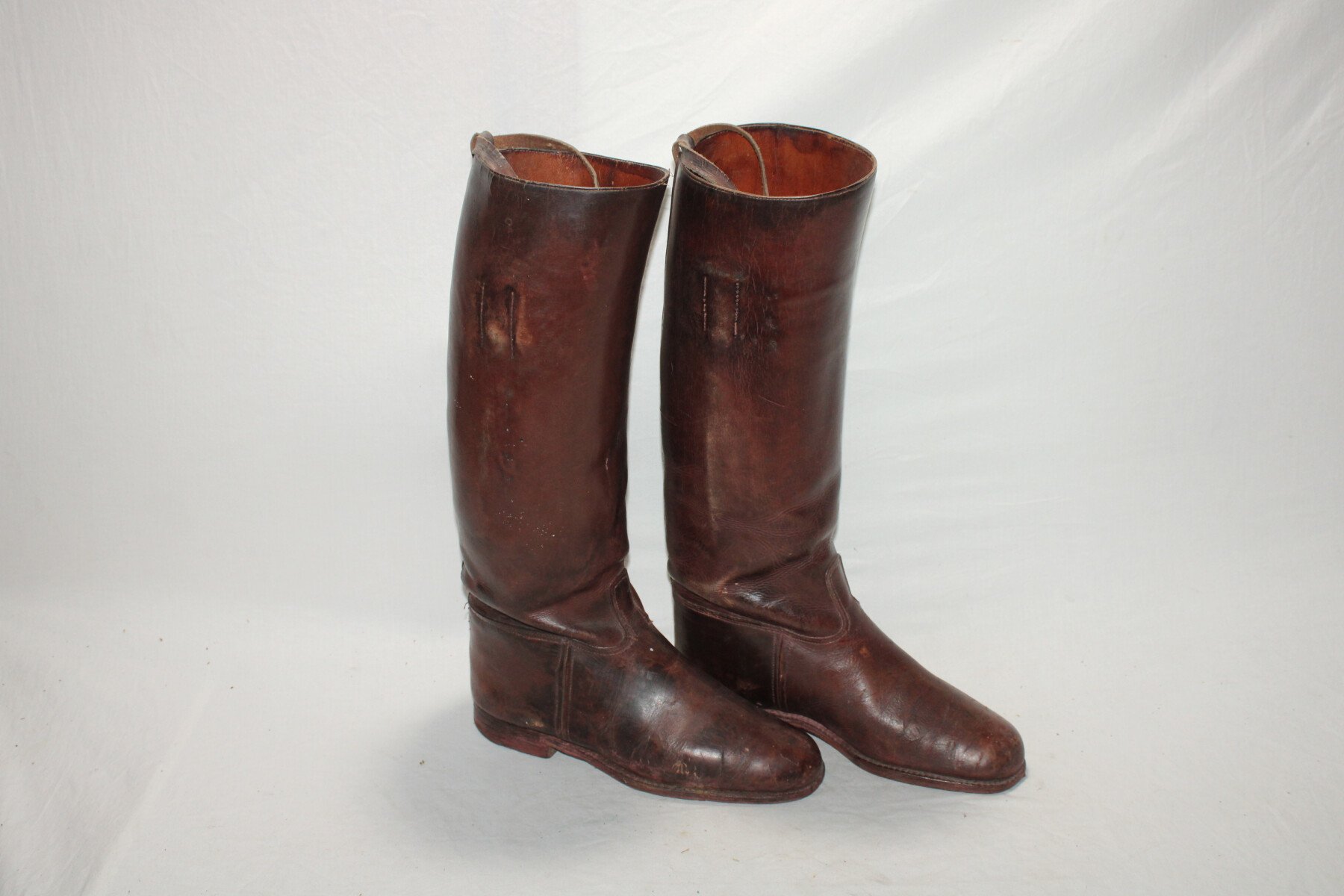 Paires de bottes de cavalerie en cuir rouge. Emplacement pour les éperons. Taille 41-42 environs. Cuirs souples. Tour de mollet 41cm. Semelle à refaire pour utilisation. Fabrication Marcy.