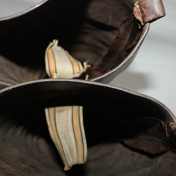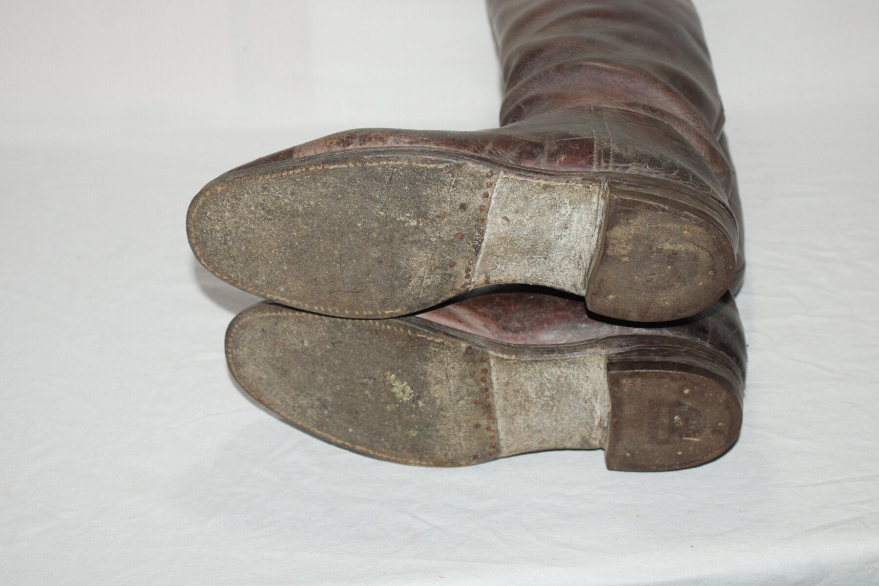 Paires de bottes de cavalerie en cuir brun. Taille 43-44 environs. Cuirs souples. Tour de mollet 41cm. Semelle refaite, fabrication Morvan.