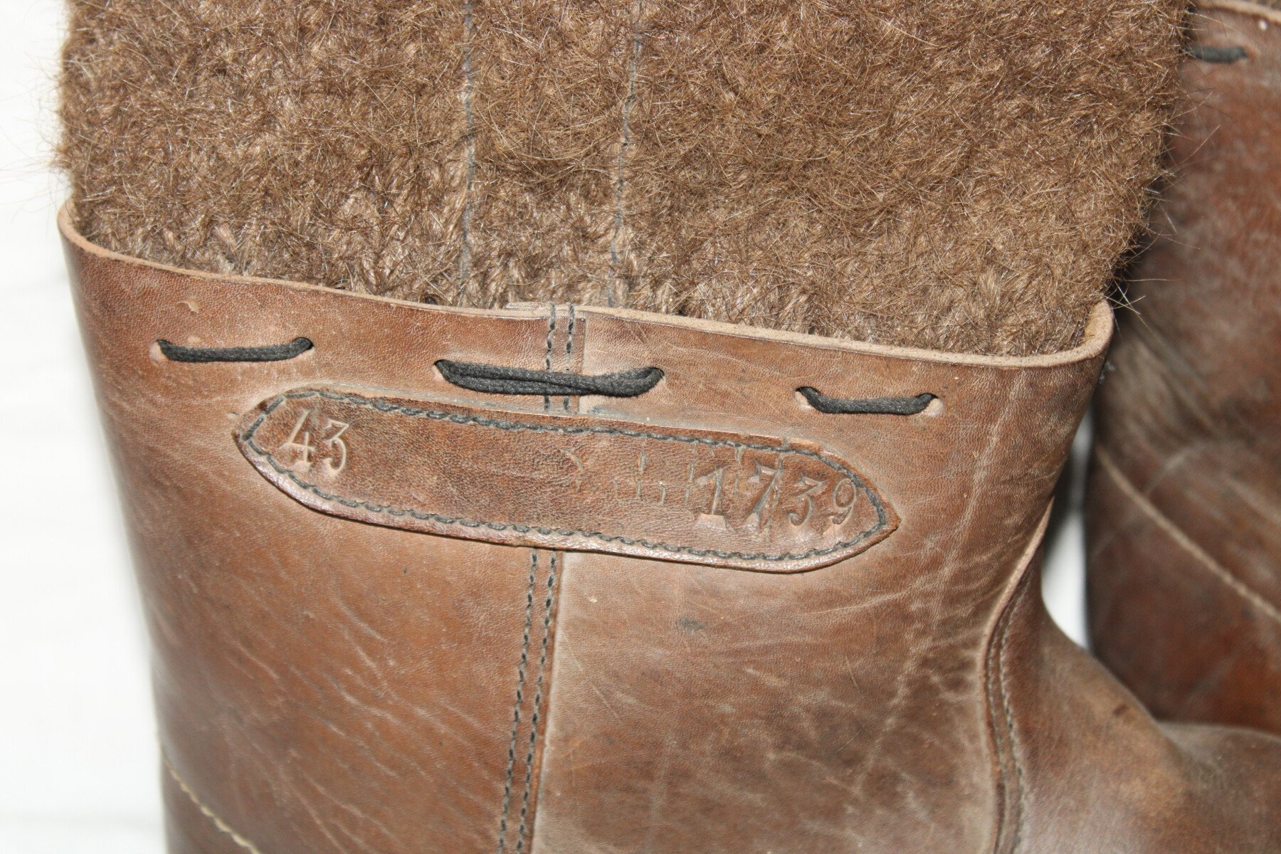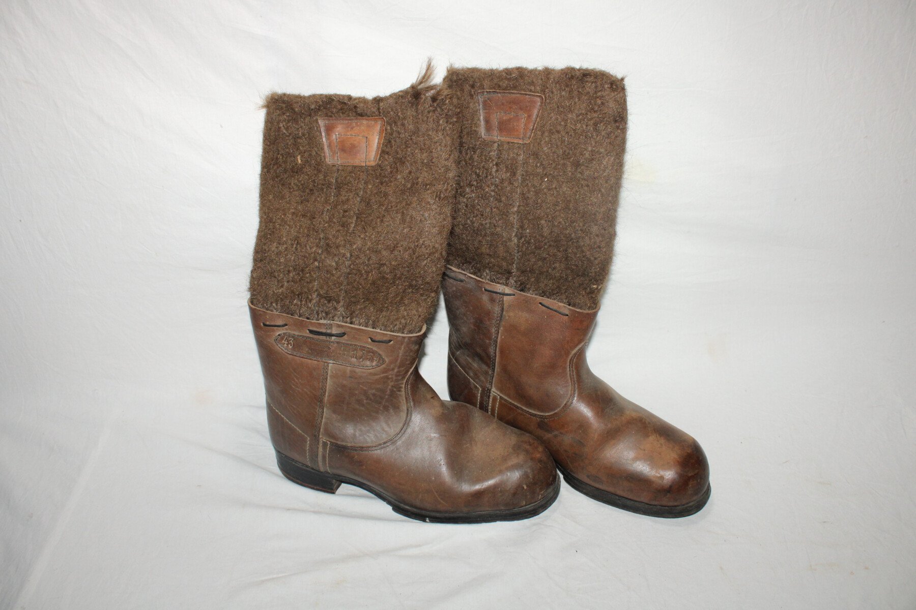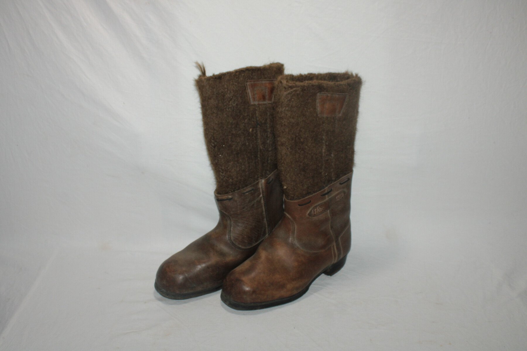 Paire de bottes grand froid en cuir brun de la Reichsbahn. Marquage sur les cotés 43 RDB 1739. Marqué 31 sur la semelle. Pointure 44-45 environs. Longueur de la semelle: 32cm.