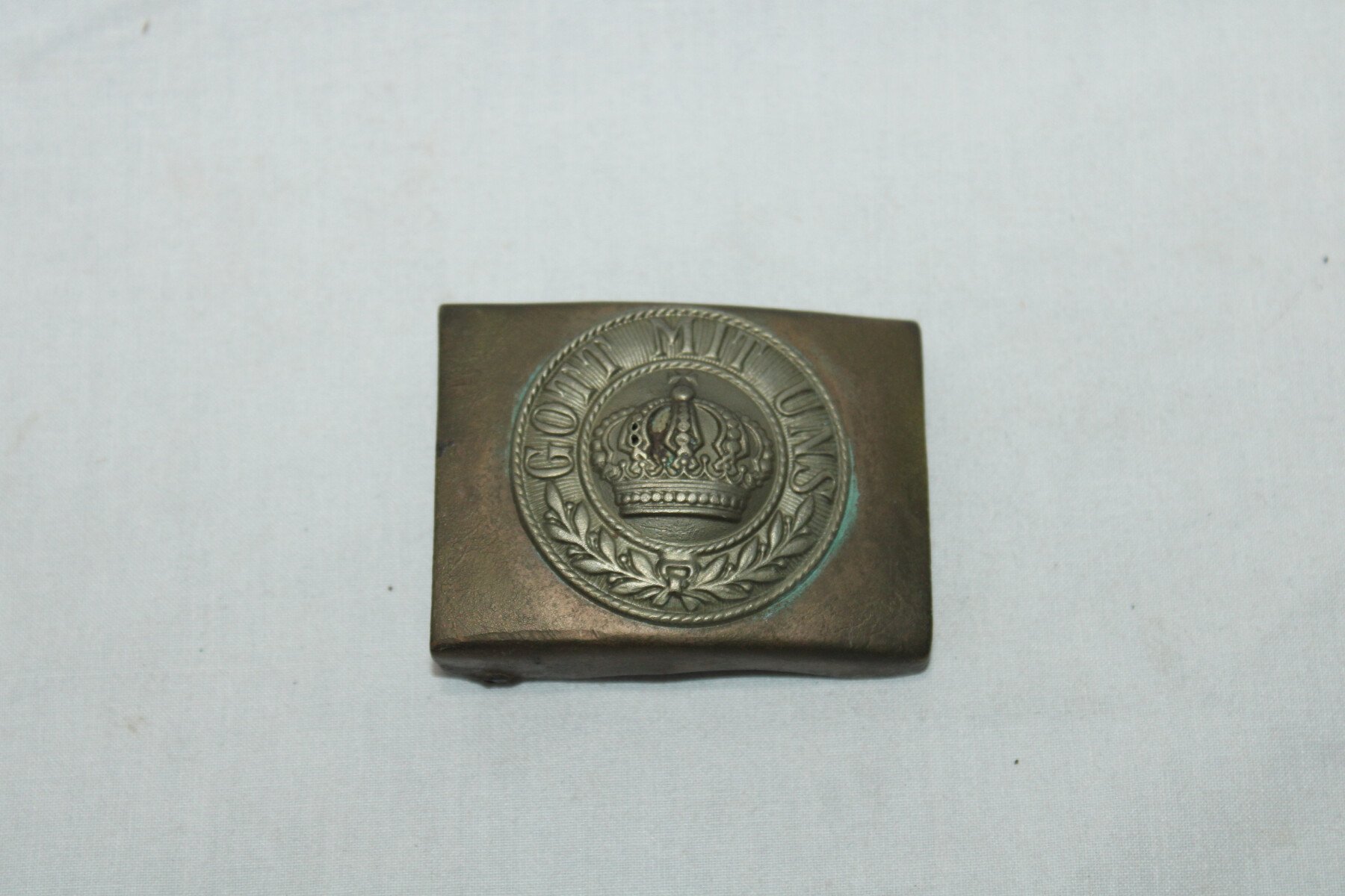 Boucle de ceinturon prussien modèle 1895 en laiton. Marqué gott mit uns. Attache de ceinturon cassé.