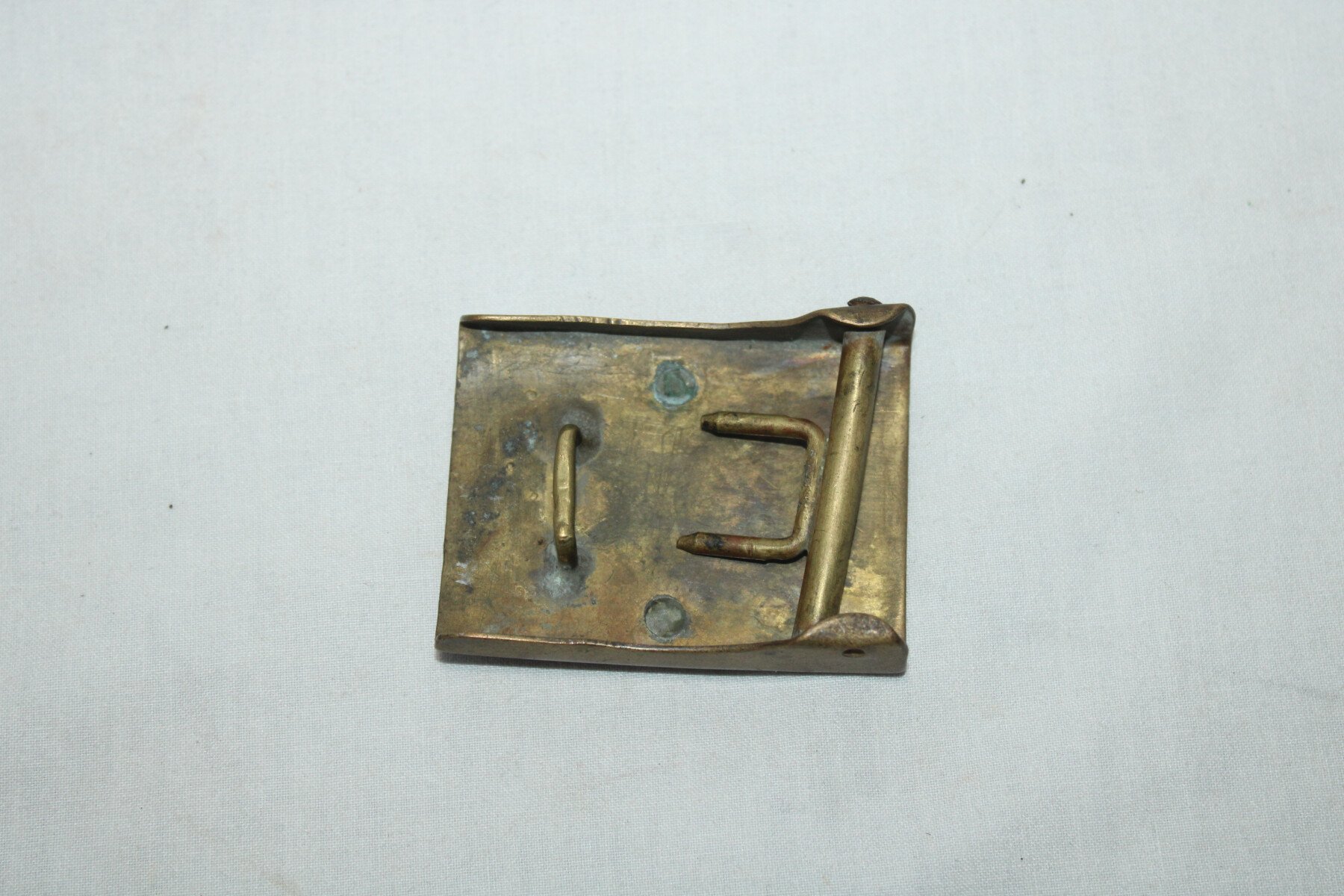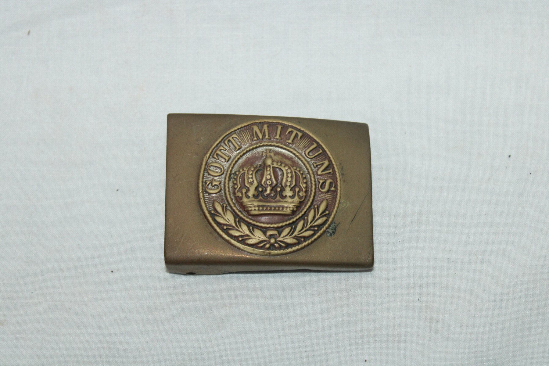 Boucle de ceinturon prussien modèle 1895 en laiton. Marqué gott mit uns. Un rivet cassé. Centre légèrement enfoncé.