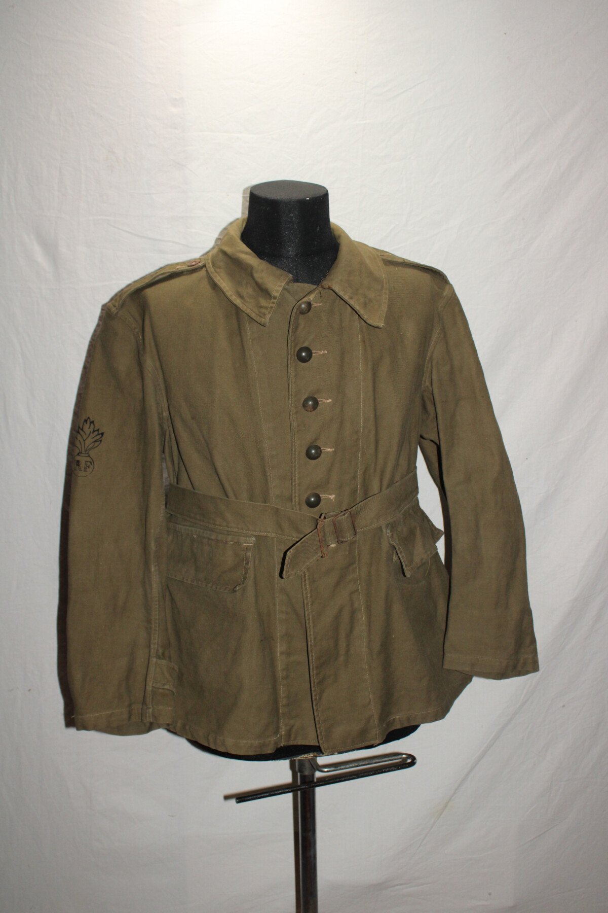 Veste bourgeron modèle 1938, fermeture par 6 boutons. Tout les boutons présents sauf un a l'épaulette. Pas de tampon de taille et de date. Tampon grenade sur une manche. Largeur d'épaule=47 cm,...