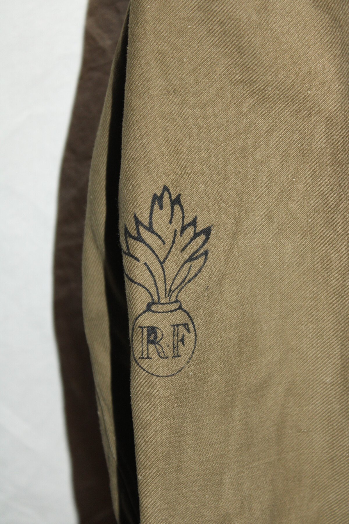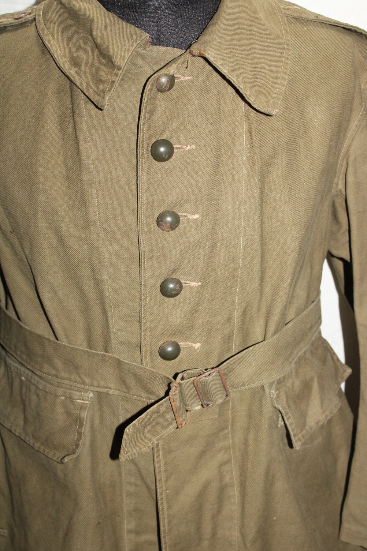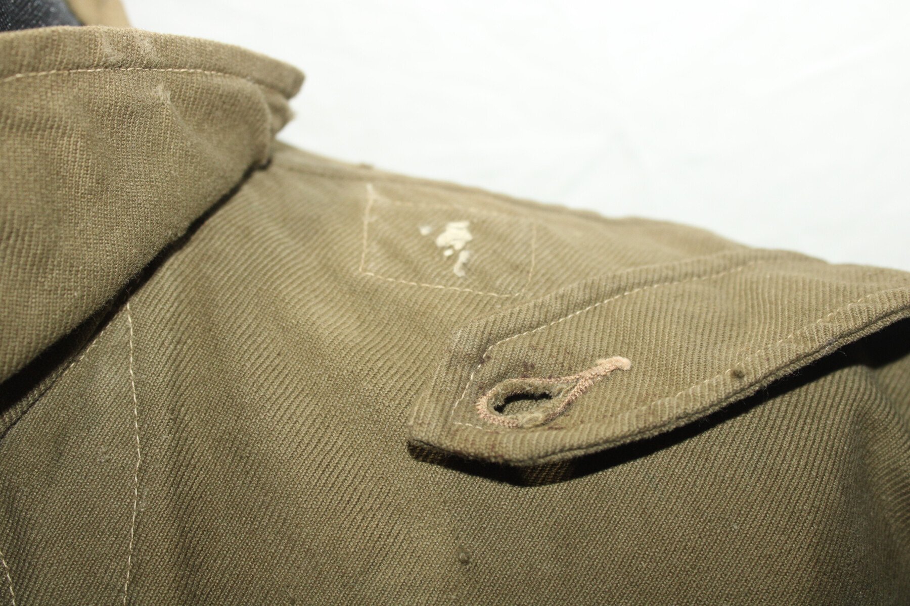 Veste bourgeron modèle 1938, fermeture par 6 boutons. Tout les boutons présents sauf un a l'épaulette. Pas de tampon de taille et de date. Tampon grenade sur une manche. Largeur d'épaule=47 cm, longueur de manche=56 cm, hauteur total=67 cm.
