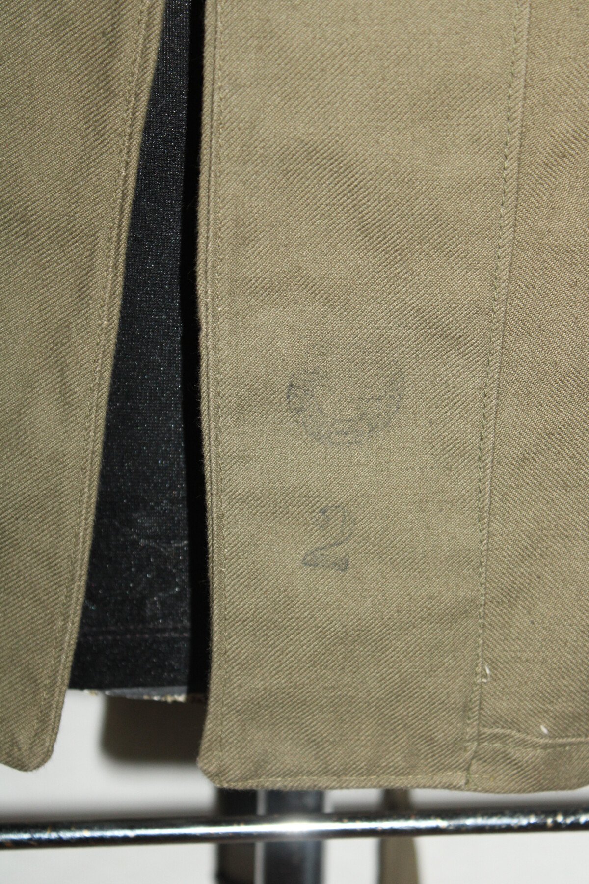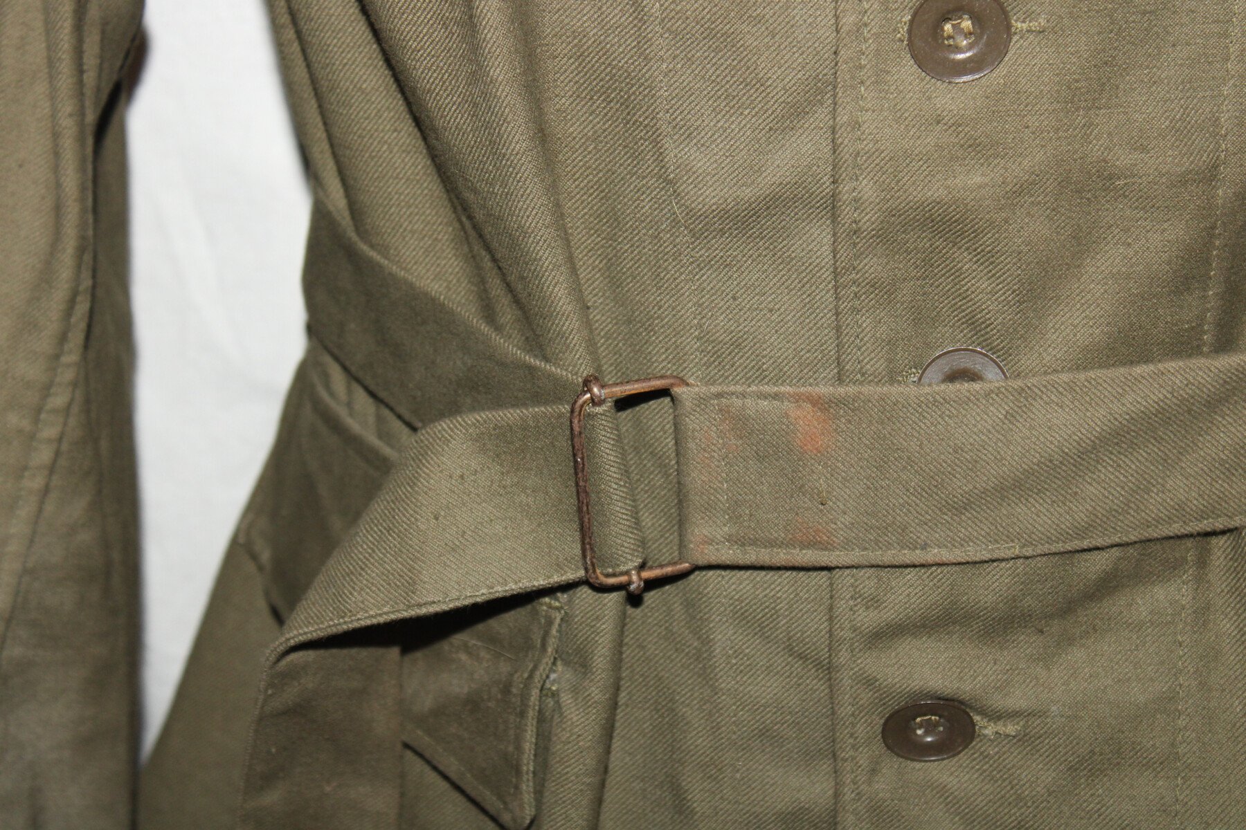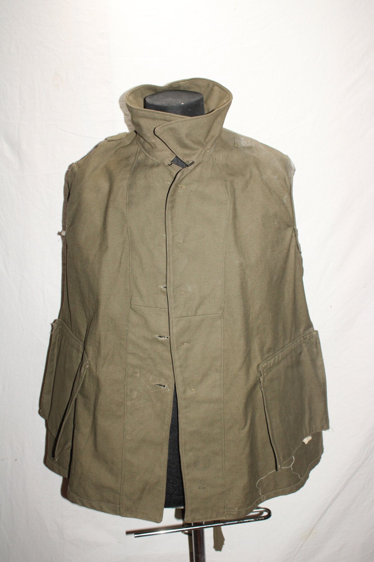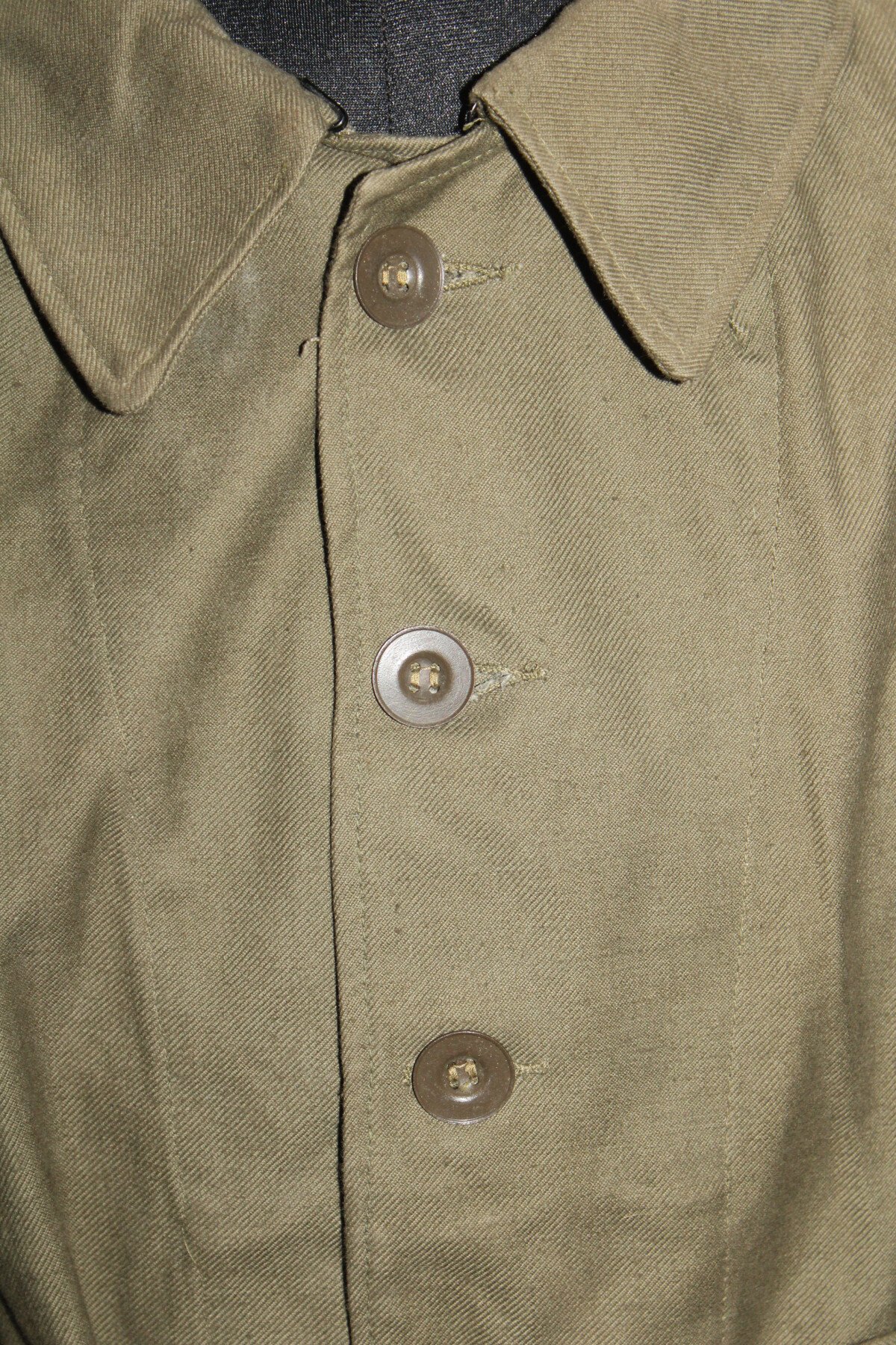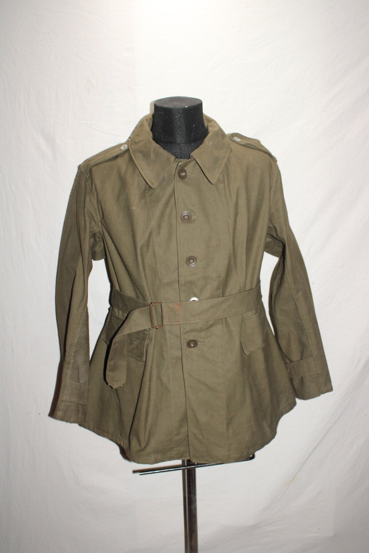 Veste bourgeron modèle 1938. Tout les boutons présents. Tampon de taille 2, date peu visible. Largeur d'épaule=43.5 cm, longueur de manche=56 cm, hauteur total=73.5 cm.