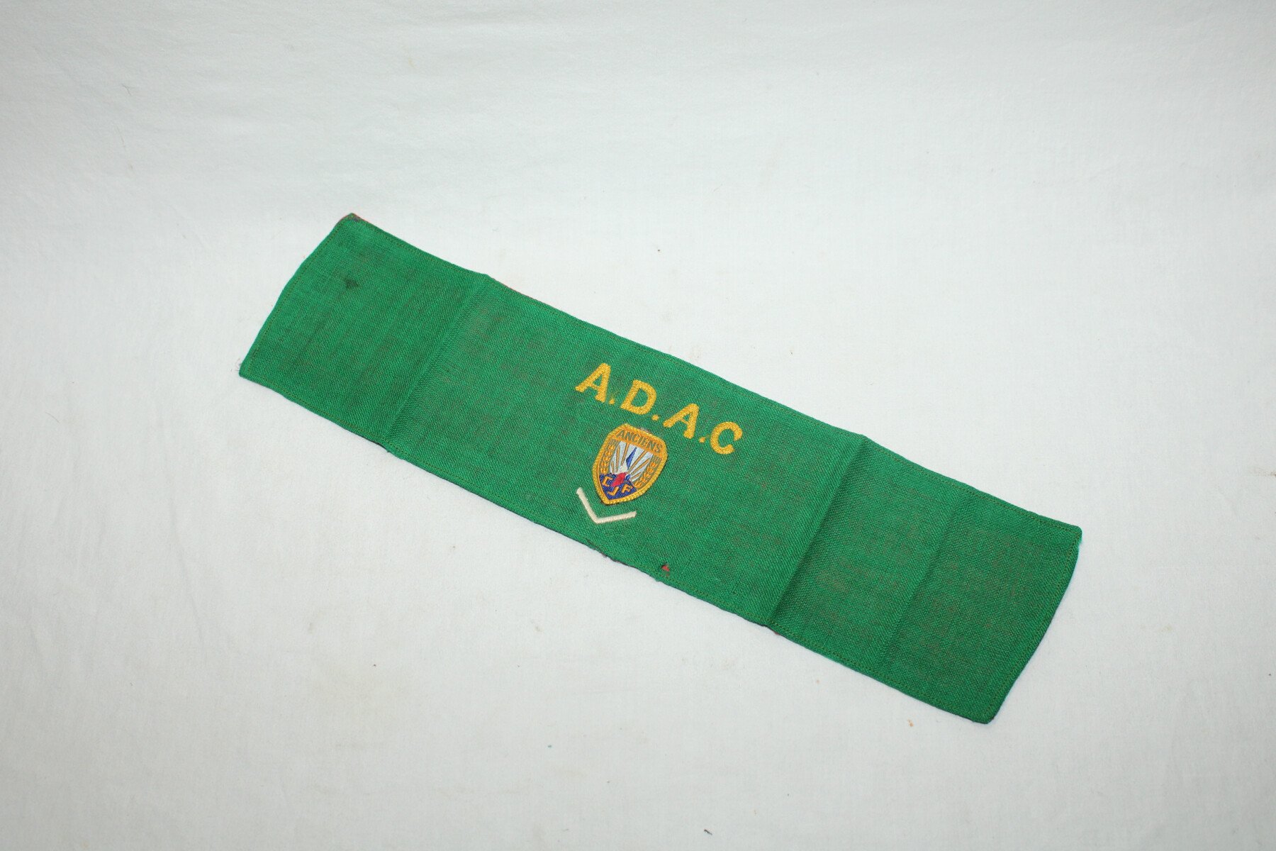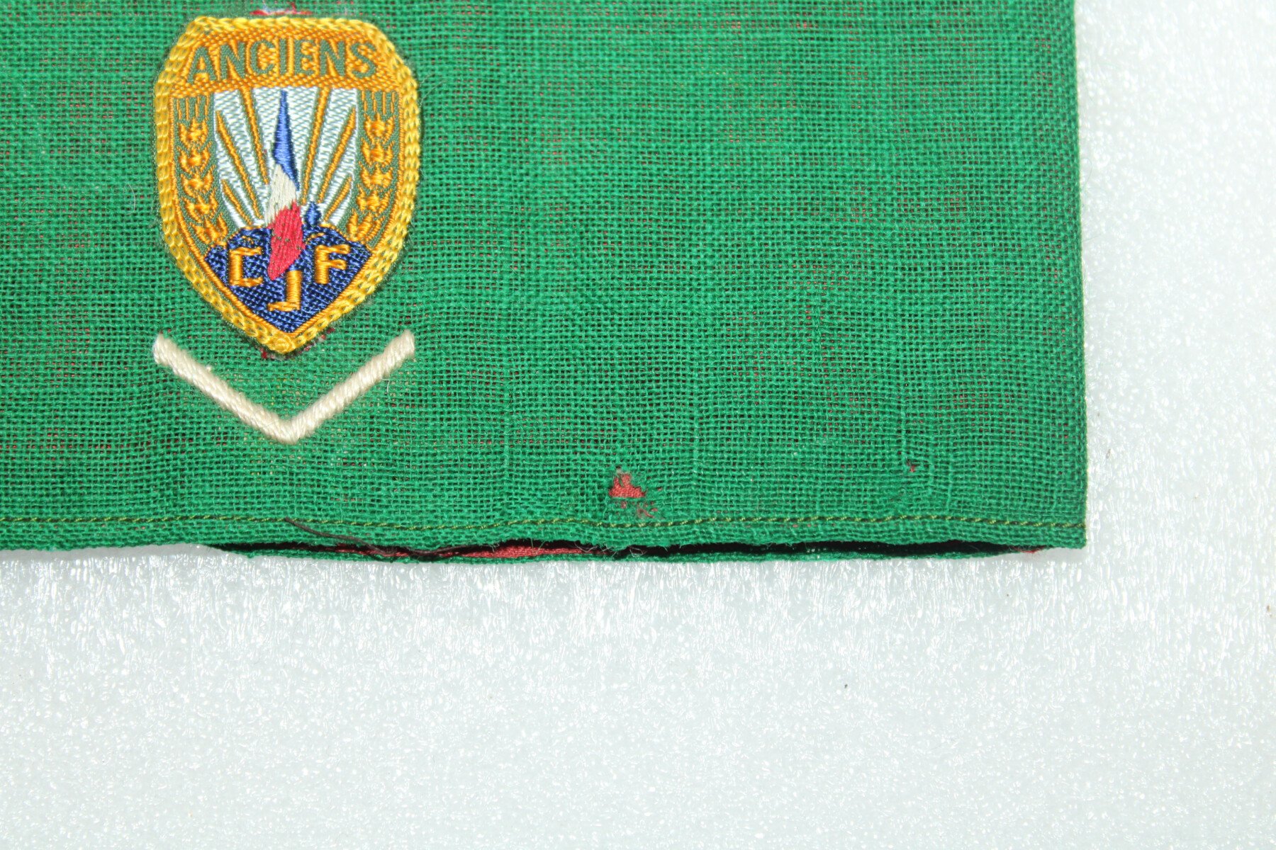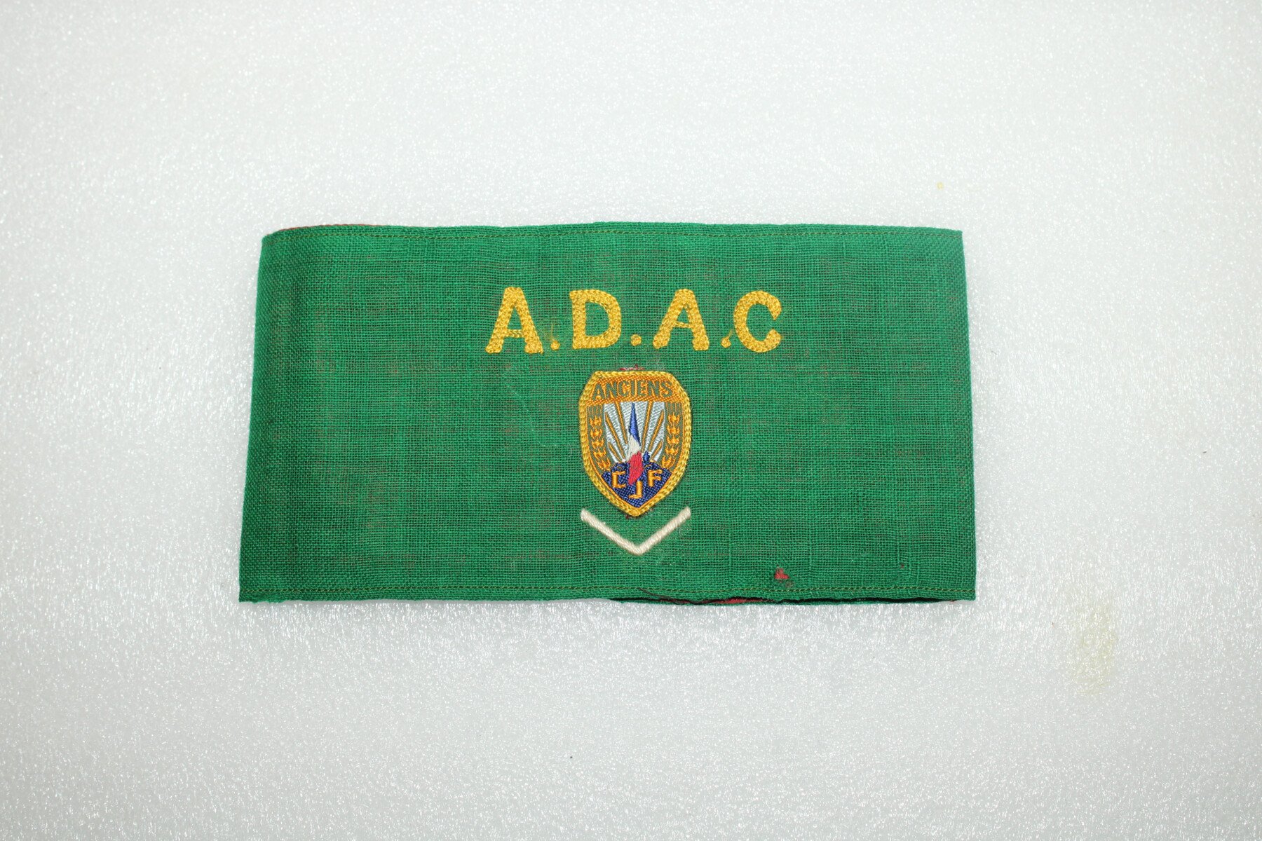 Brassard de l'association des anciens des chantiers de jeunesses. Fabrication brodés, un grade sous l'insigne. Un petit trou dans le vert.