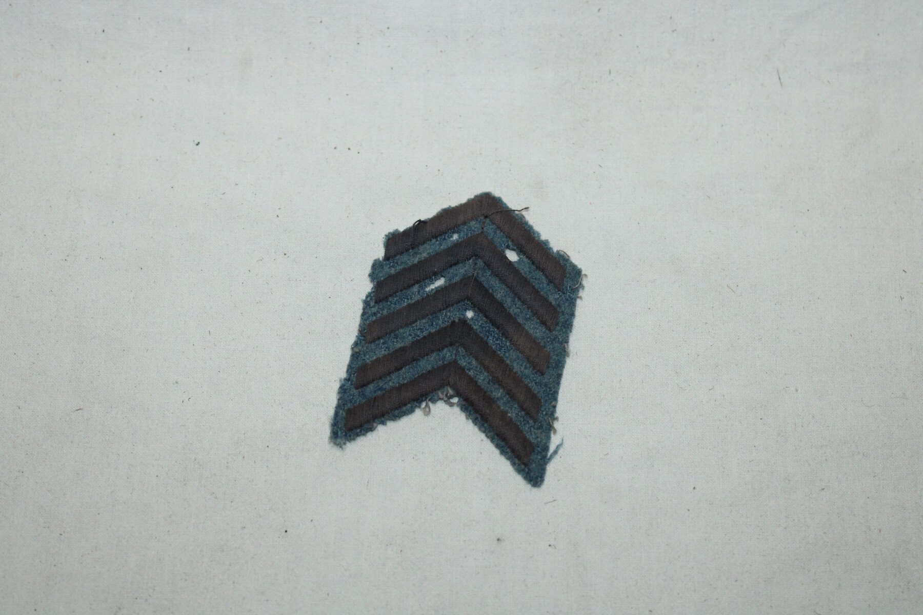 5 chevron de présence au front monté sur laine bleu horizon. Plusieurs trous dans la laine.