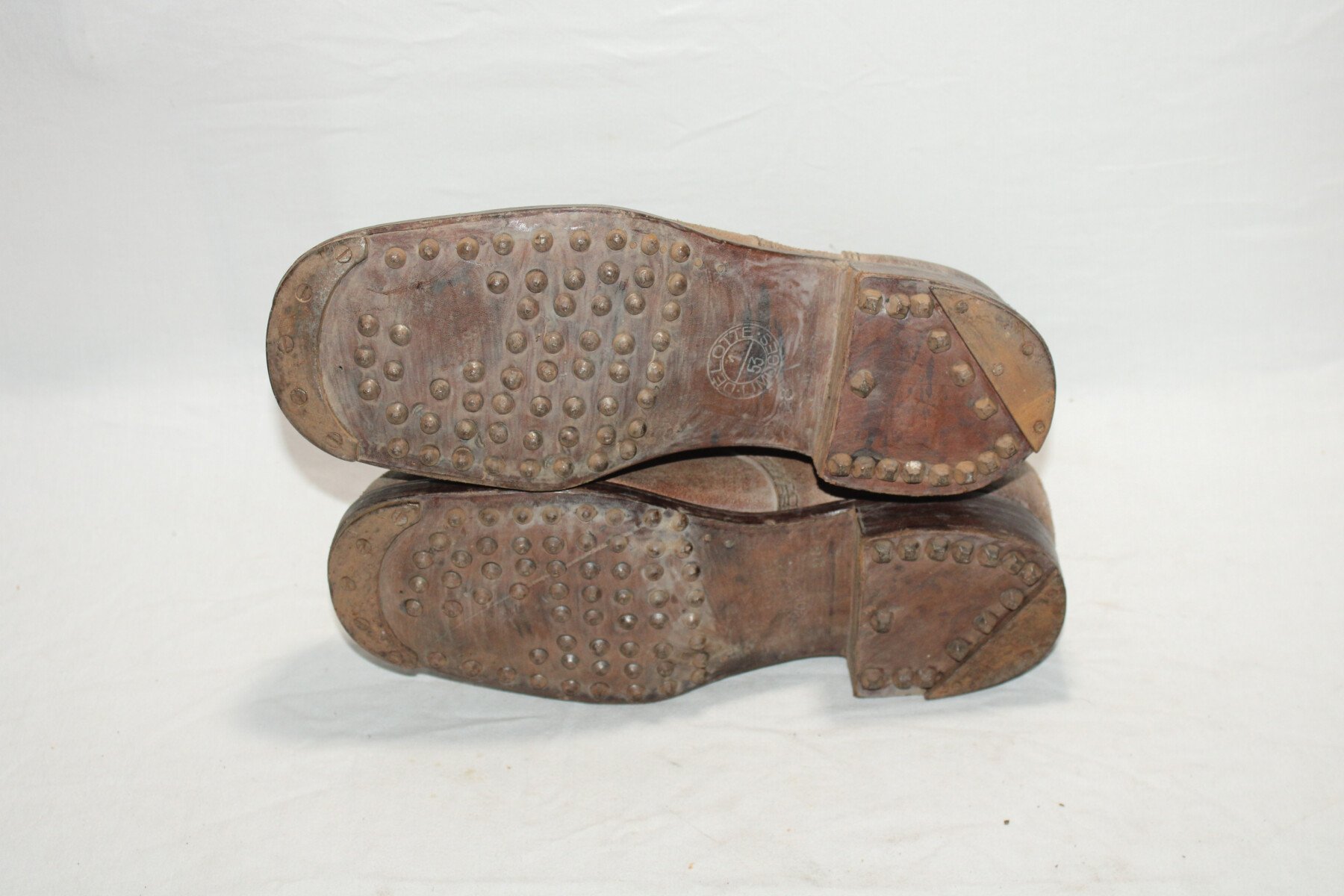 Paires de brodequins modèle 1945. Paires neuves de stock. Taille 28 soit 42. datée 1eme trimestre 1953. Utilisable après graissage. Marqué 1er ER1 a l'intérieur.