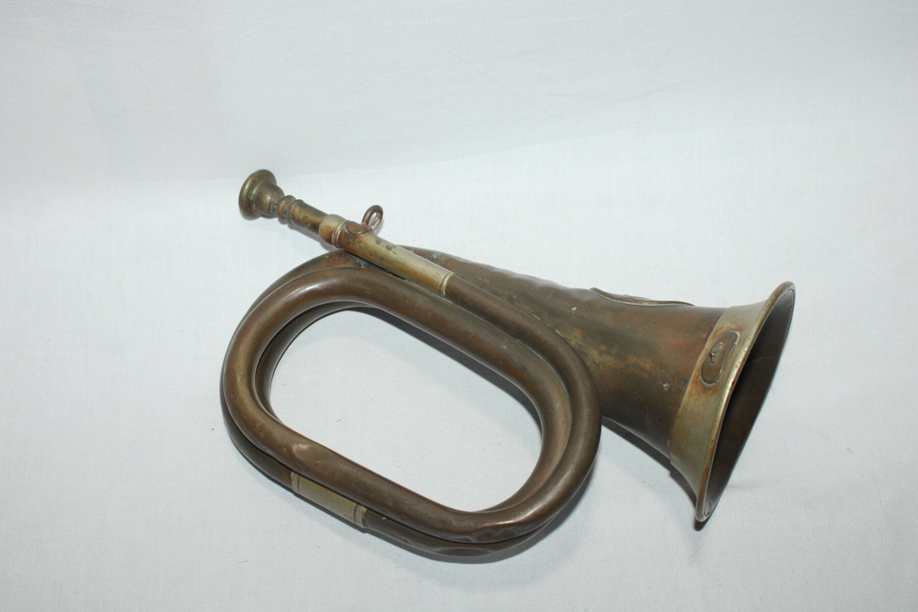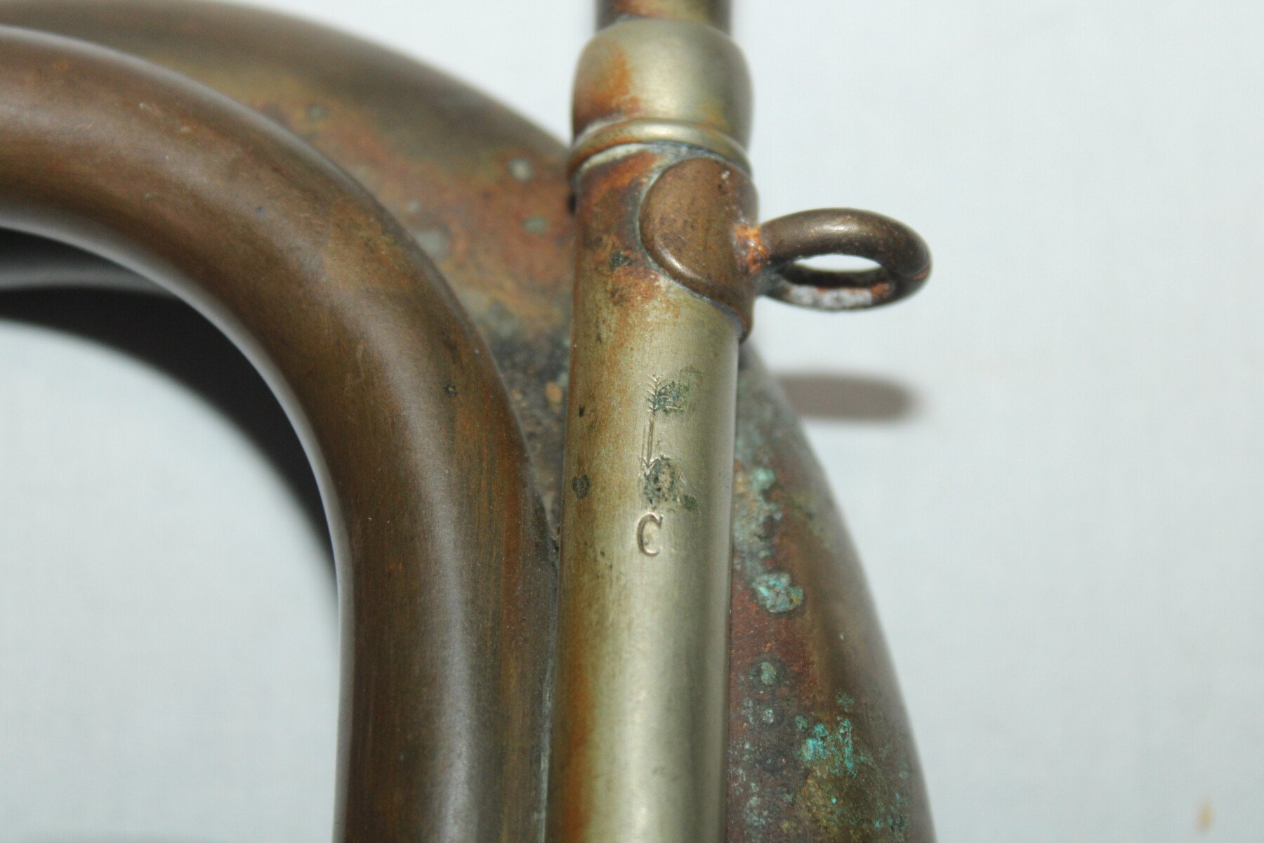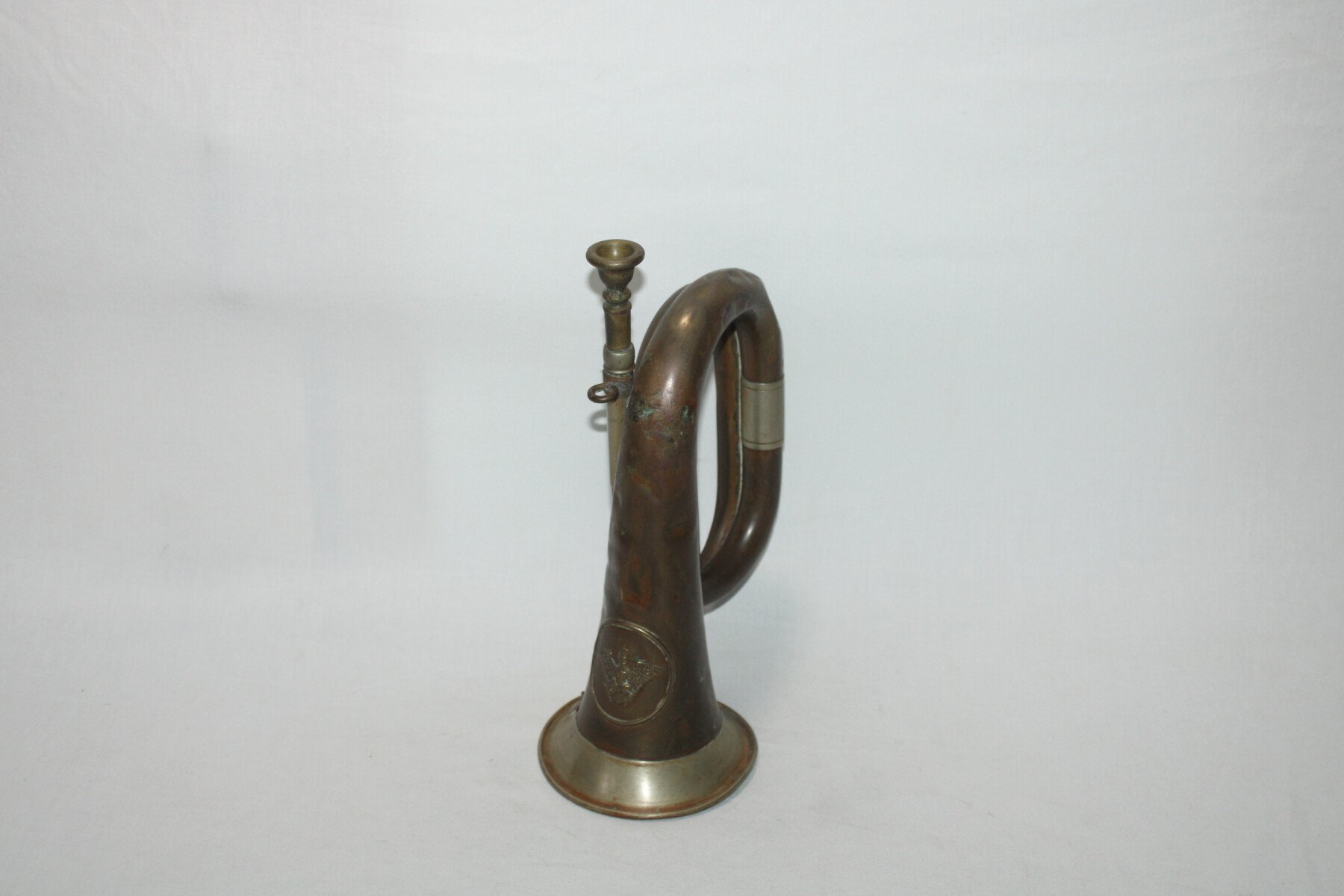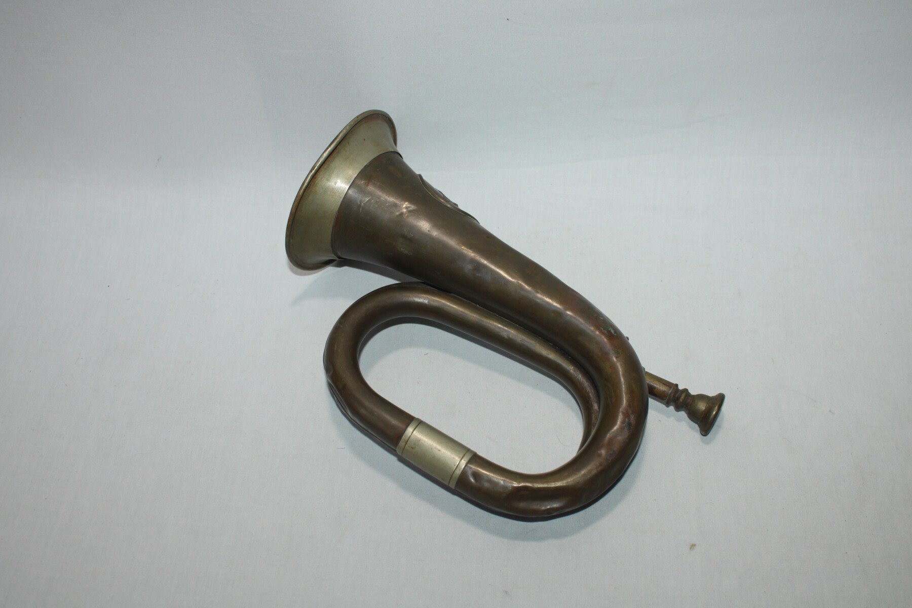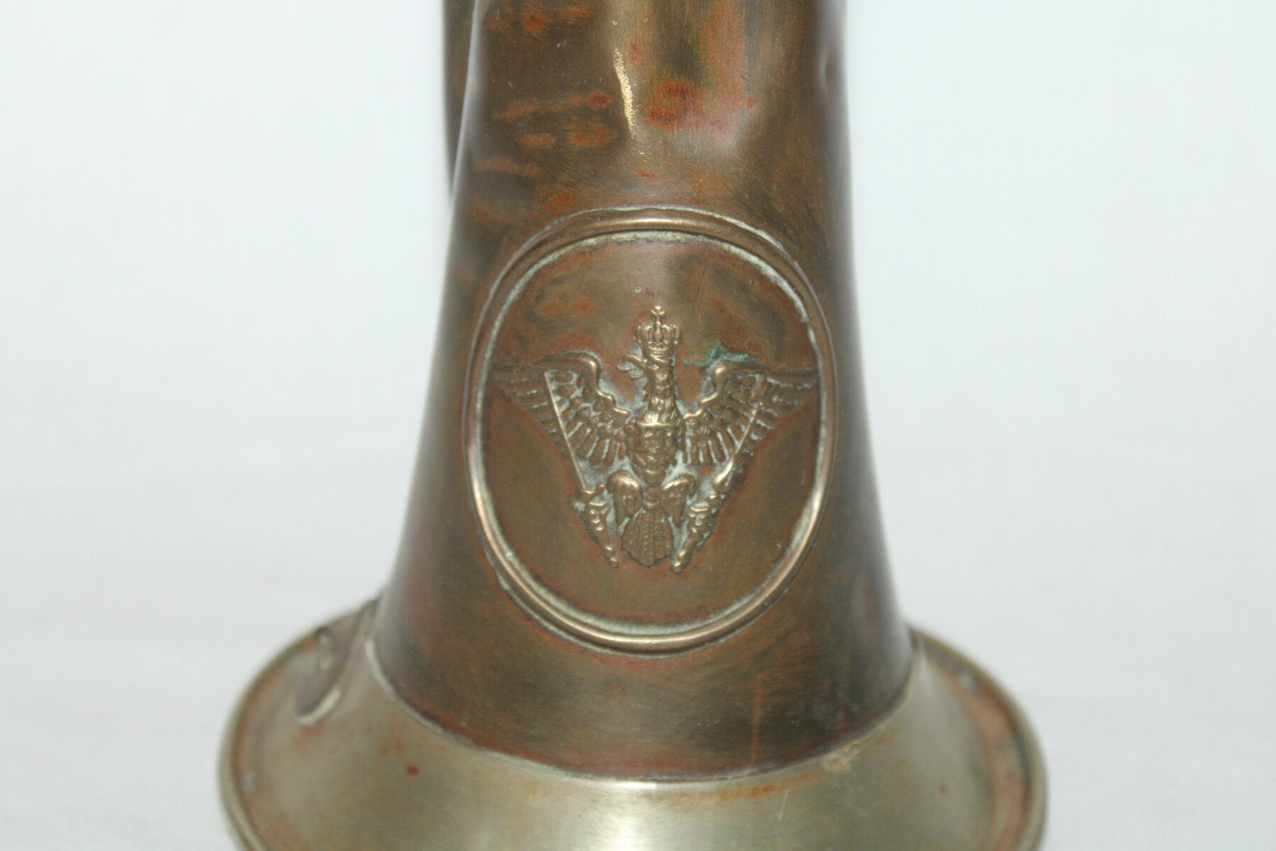 Petit bugle prussien. Cabossé à plusieurs endroits mais complet. 27cm de haut.