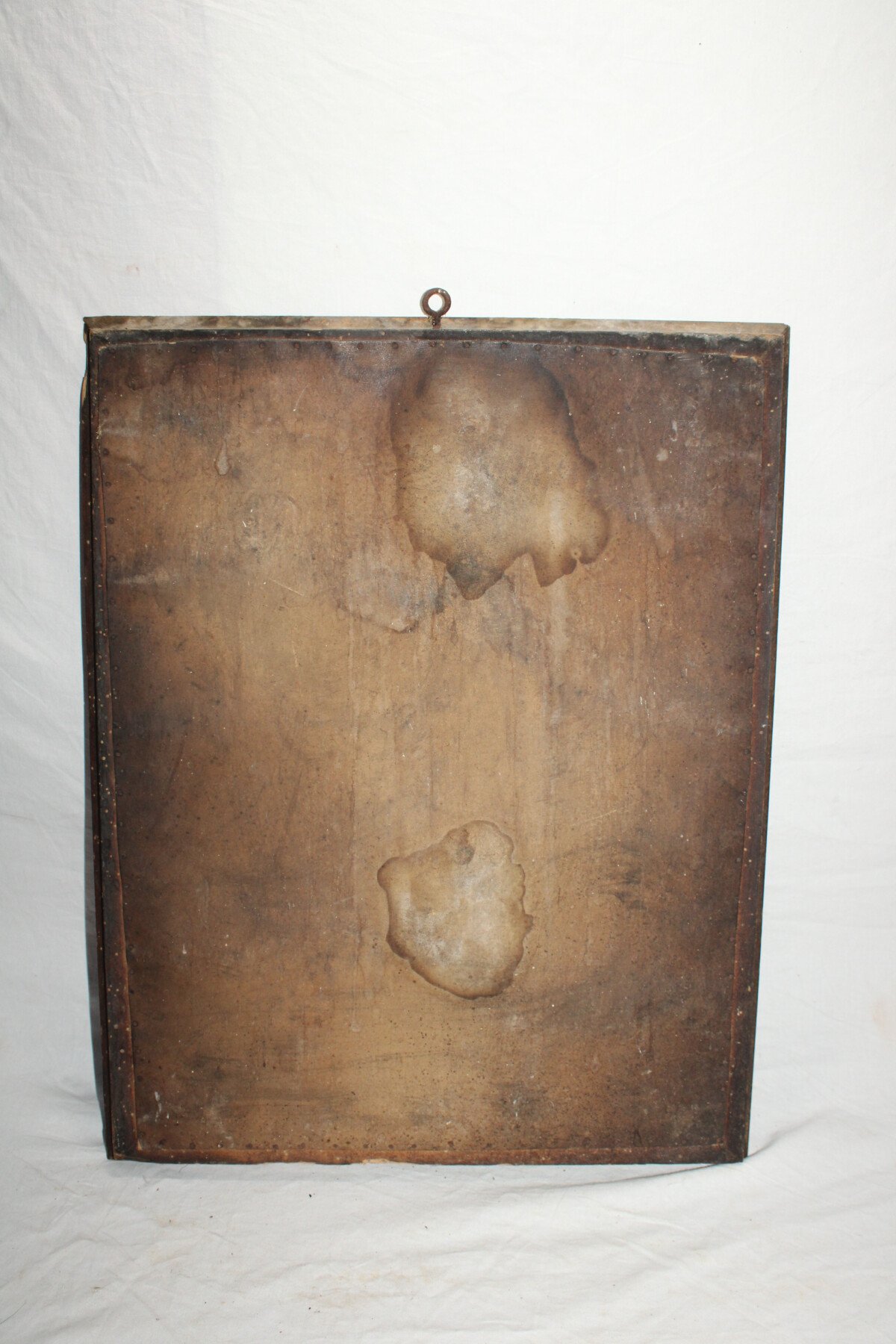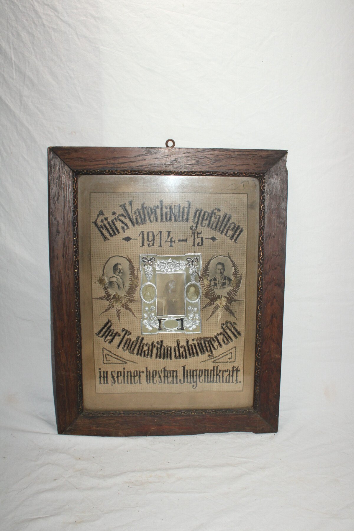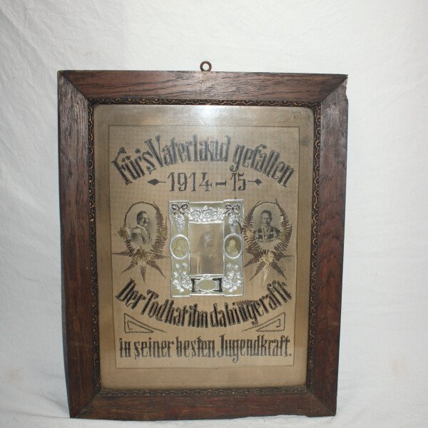 Cadre souvenir de service militaire en Allemagne en 1914-15. Le portrait photographique du conscrit est fixé sur un tissus brodé entouré de drapeaux et surmonté d'un portrait de Guillaume II. Dimensions du cadre 56X44CM.