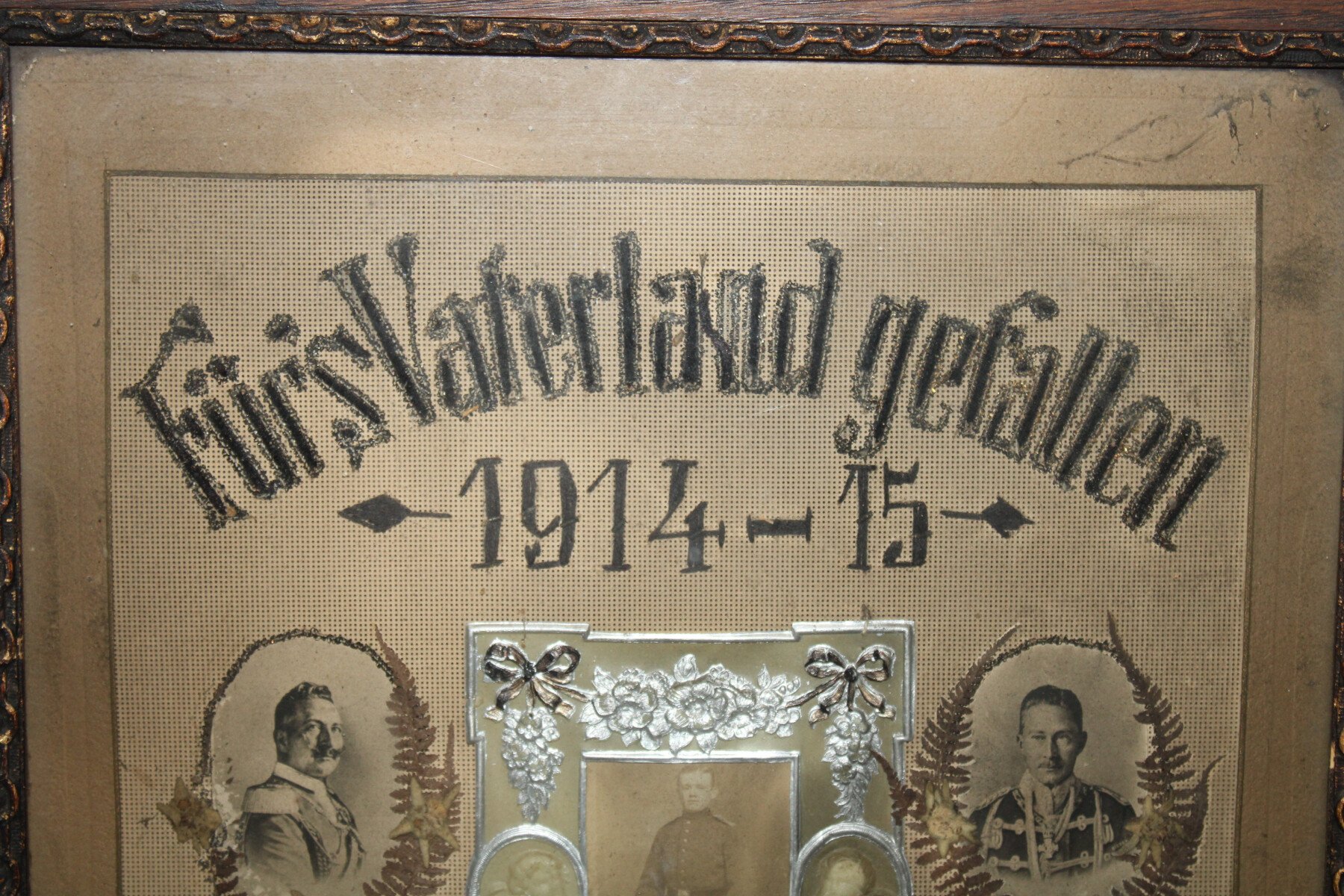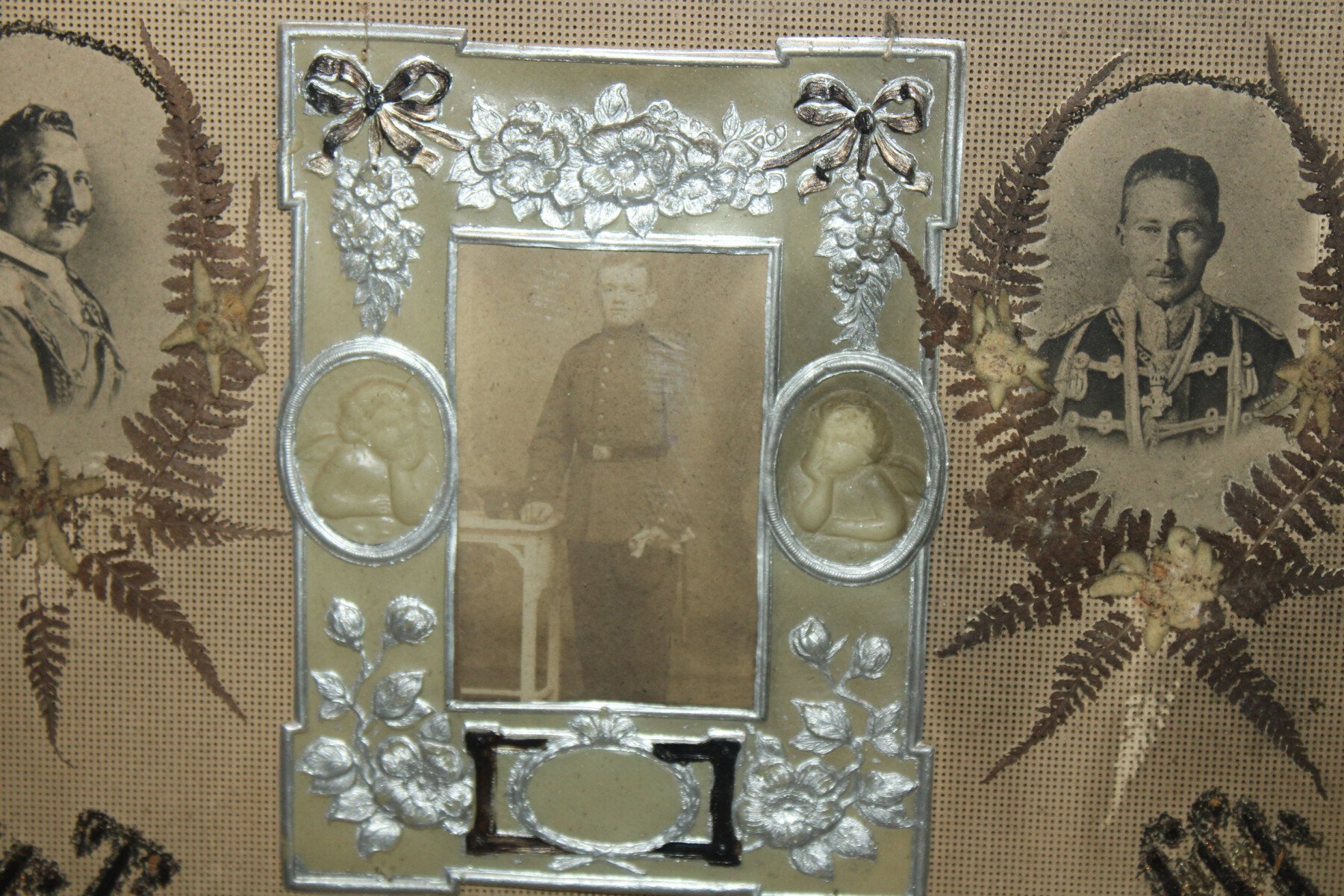 Cadre souvenir de service militaire en Allemagne en 1914-15. Le portrait photographique du conscrit est fixé sur un tissus brodé entouré de drapeaux et surmonté d'un portrait de Guillaume II....