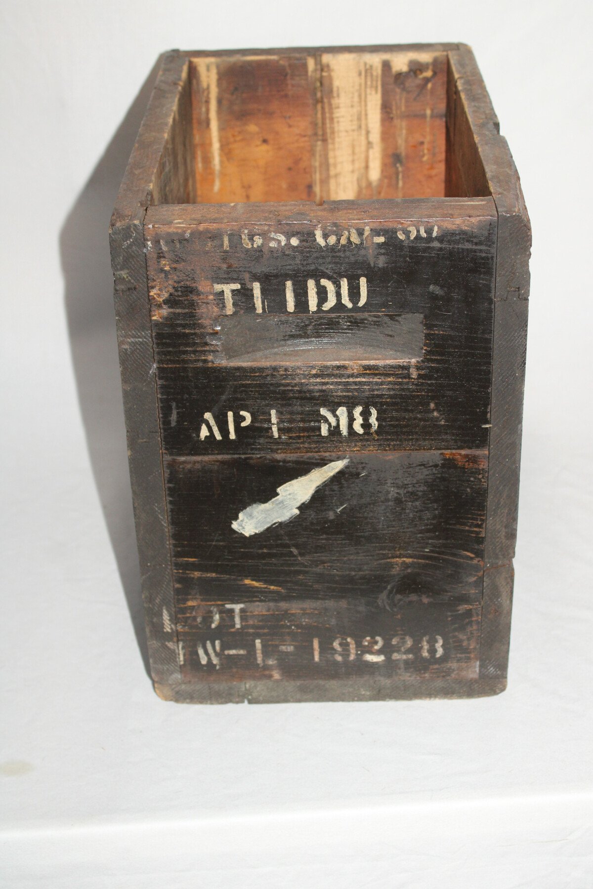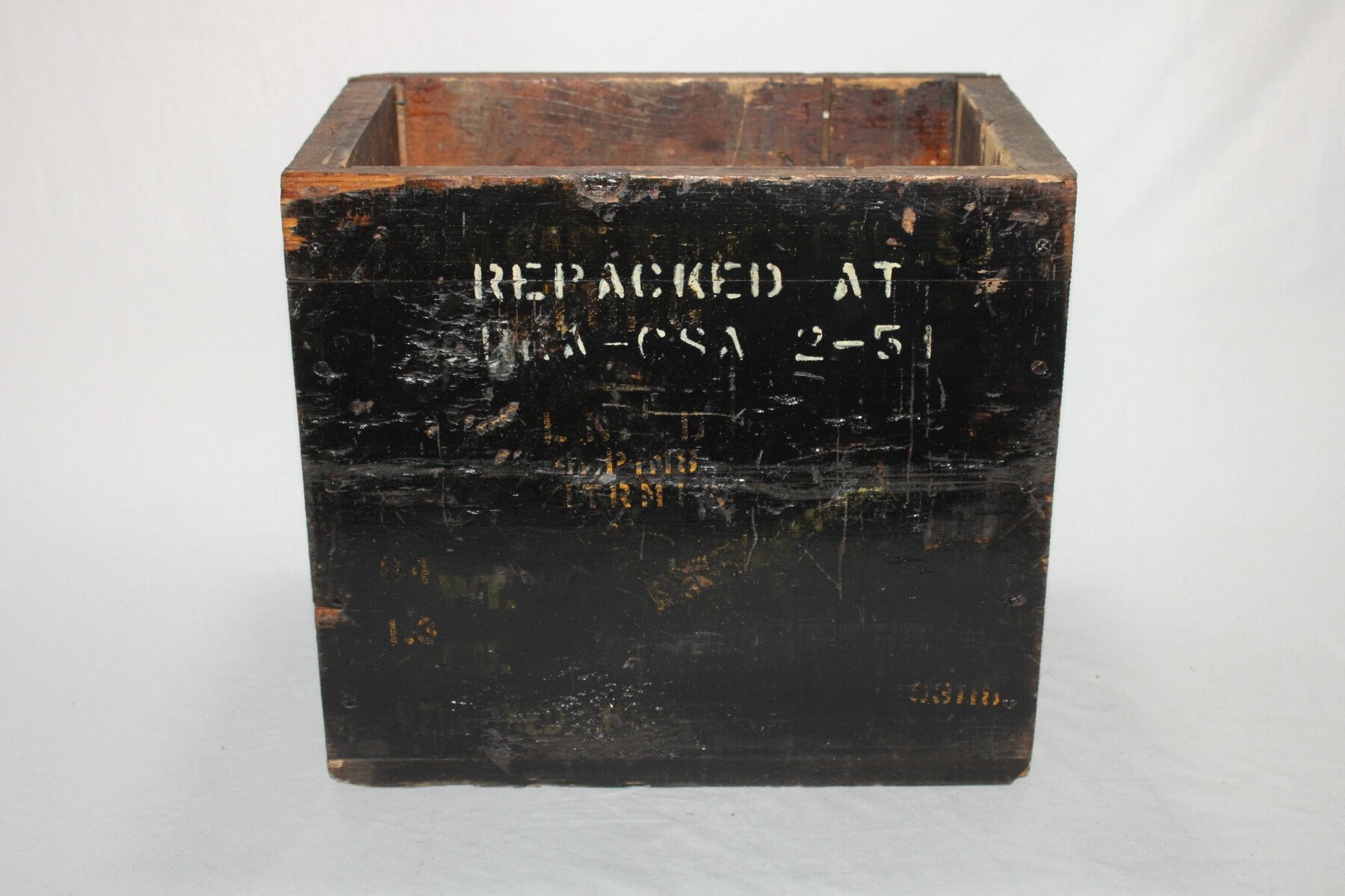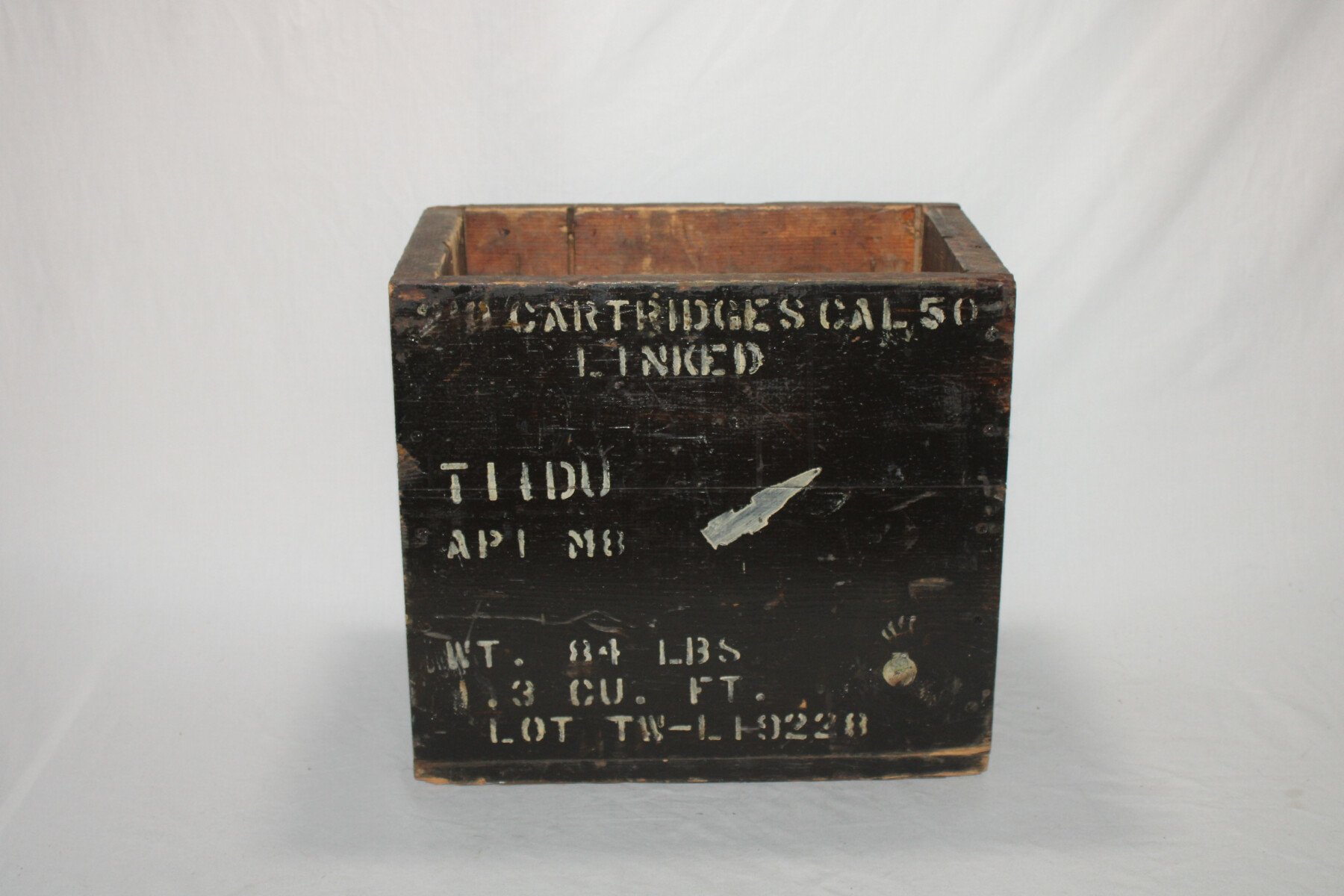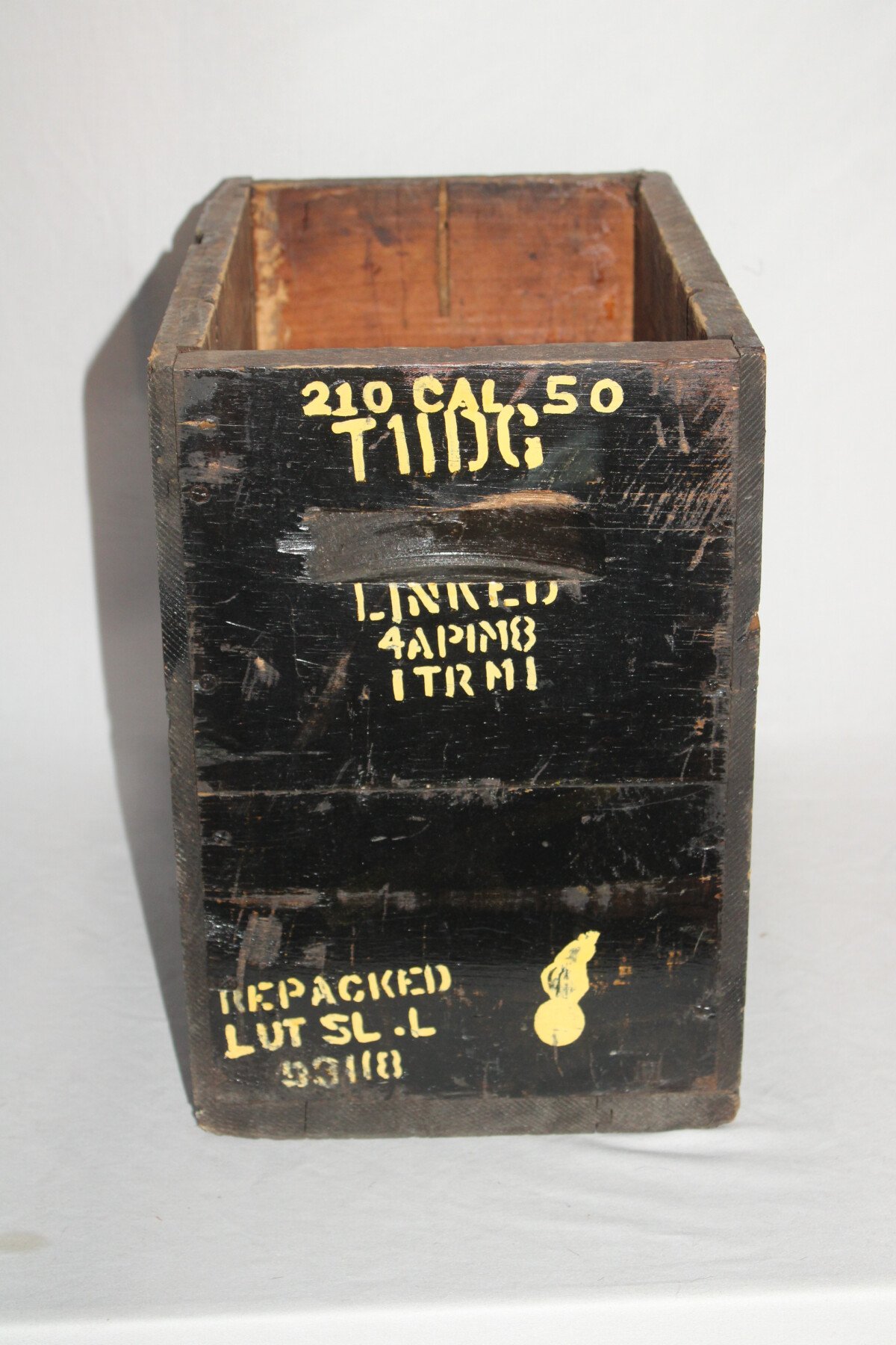Caisse en bois pour 210 cartouches de calibre 50. Couvercle absent. Réutilisé en 1951. Marquage jaune secondes guerre visible sous la peinture. Bois saint.
