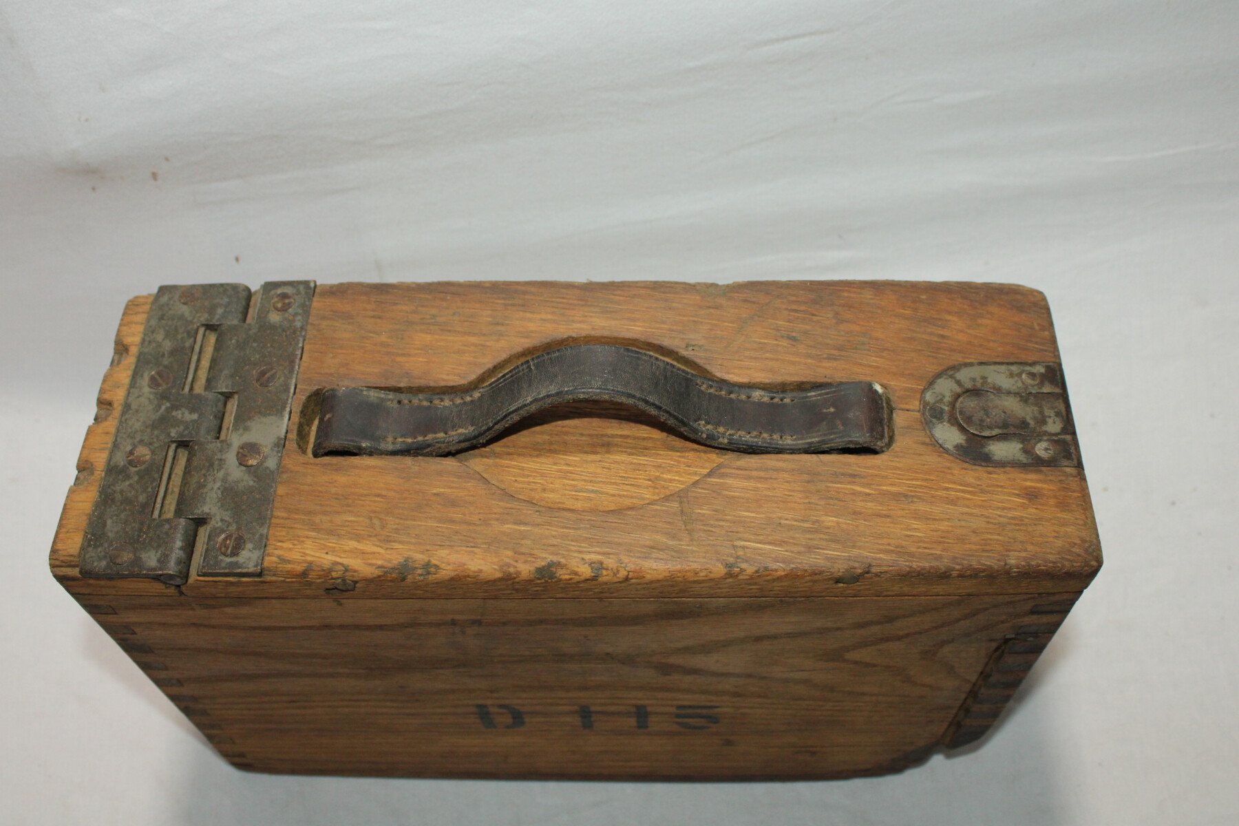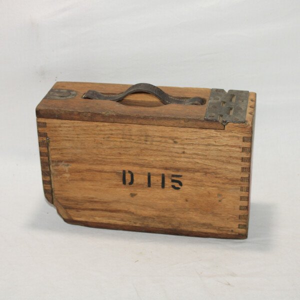 Caisse en bois pour bande de mitrailleuse de calibre.30.Poignée en cuir, souple. Marqué D115 a plusieurs endroits et US. Pas de date visible.