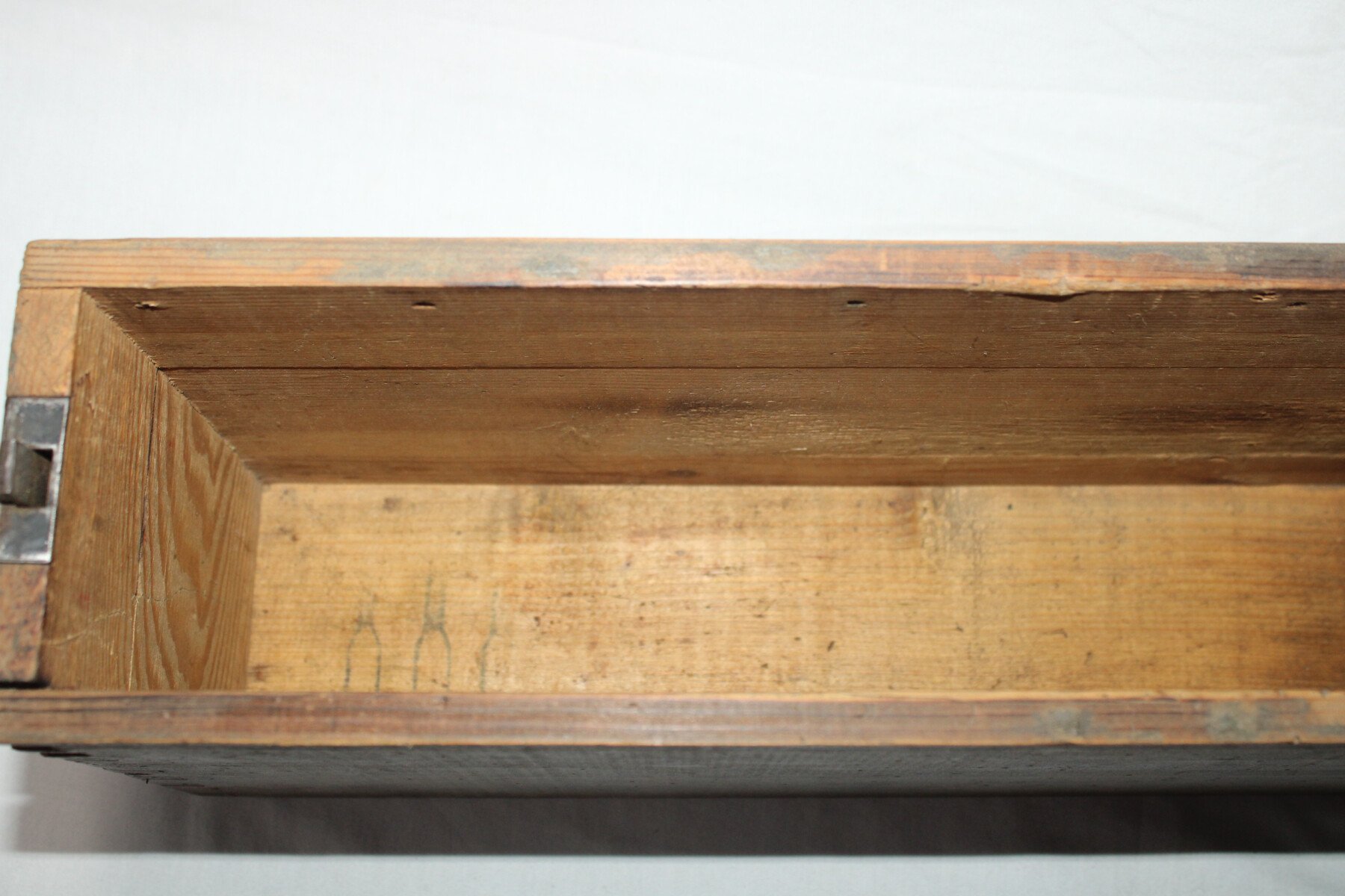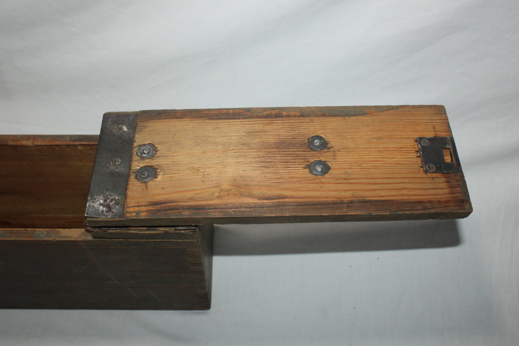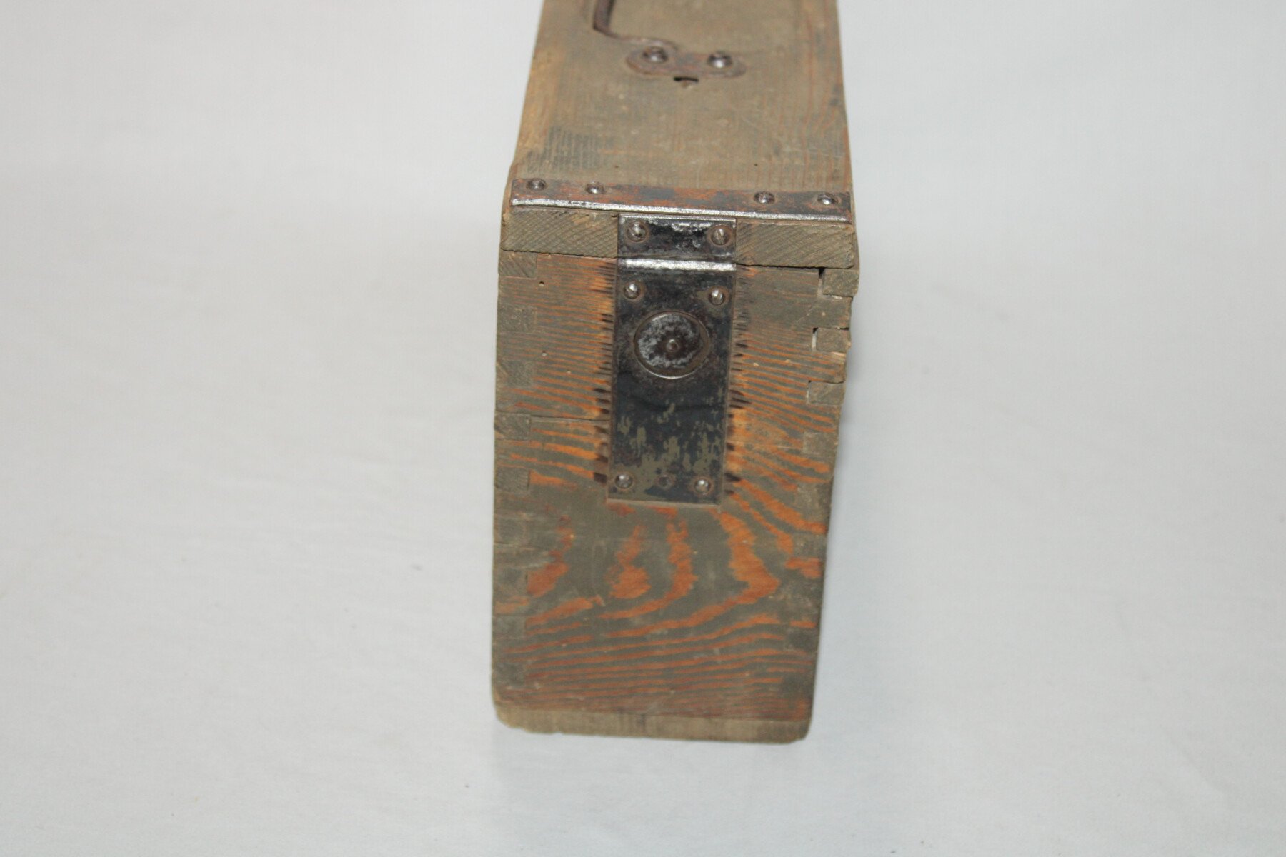 Belle caisse en bois pour bande de mitrailleuse MG 08, marquages internes, poignée de transport en métal en bon état. Date peu lisible.