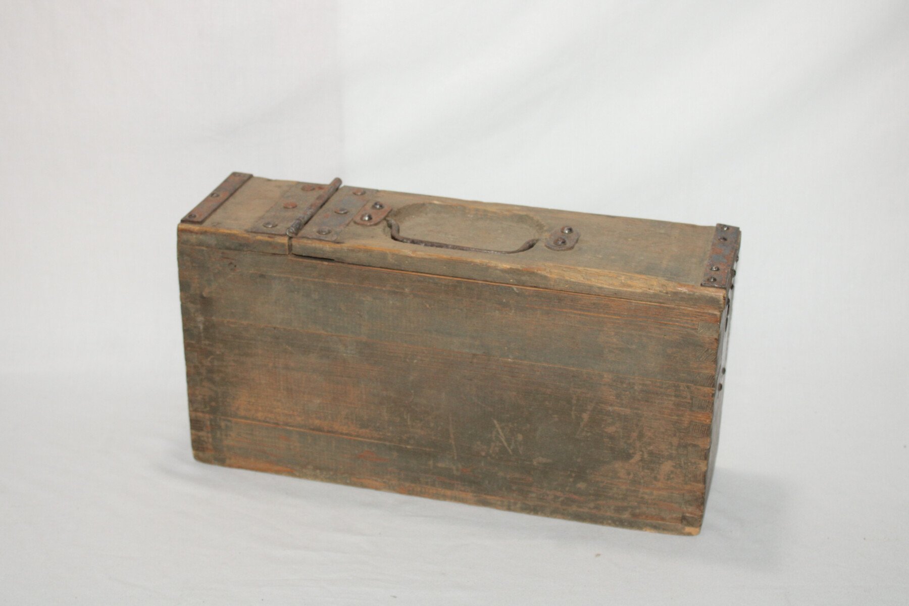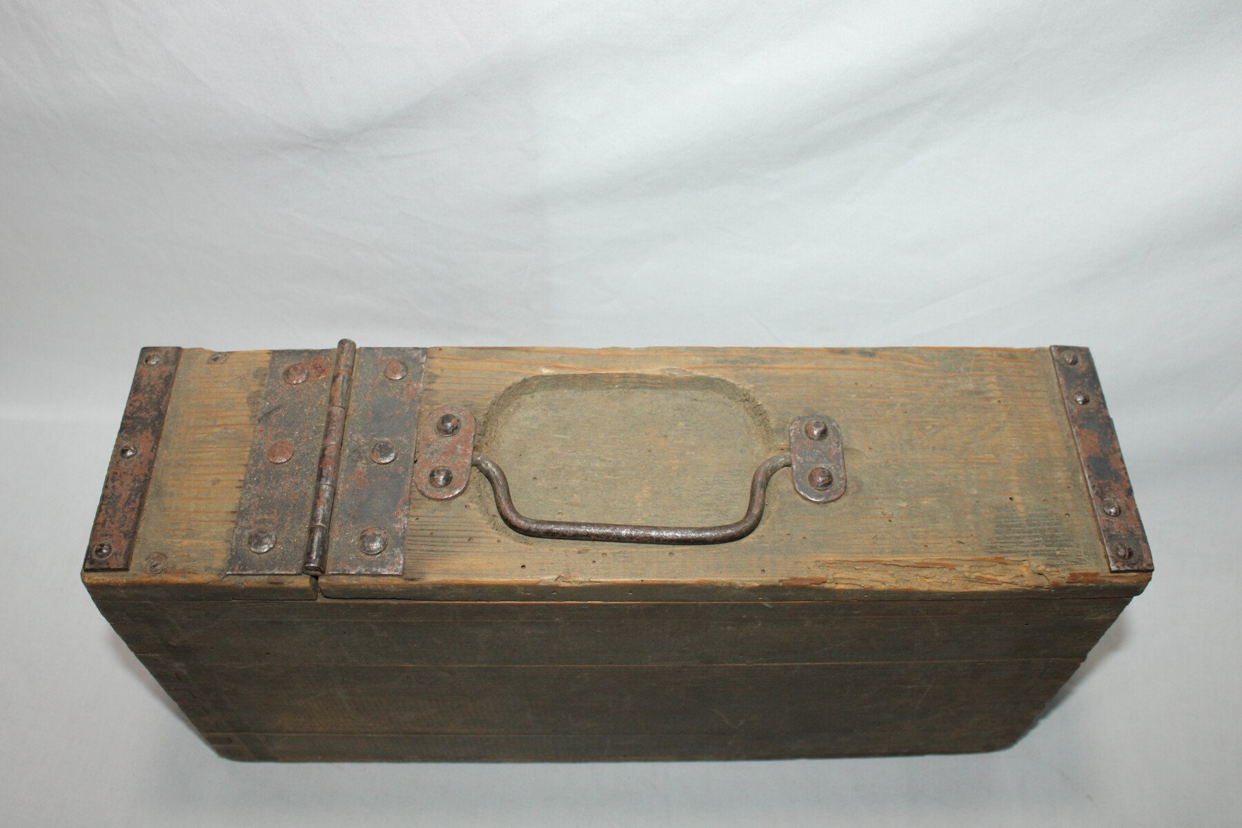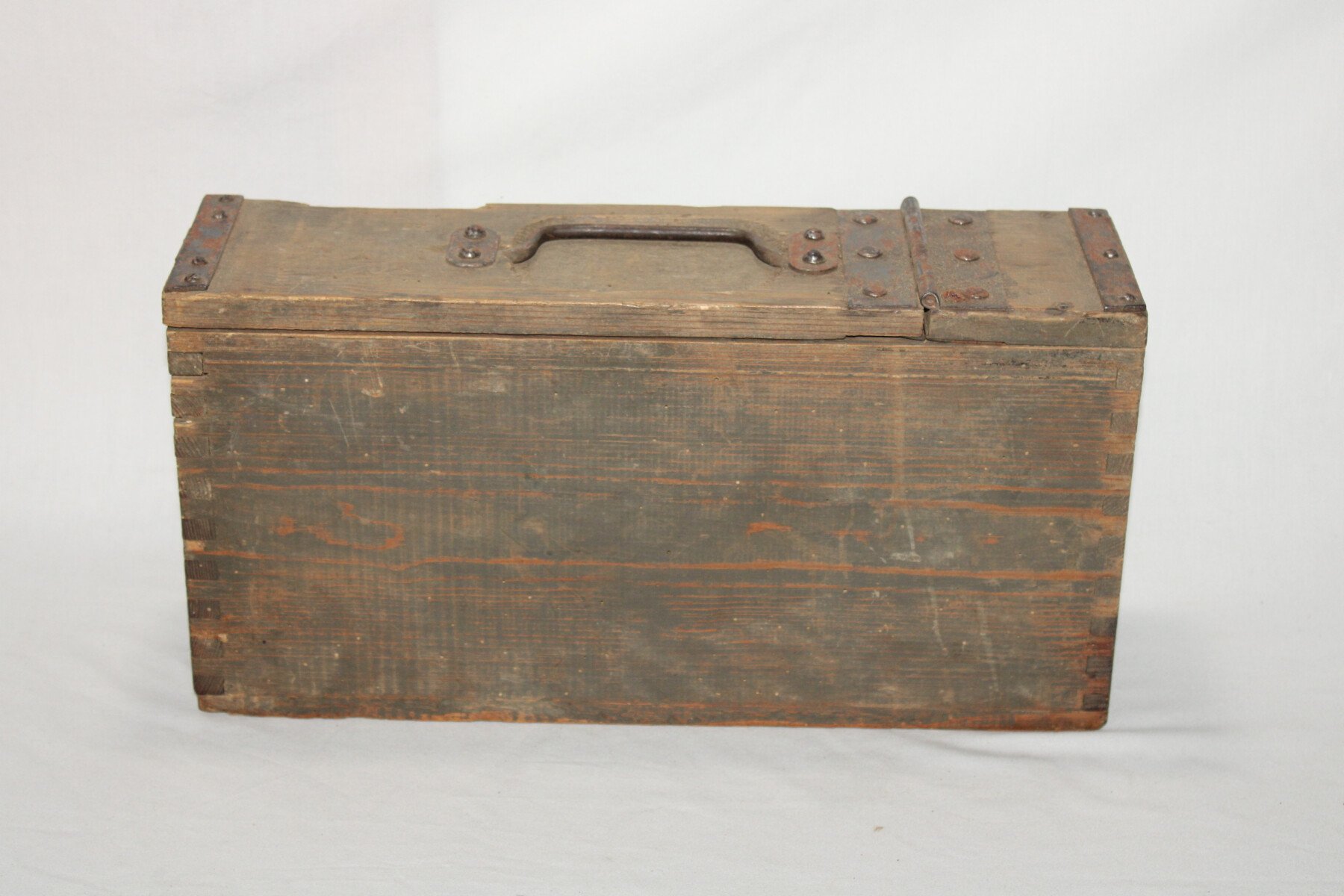 Belle caisse en bois pour bande de mitrailleuse MG 08, marquages internes, poignée de transport en métal en bon état. Date peu lisible.